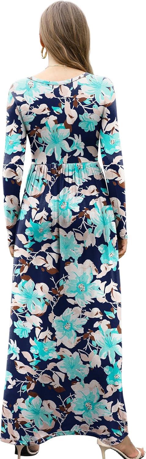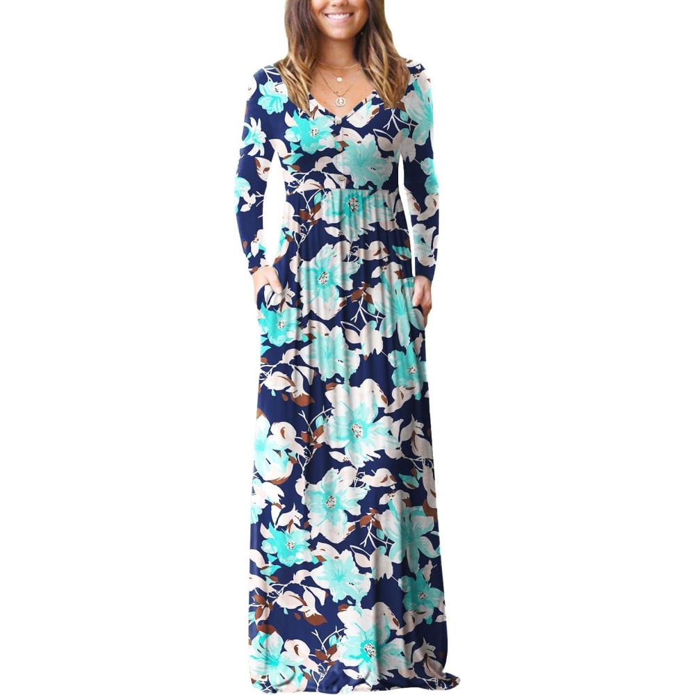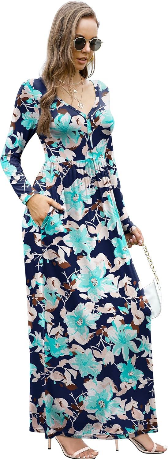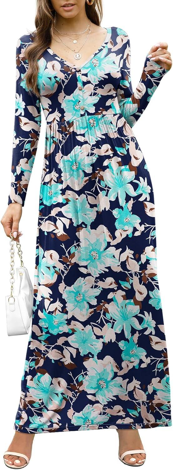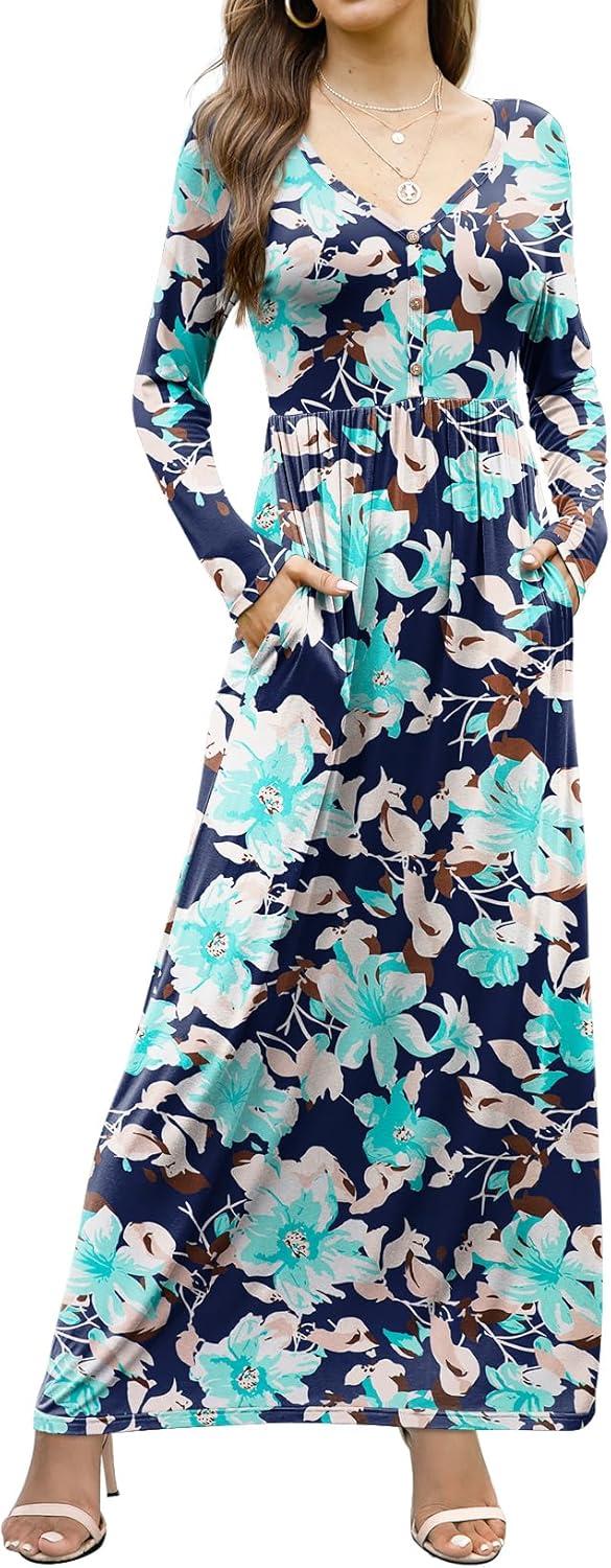 GRECERELLE Womens Long Sleeve V Neck Casual Button Maxi Dress 2025 with Pockets(White Ink Blue)