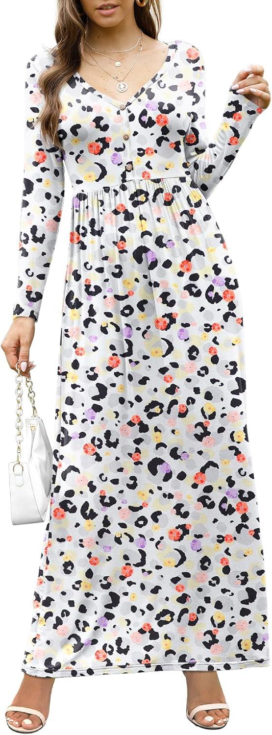 GRECERELLE Womens Long Sleeve V Neck Casual Button Maxi Dress 2025 with Pockets(White Periwinkle)