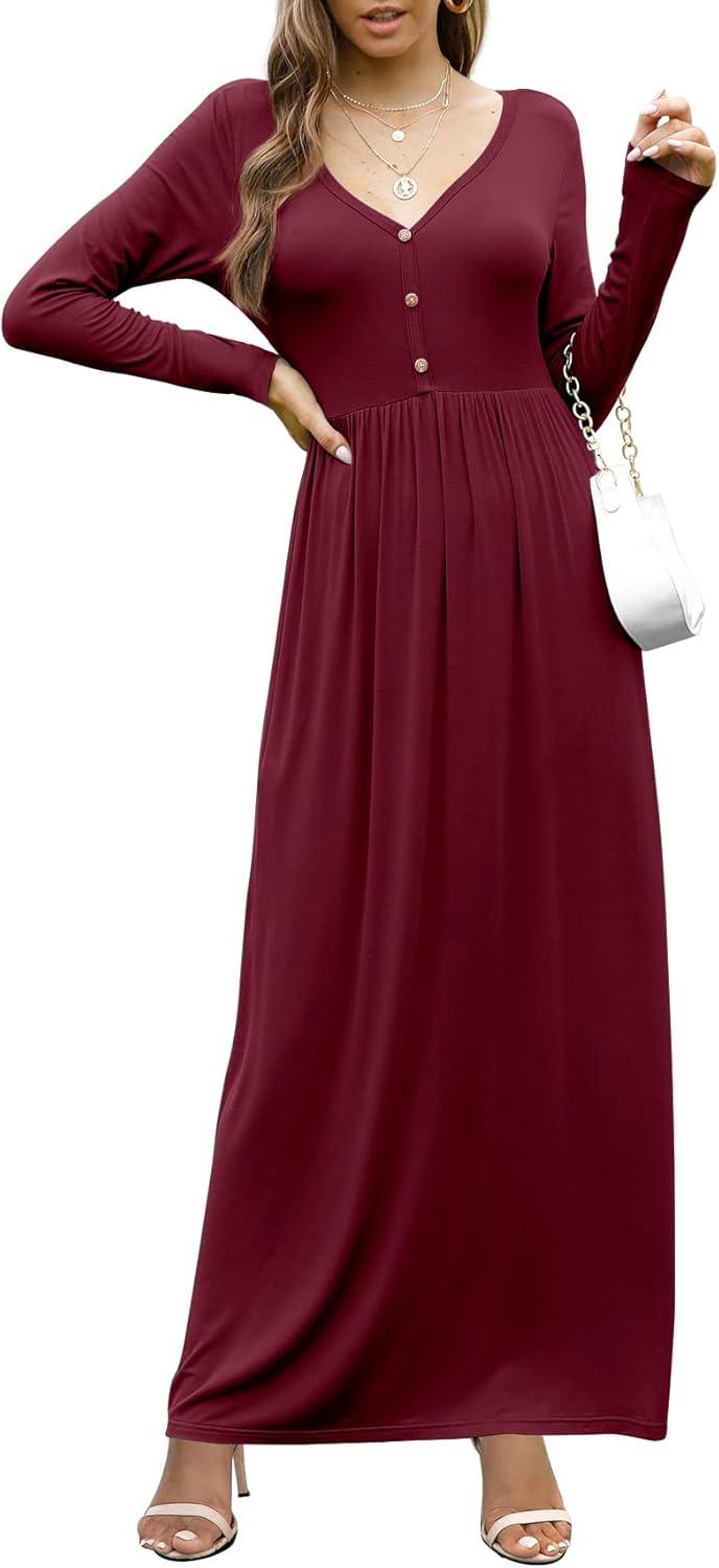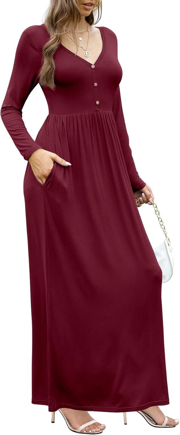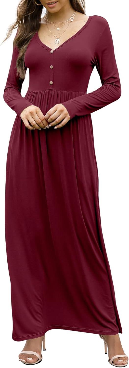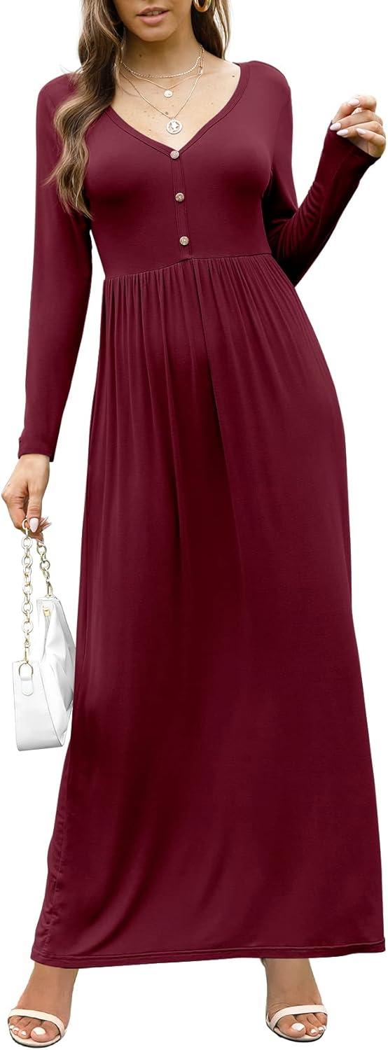 GRECERELLE Womens Long Sleeve V Neck Casual Button Maxi Dress 2025 with Pockets(Wine Red)
