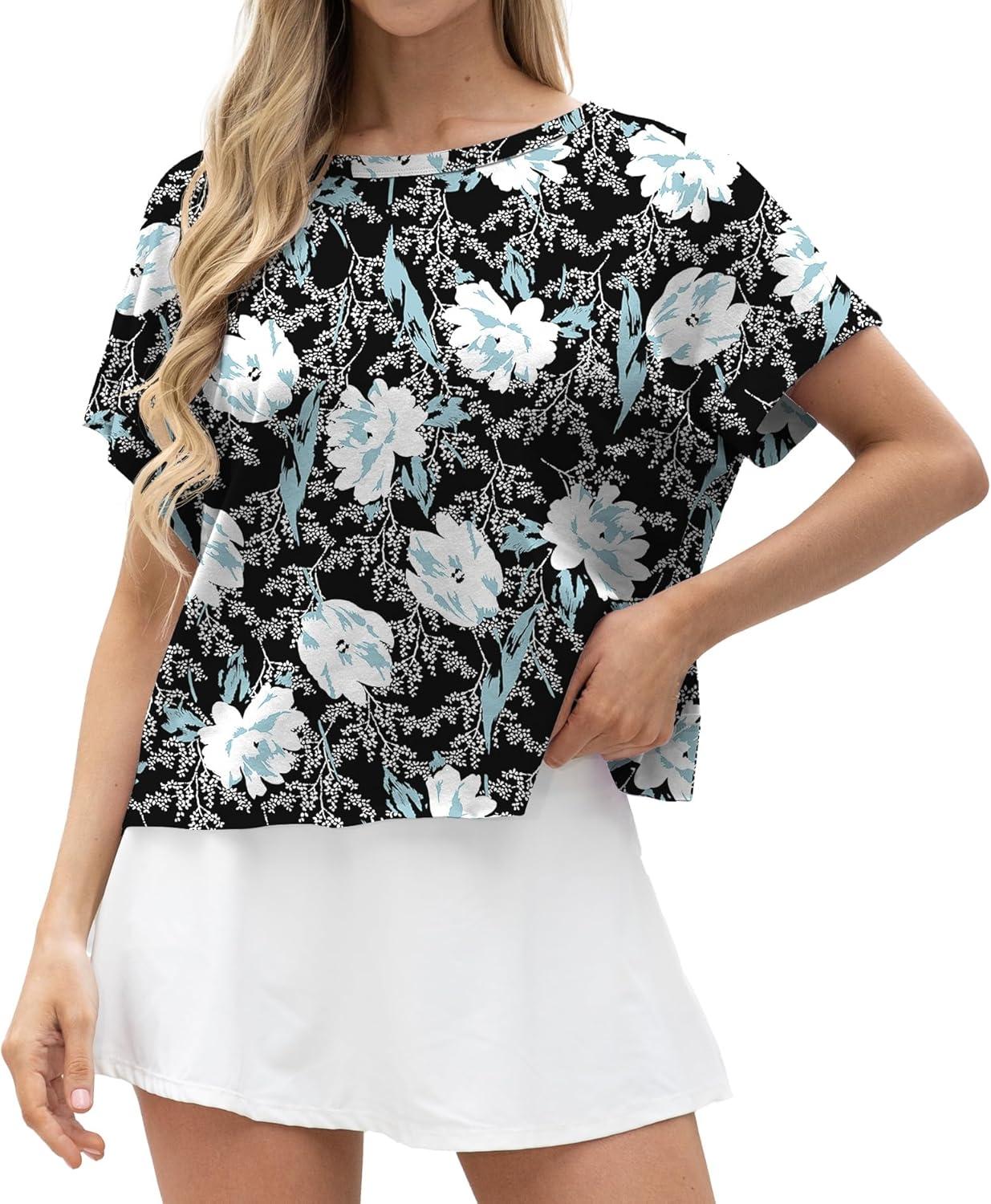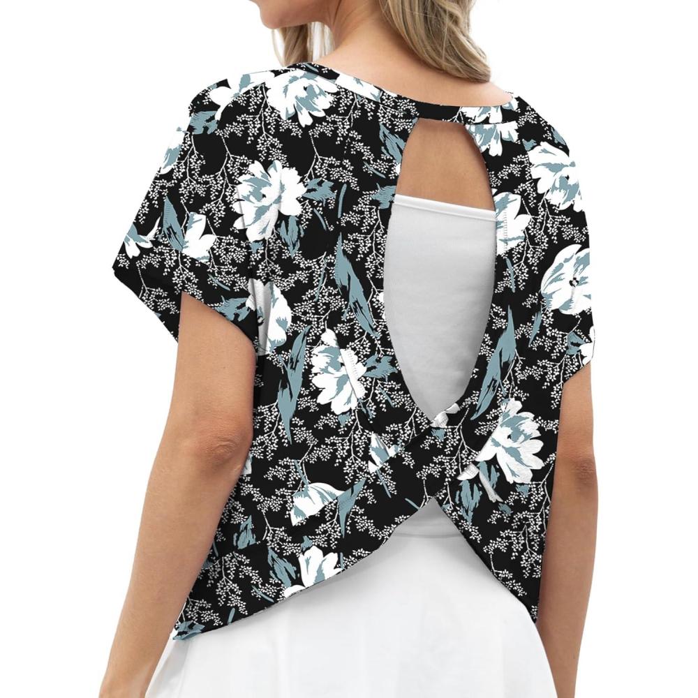 GRECERELLE Women’s Open Back Workout Tops Backless Athletic Shirts Casual Crop Running Tee Y2k Yoga(Black Red Floral)