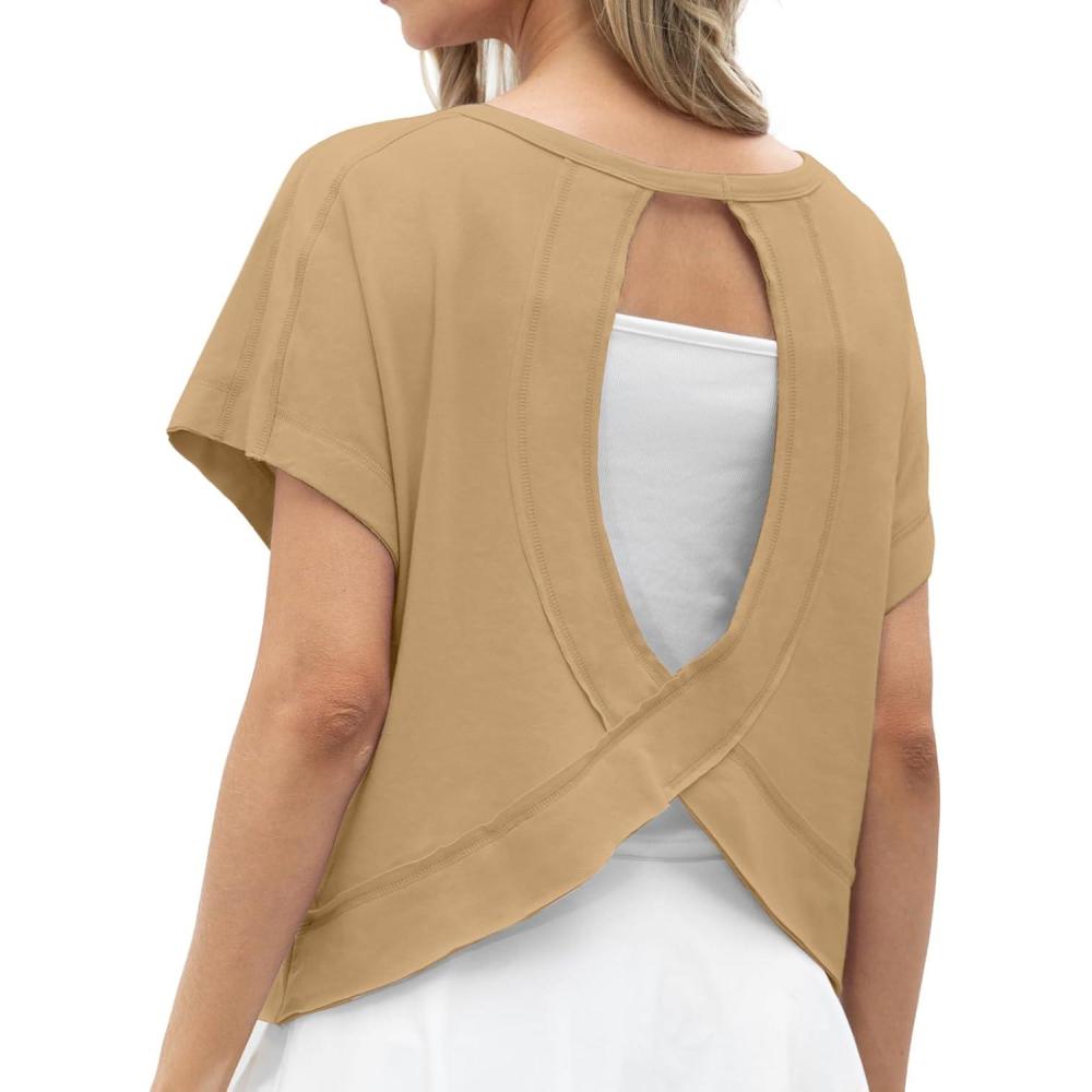 GRECERELLE Women's Open Back Workout Tops Backless Athletic Shirts Casual Crop Running Tee Y2k Yoga(Khaki)