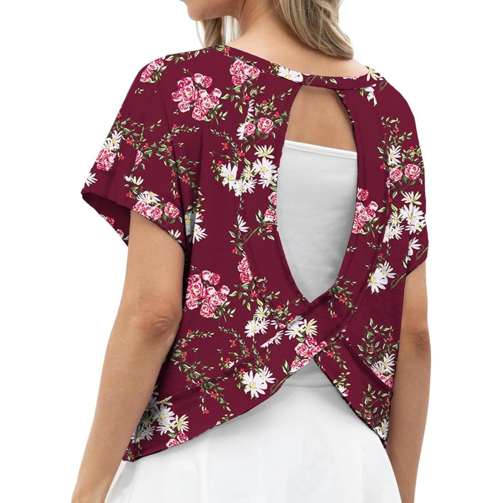 GRECERELLE Women’s Open Back Workout Tops Backless Athletic Shirts Casual Crop Running Tee Y2k Yoga(Lagerstroemia Wine)