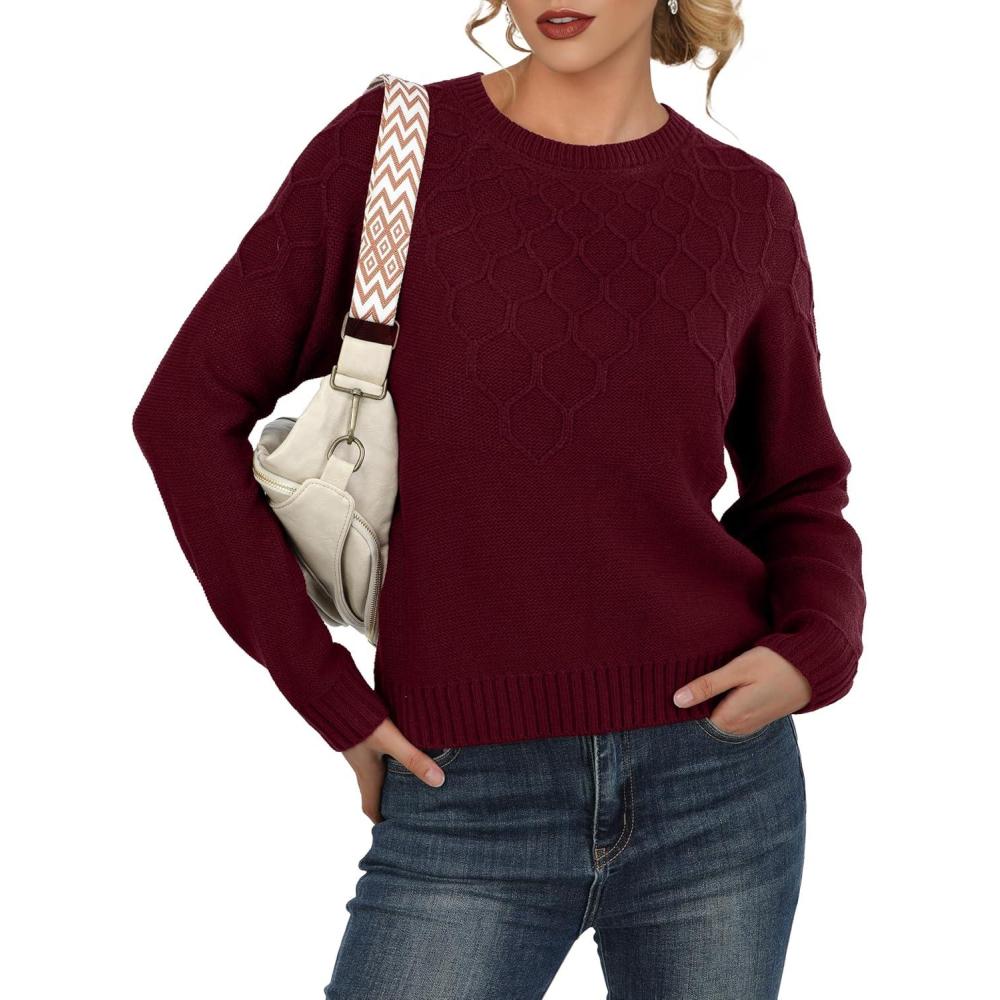 GRECERELLE Women’s Pullover Sweater Chunky Crew Neck Long Sleeve Losse Casual Knit Tops Blouse, S-2XL(Wine Red)