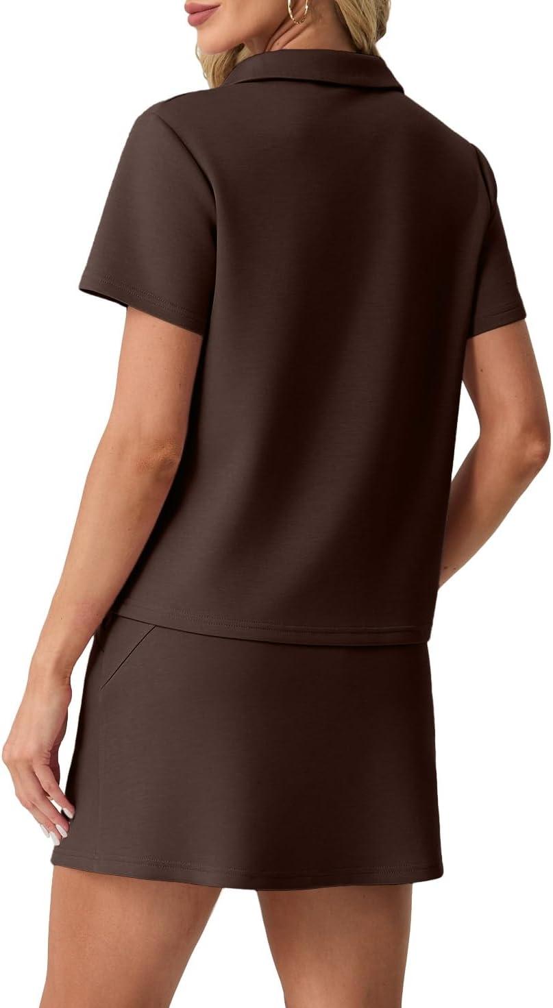 GRECERELLE Women's Summer 2 Piece Skort Set Half Zip Short Sleeve Top & Pocketed Tennis Skirt For Sports & Vacations.(Dark Coffee)