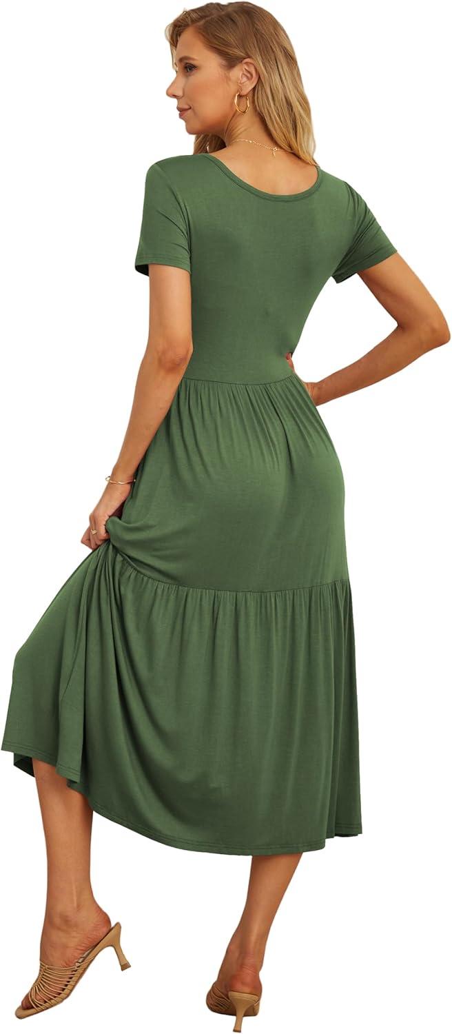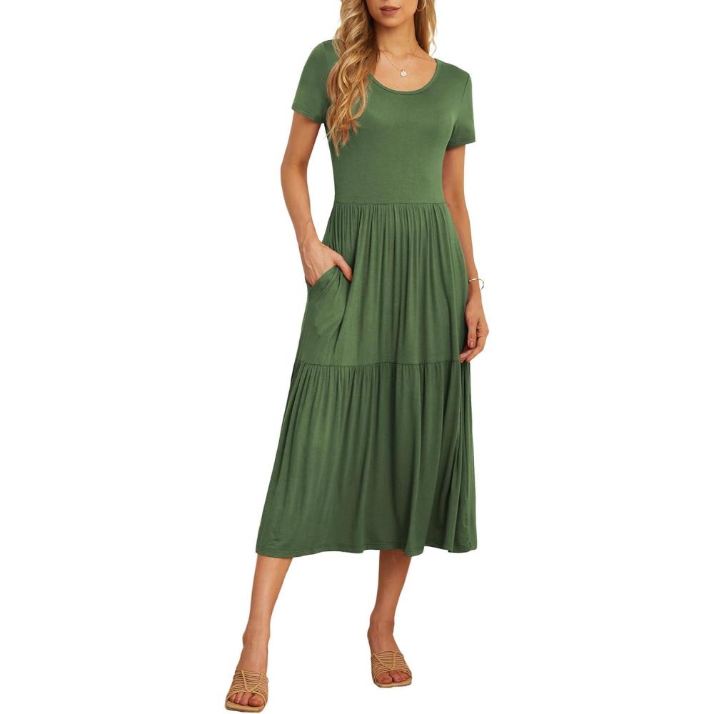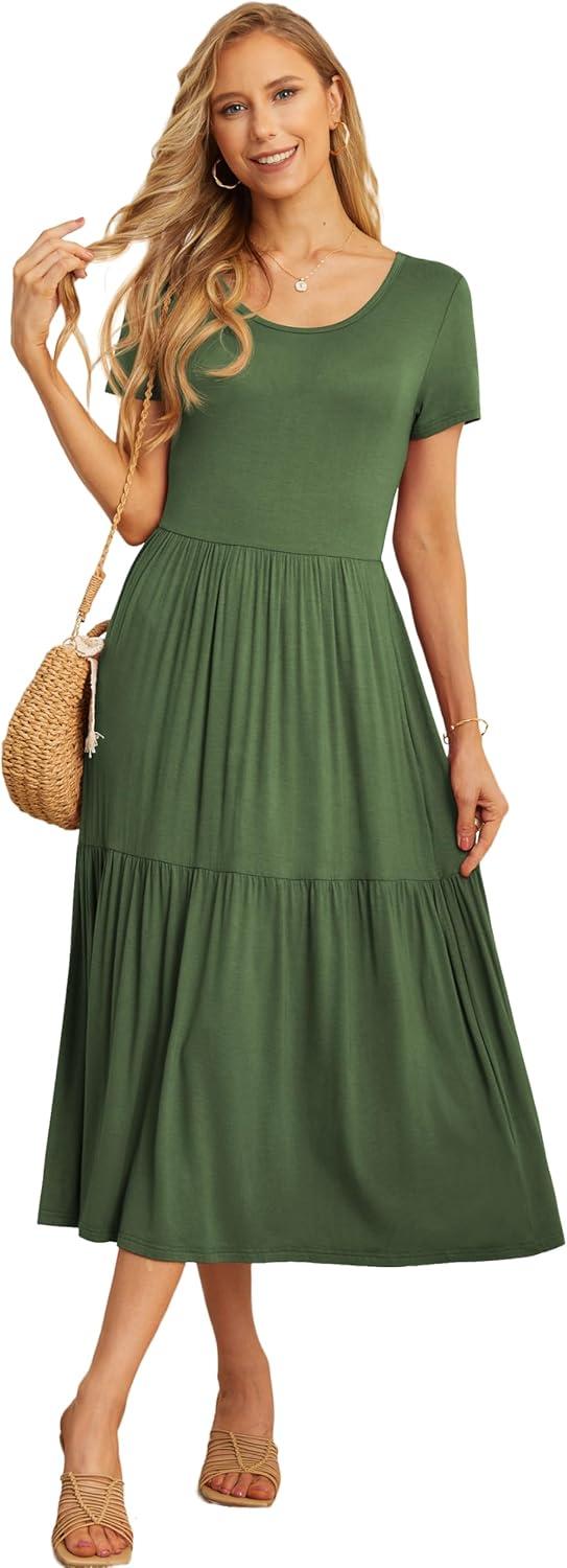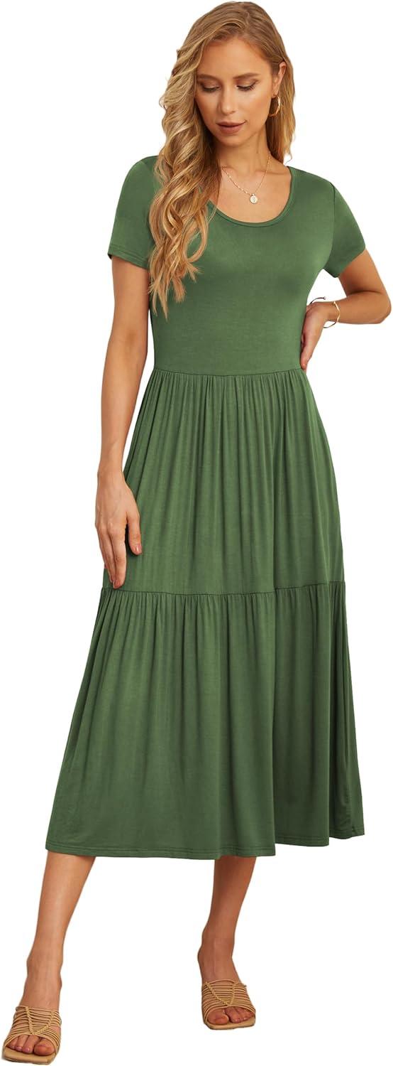 GRECERELLE Women's Summer Casual Short Sleeve Crewneck Tiered Flowy Maxi Long Dress with Pockets (S-2XL)(Army Green)