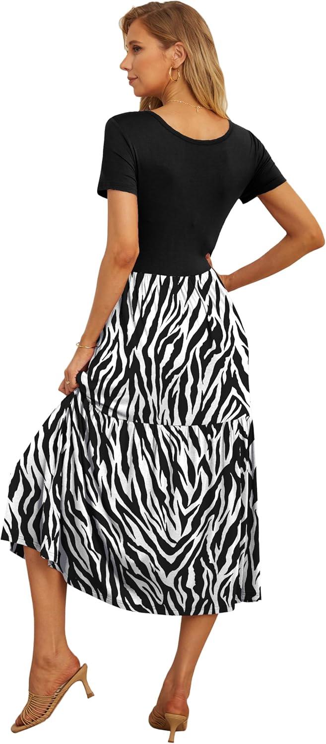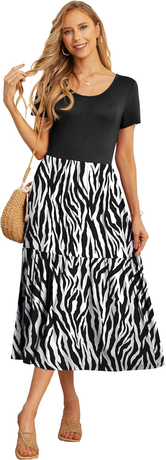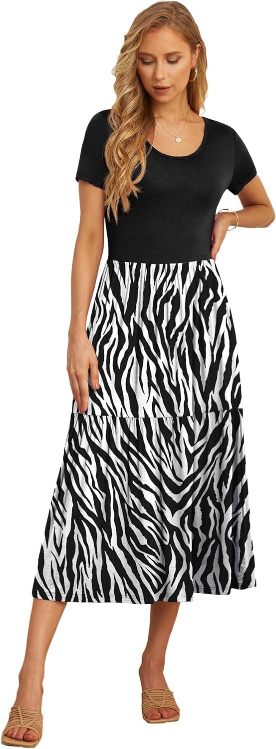 GRECERELLE Women's Summer Casual Short Sleeve Crewneck Tiered Flowy Maxi Long Dress with Pockets (S-2XL)(Black Tree Grain)