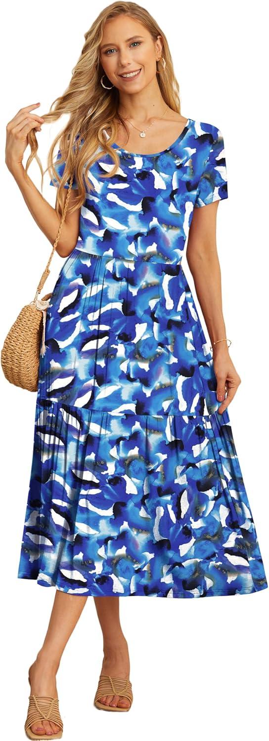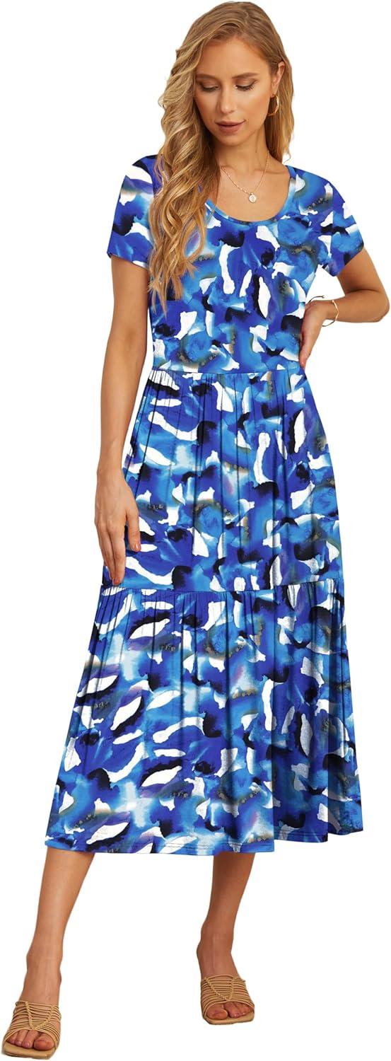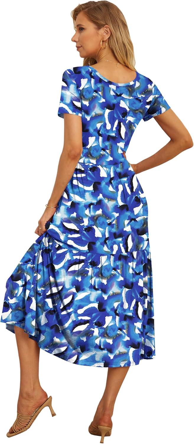 GRECERELLE Women's Summer Casual Short Sleeve Crewneck Tiered Flowy Maxi Long Dress with Pockets (S-2XL)(Blue Ink White)