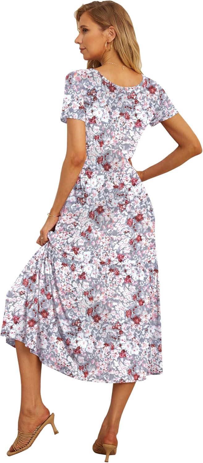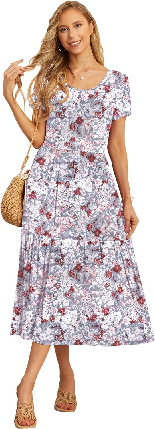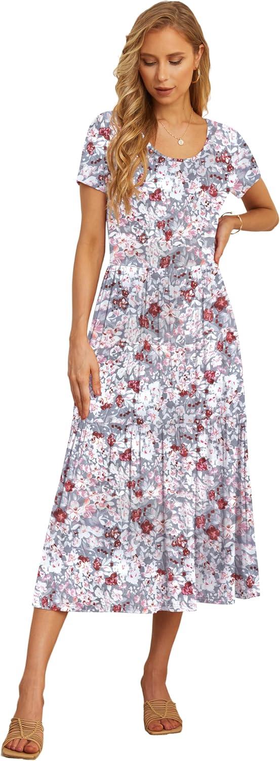 GRECERELLE Women’s Summer Casual Short Sleeve Crewneck Tiered Flowy Maxi Long Dress with Pockets (S-2XL)(Gray Azalea)
