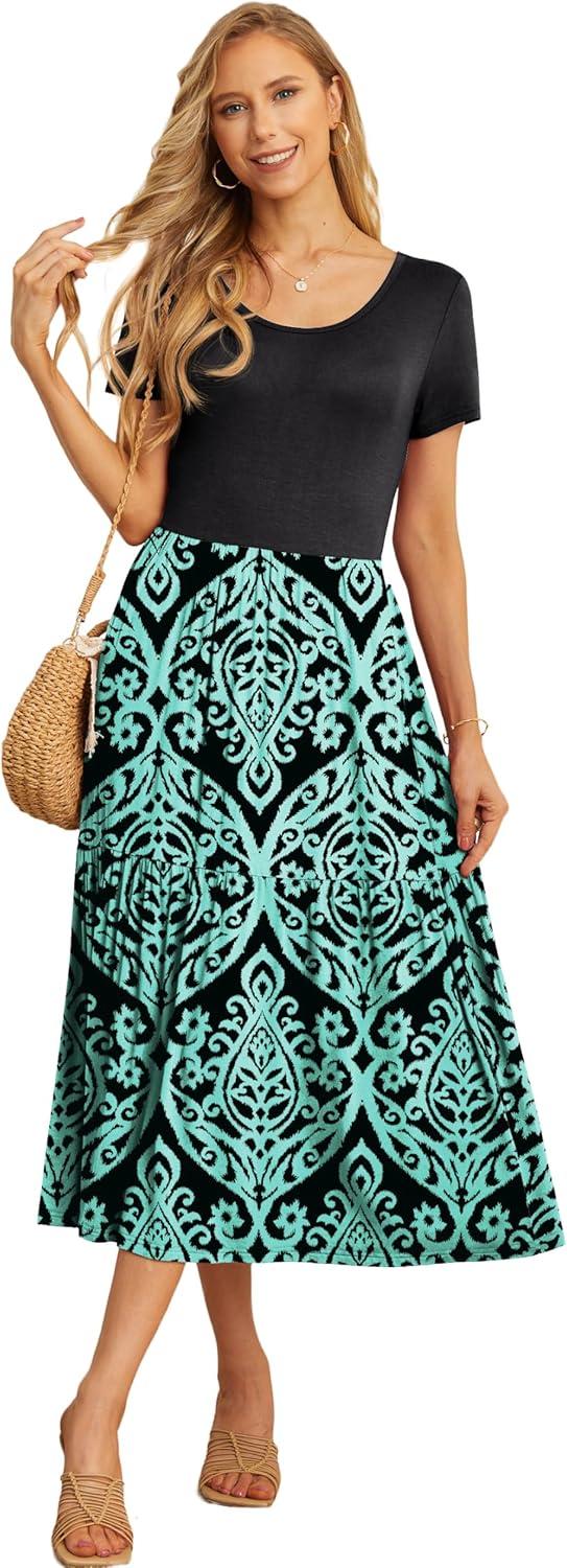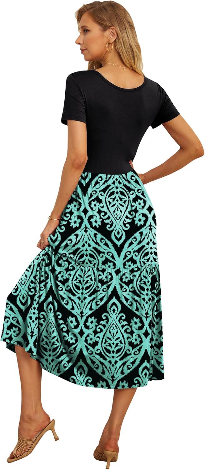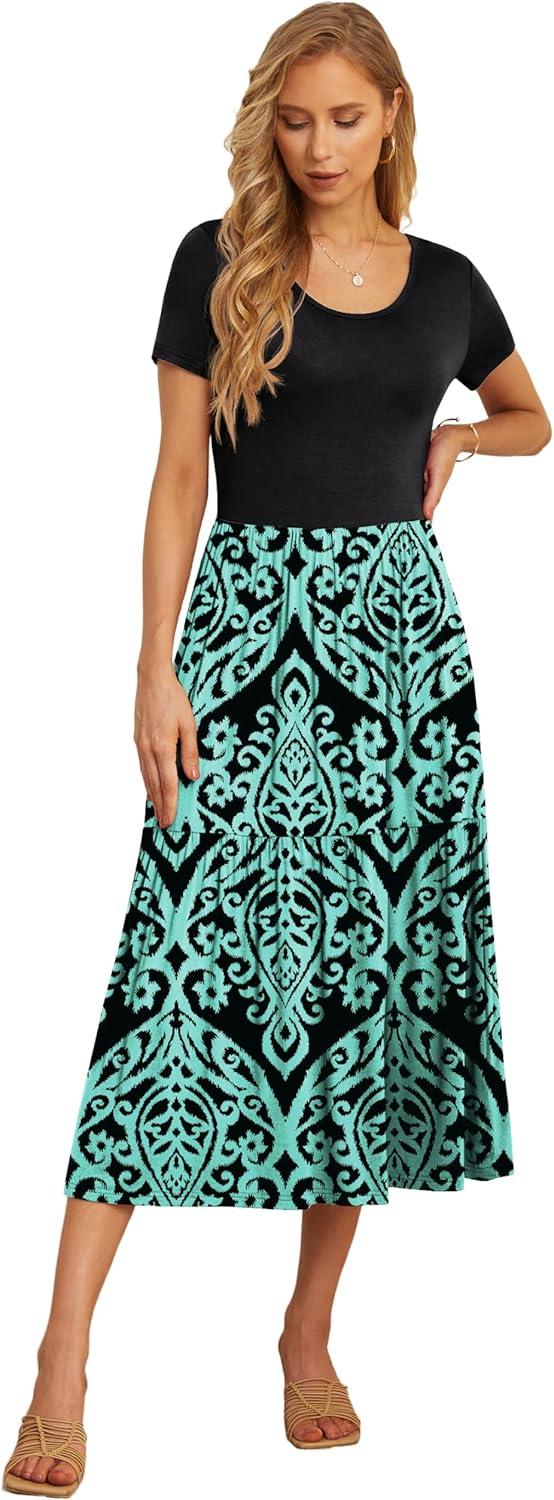 GRECERELLE Women’s Summer Casual Short Sleeve Crewneck Tiered Flowy Maxi Long Dress with Pockets (S-2XL)(Prints Bluegreen)