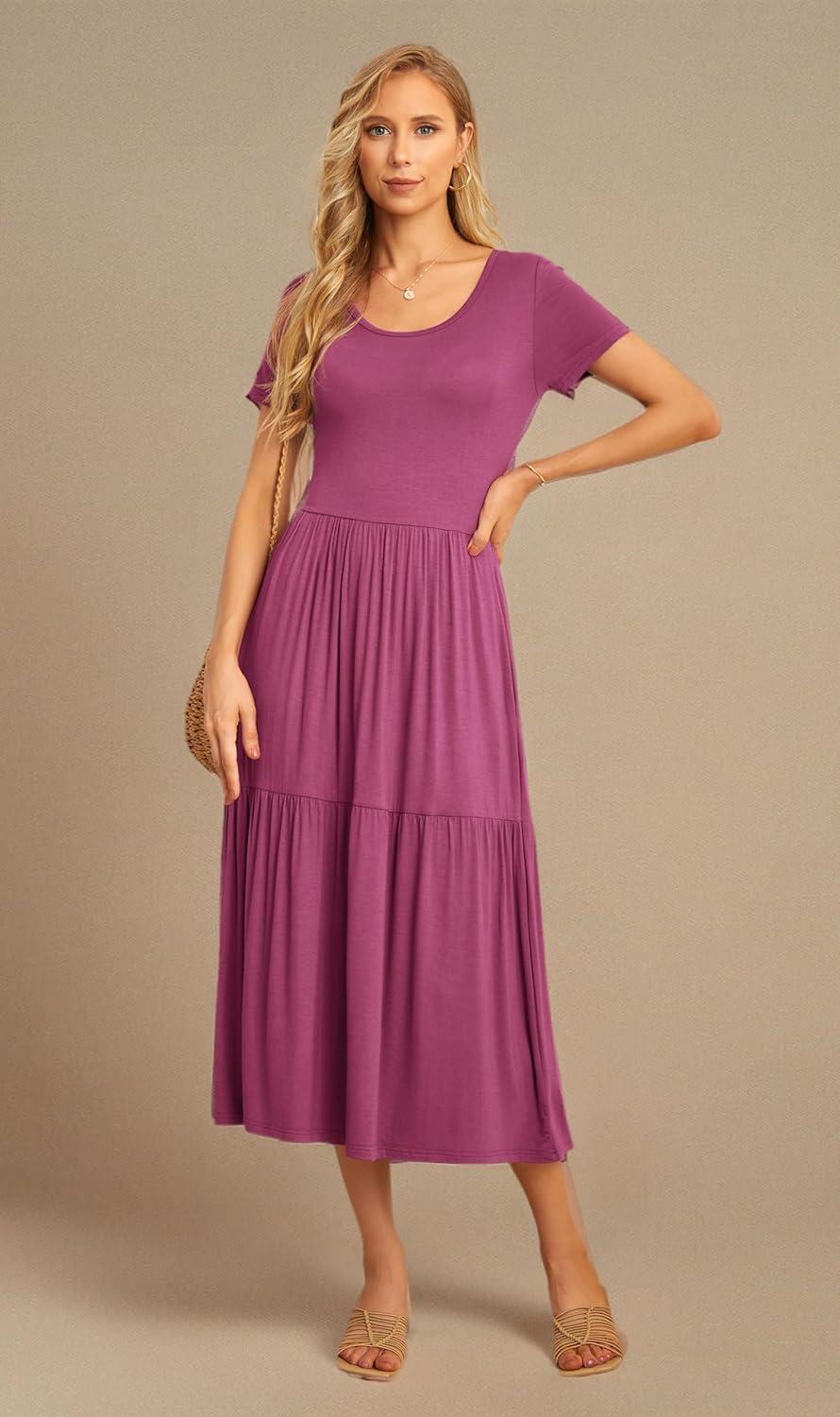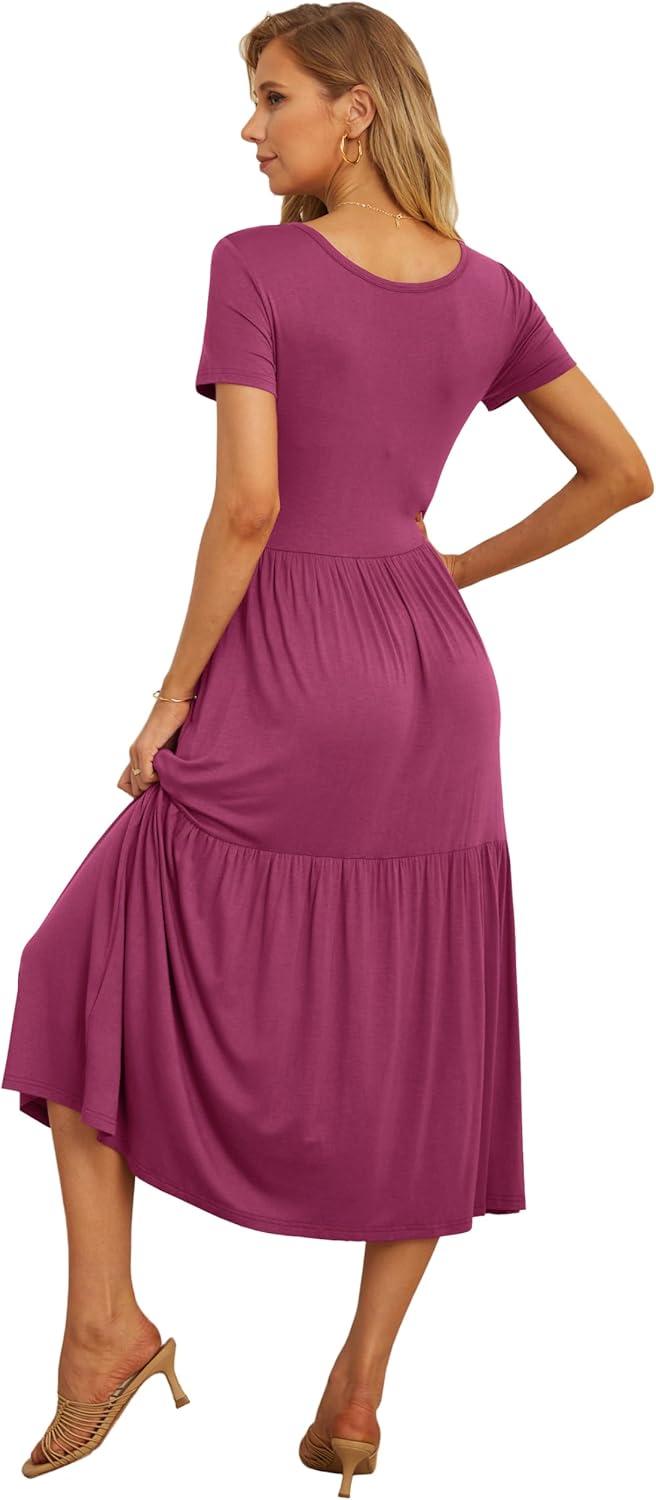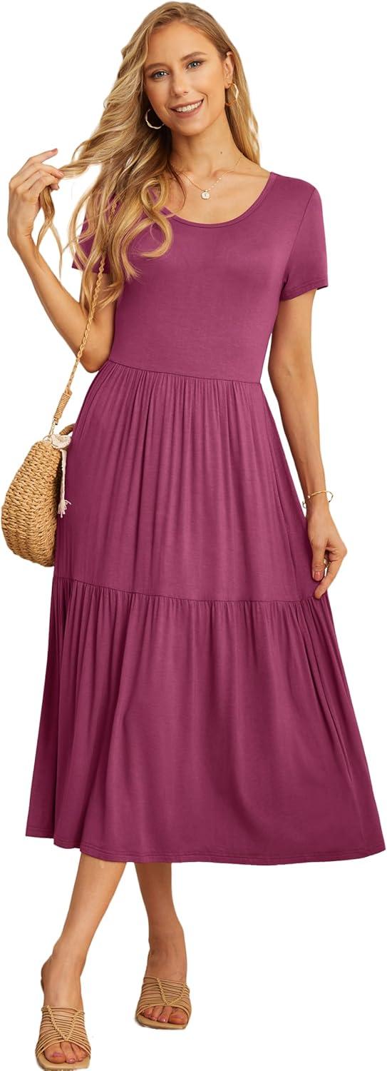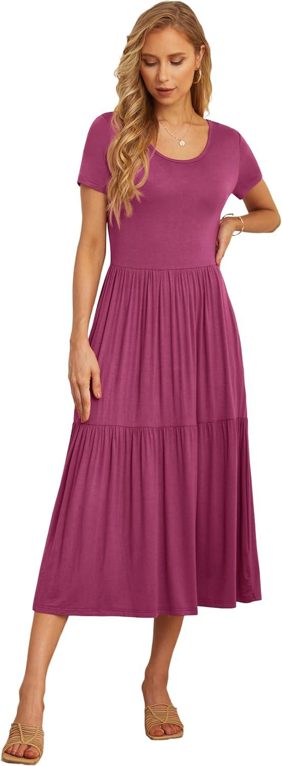 GRECERELLE Women's Summer Casual Short Sleeve Crewneck Tiered Flowy Maxi Long Dress with Pockets (S-2XL)(Red Gray)