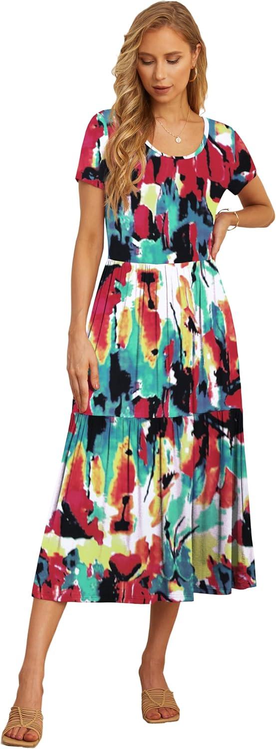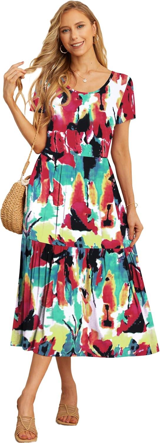 GRECERELLE Women's Summer Casual Short Sleeve Crewneck Tiered Flowy Maxi Long Dress with Pockets (S-2XL)(White Ink Red)