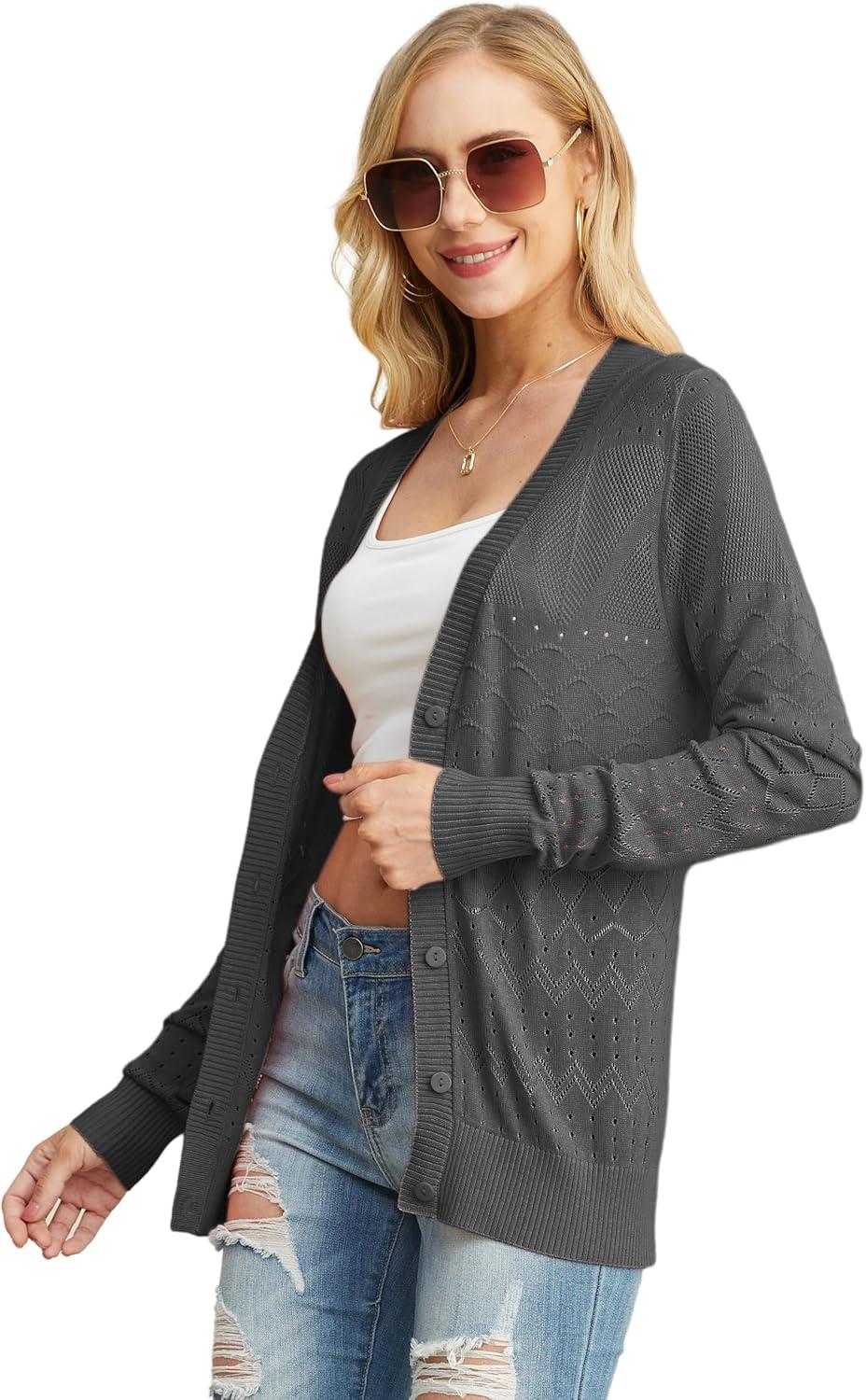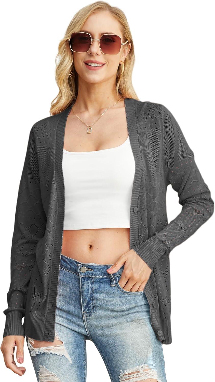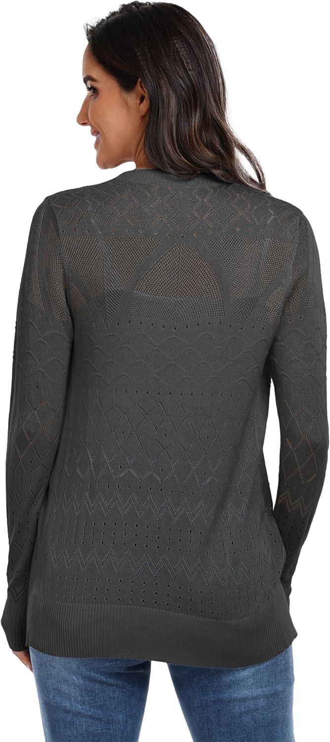 GRECERELLE Womens Summer Crochet Cardigans Long Sleeve Lightweight Casual Knit Sweaters(Dark Gray)