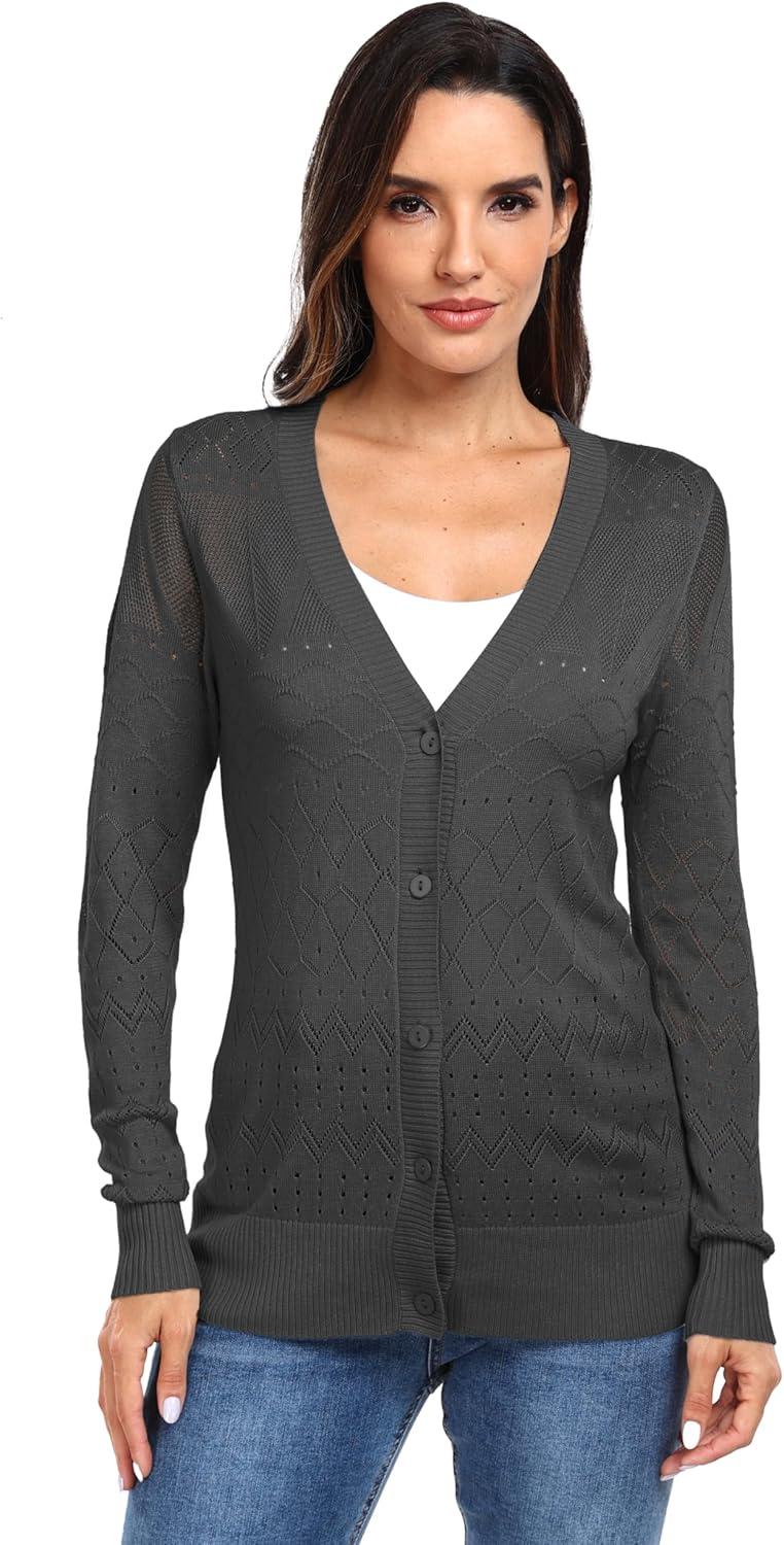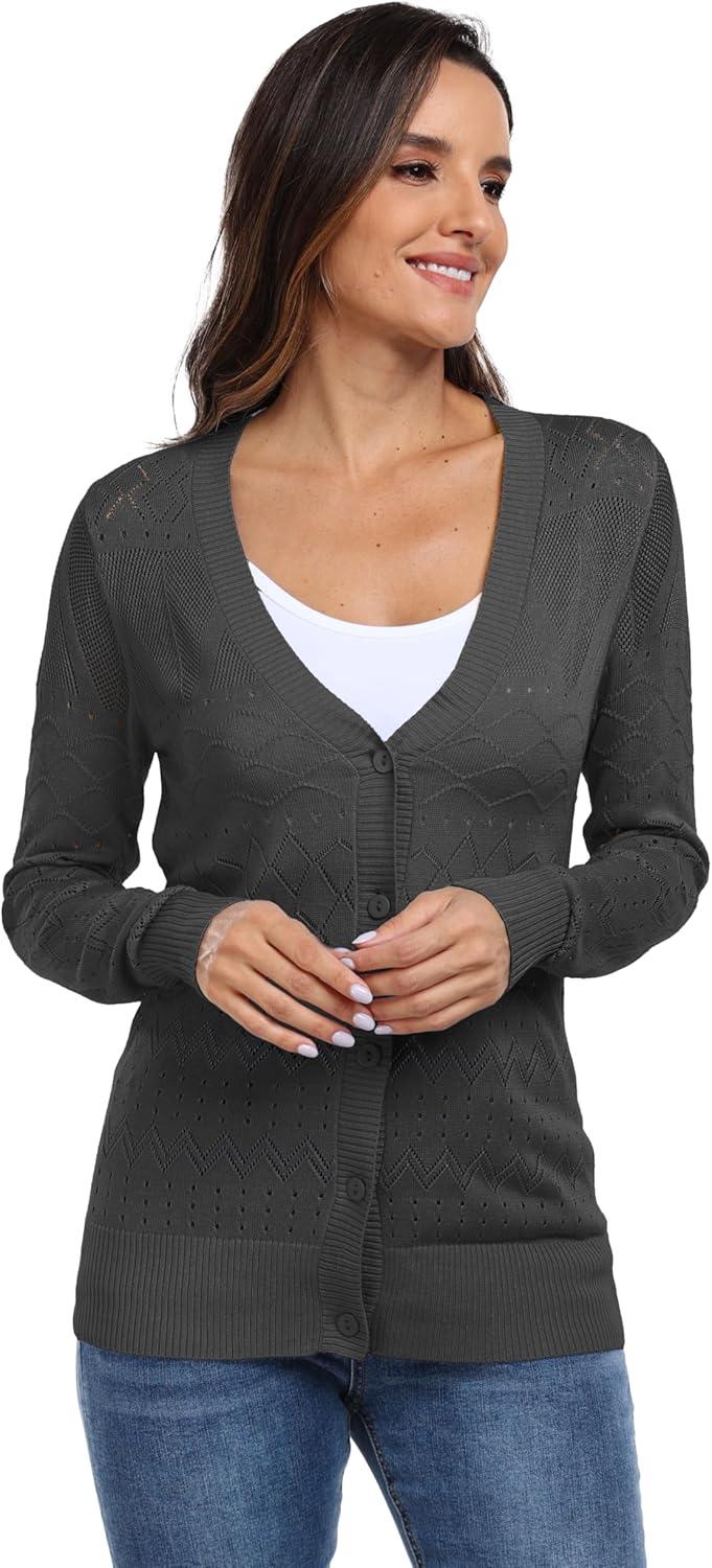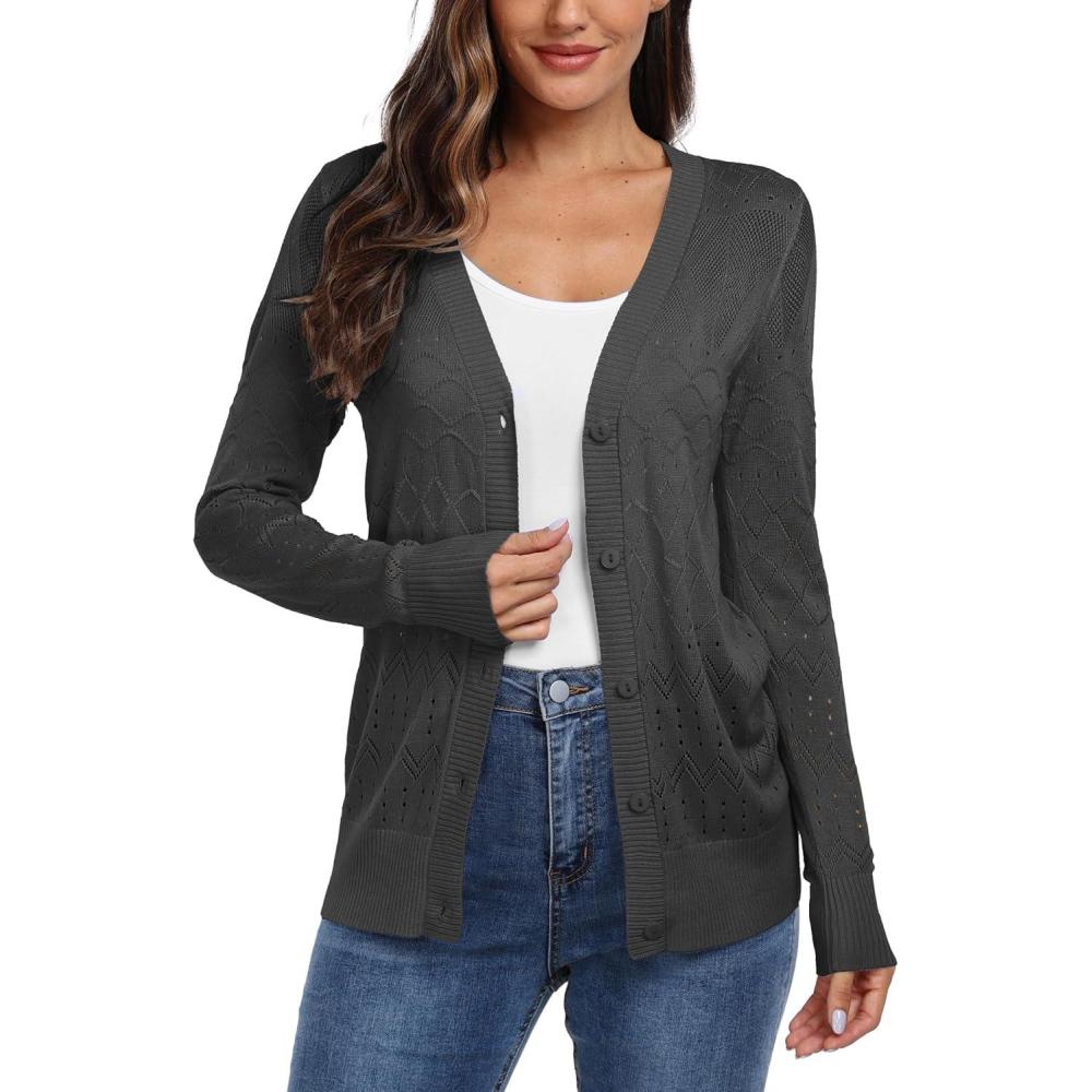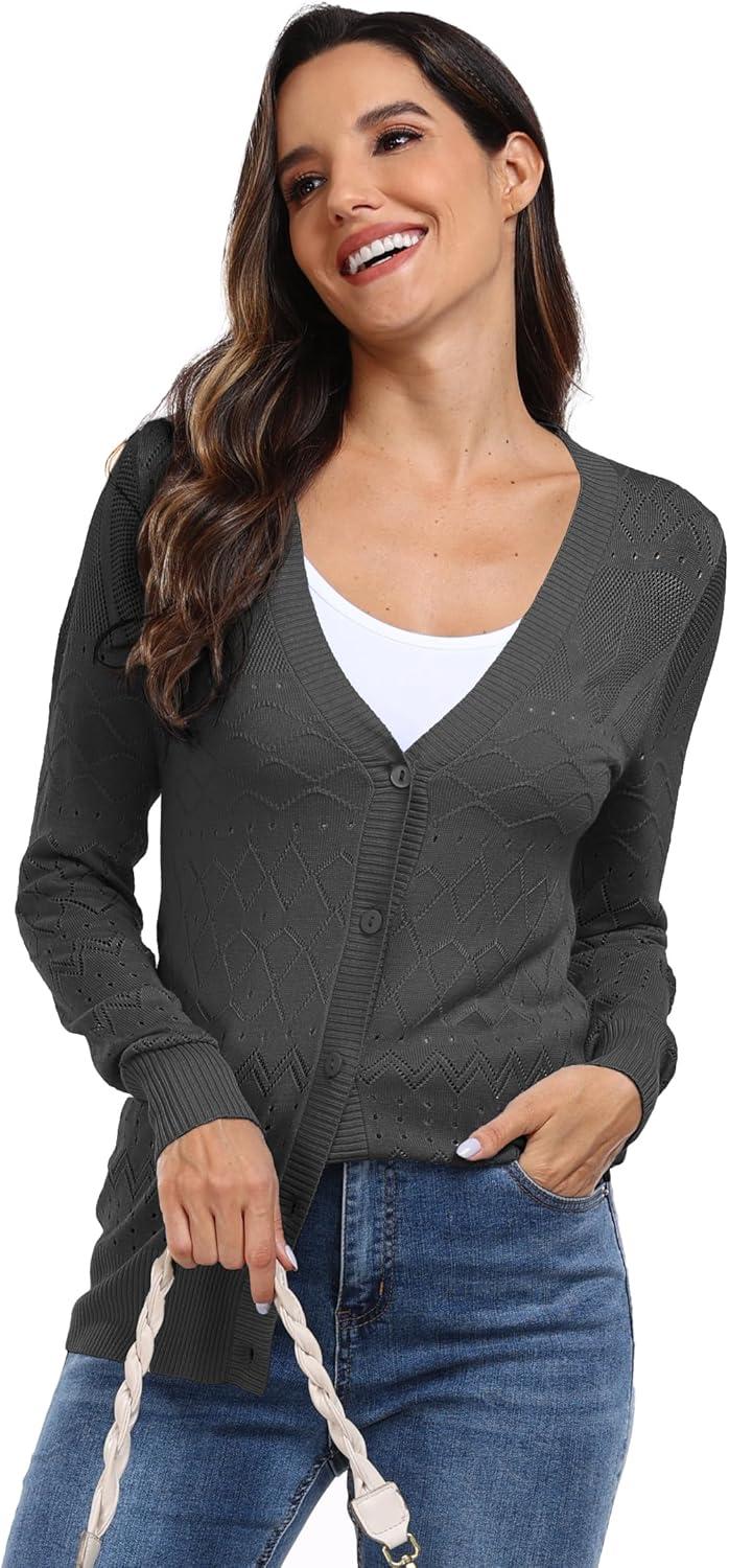 GRECERELLE Womens Summer Crochet Cardigans Long Sleeve Lightweight Casual Knit Sweaters(Dark Gray)