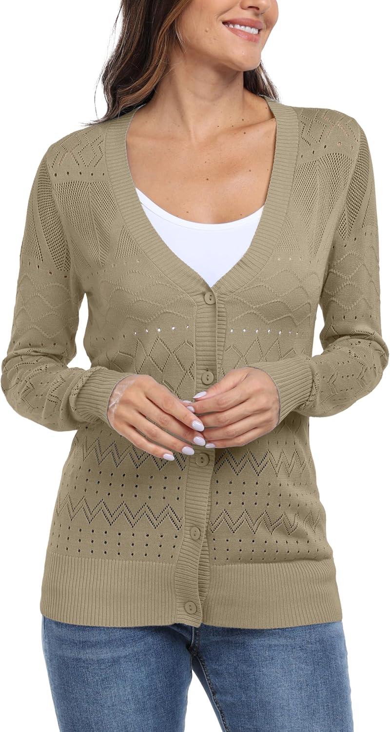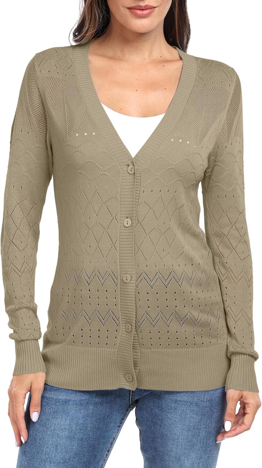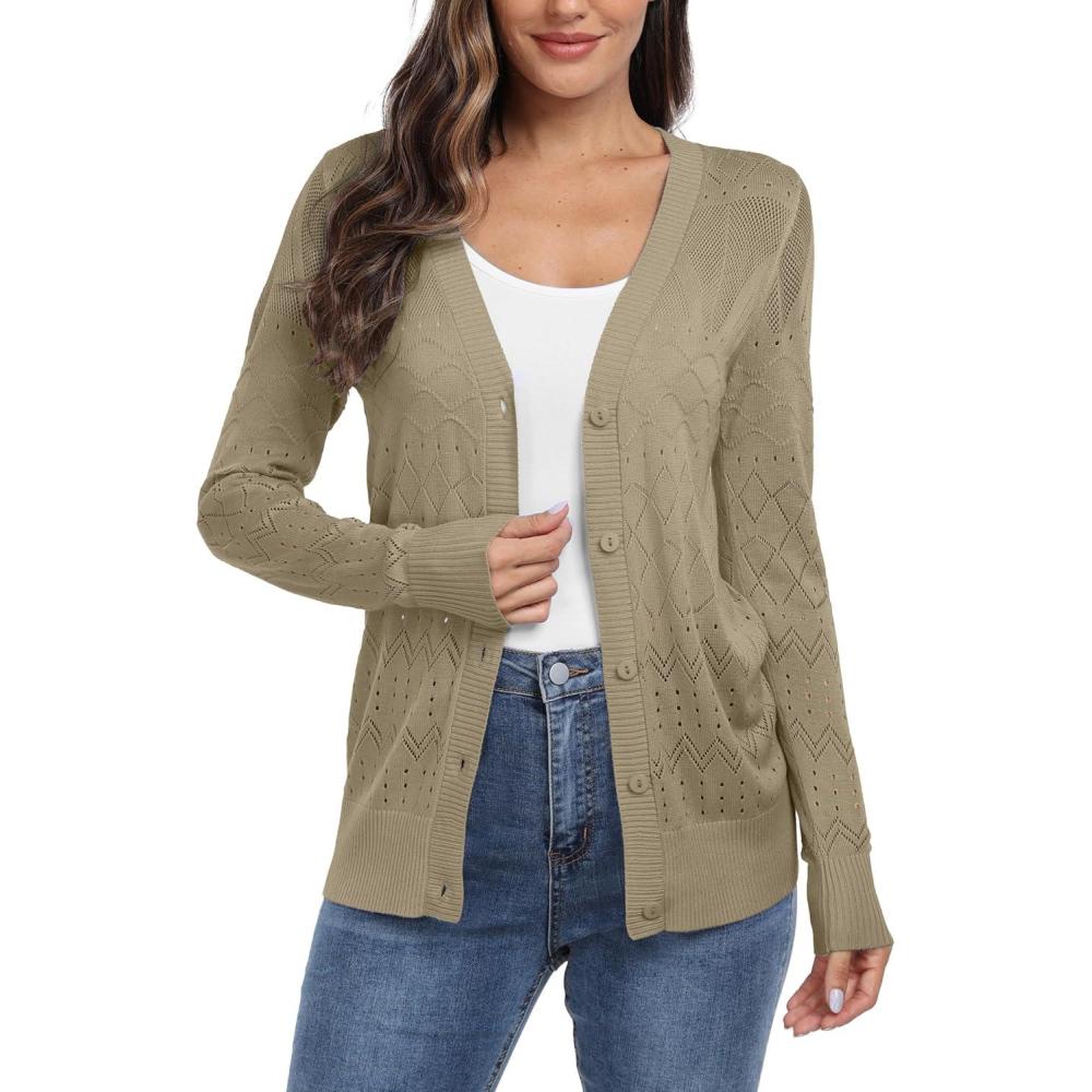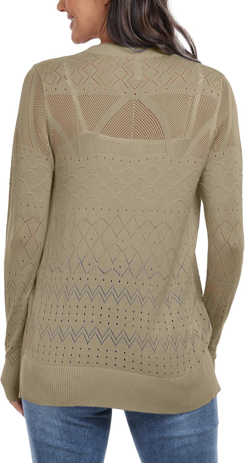 GRECERELLE Womens Summer Crochet Cardigans Long Sleeve Lightweight Casual Knit Sweaters(Khaki)