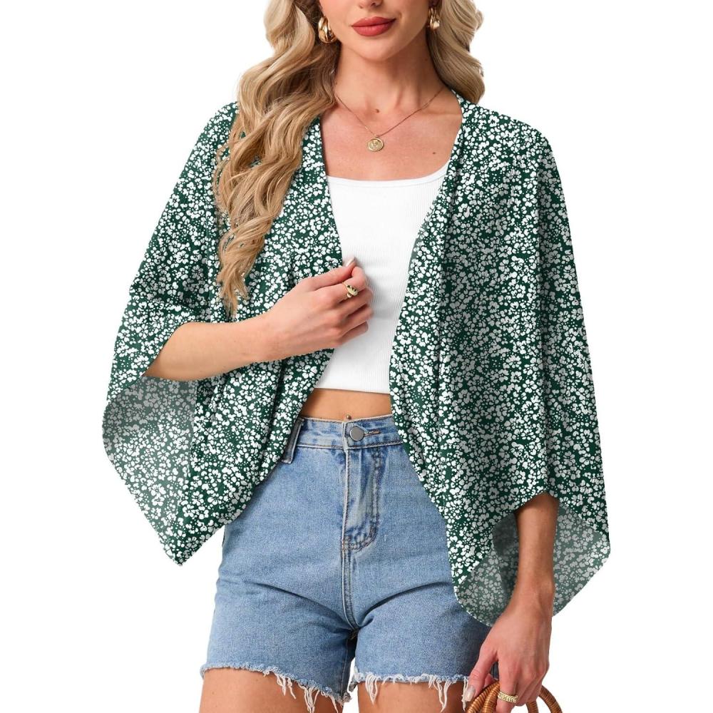 imageGRECERELLE Womens Summer Lightweight Cardigan Open Front Casual Loose Cropped Kimono Cover UpsGreen White Flower