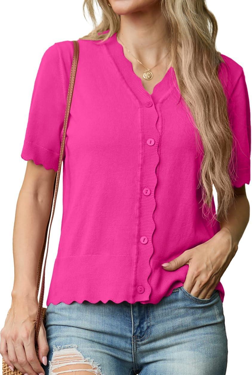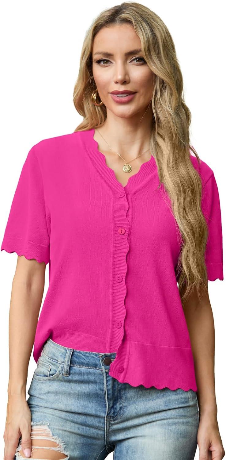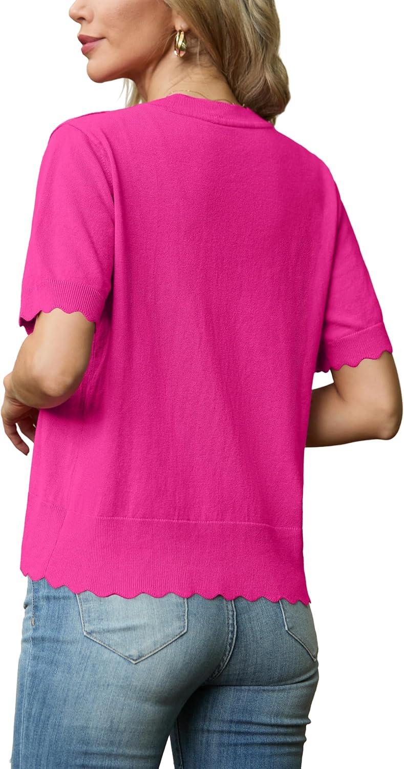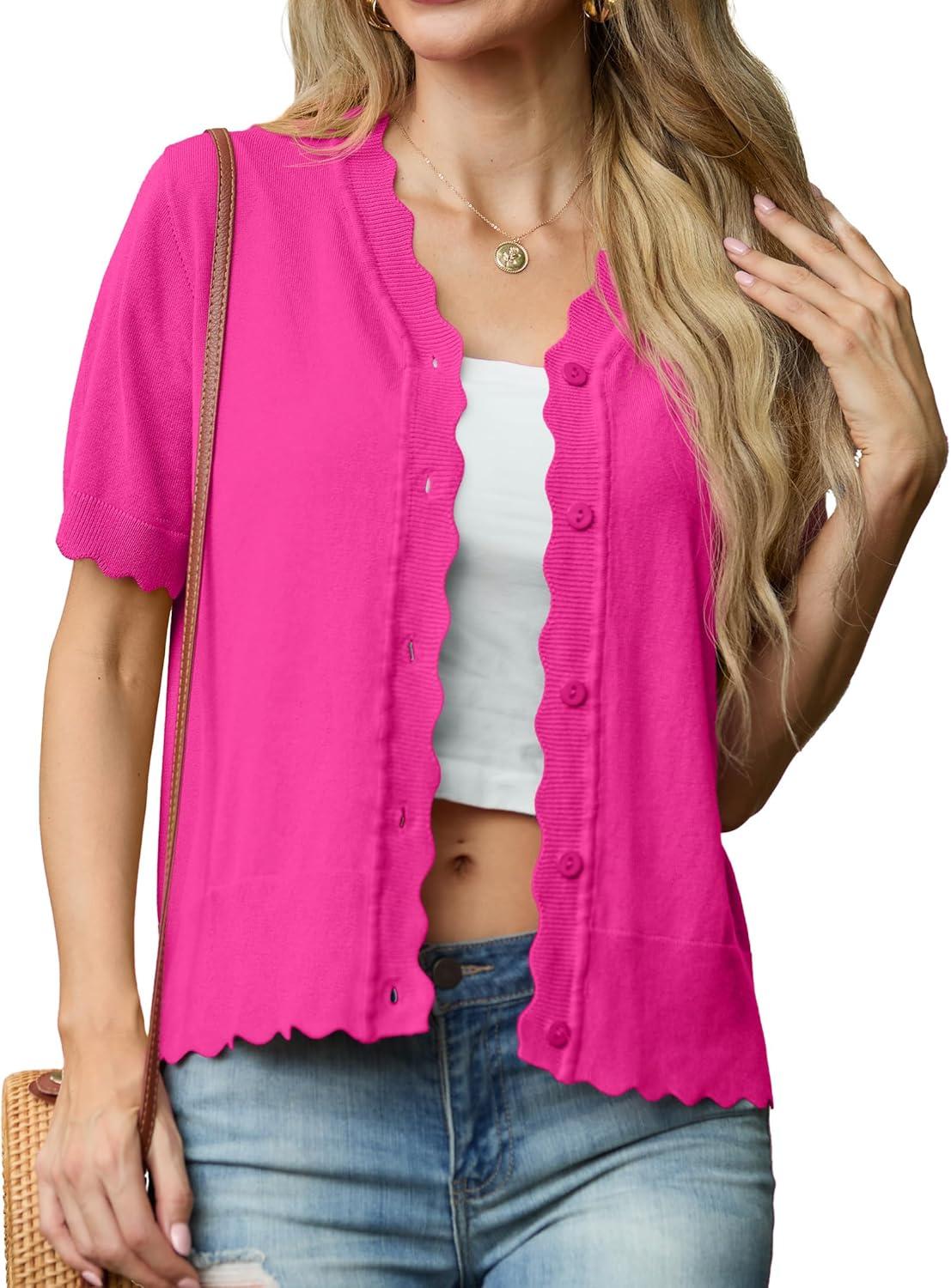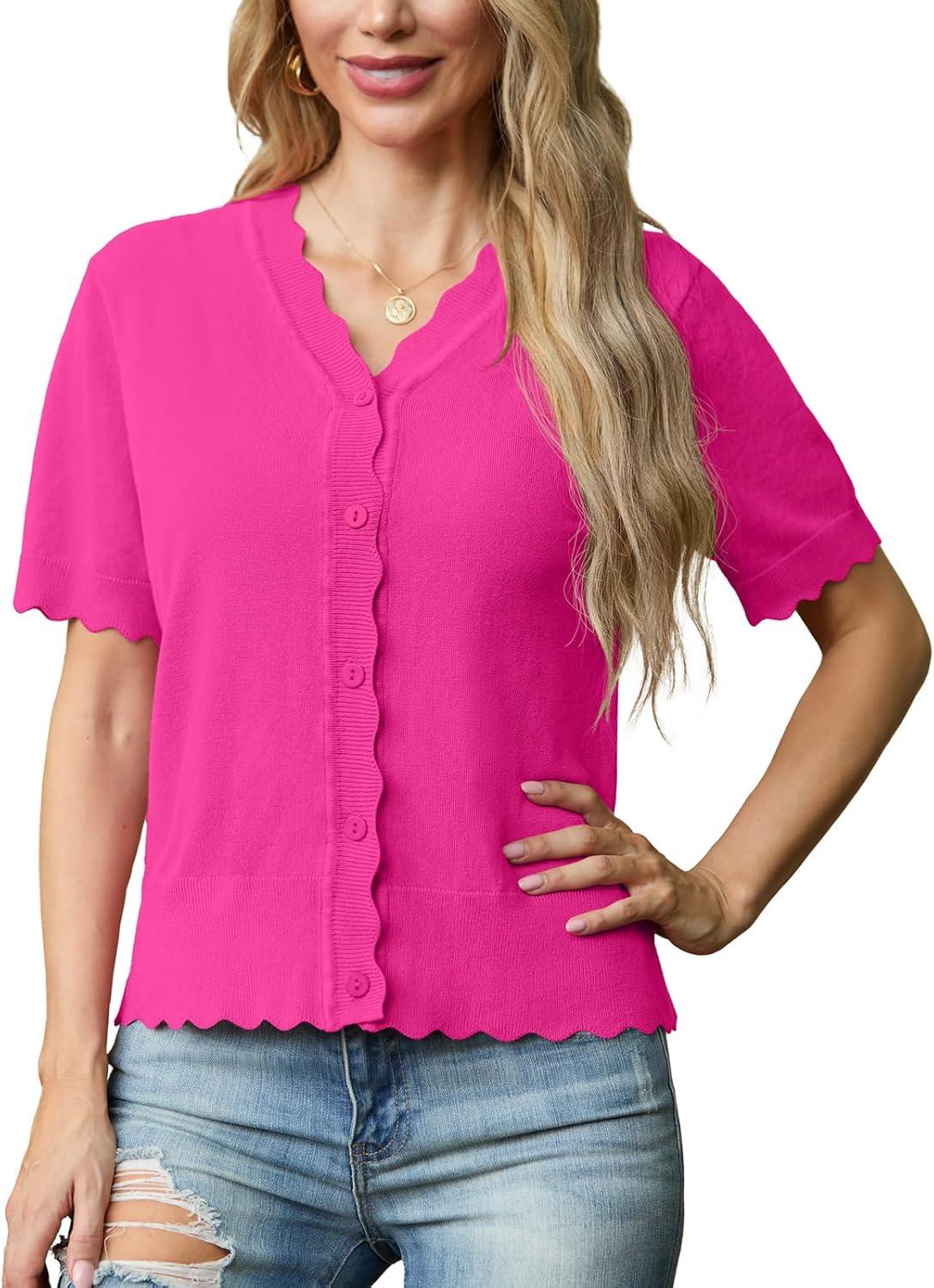 GRECERELLE Womens Summer Lightweight Short Sleeve Cropped Cardigan V-Neck Knit Sweater Shrug for Dressy(Hot Pink)