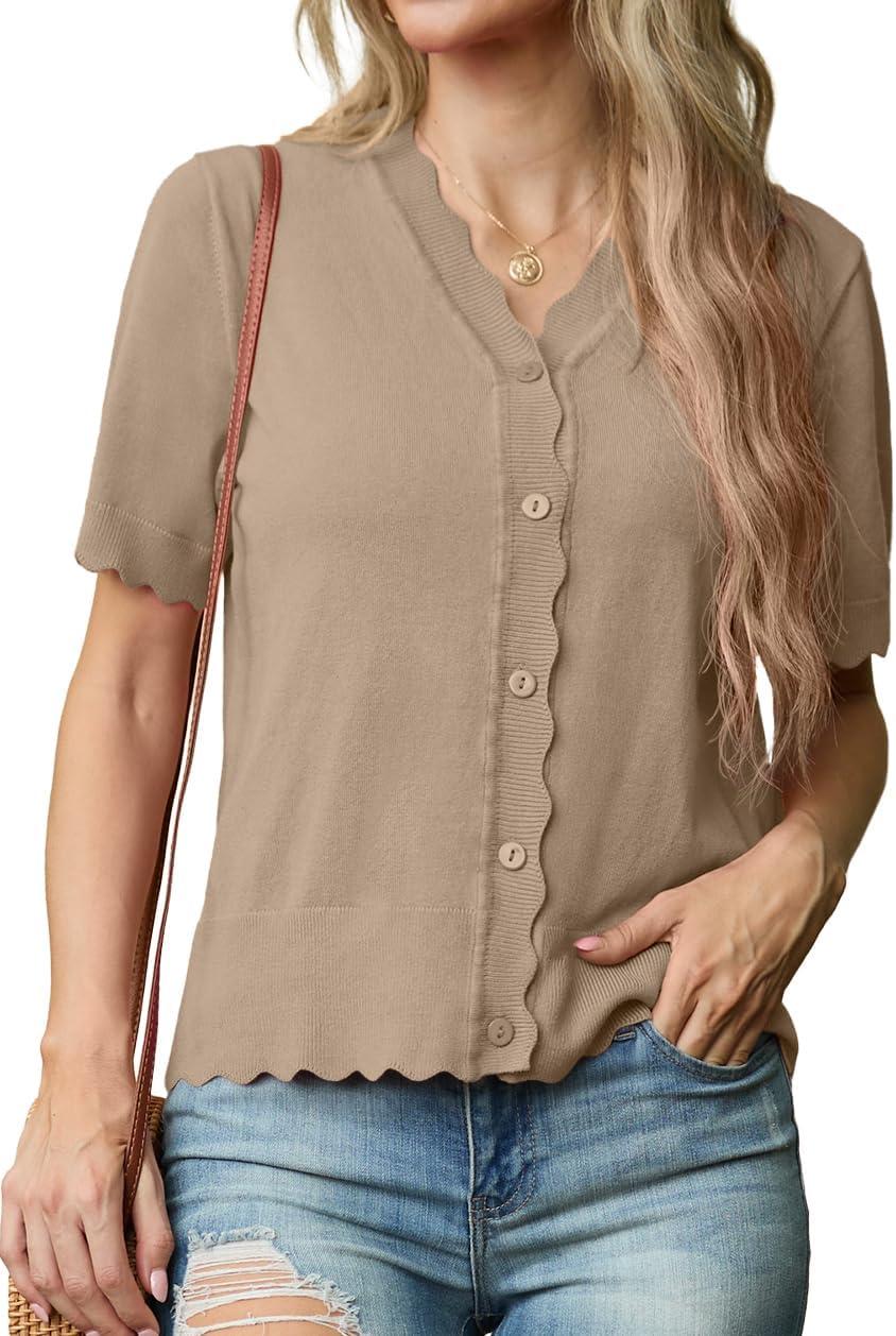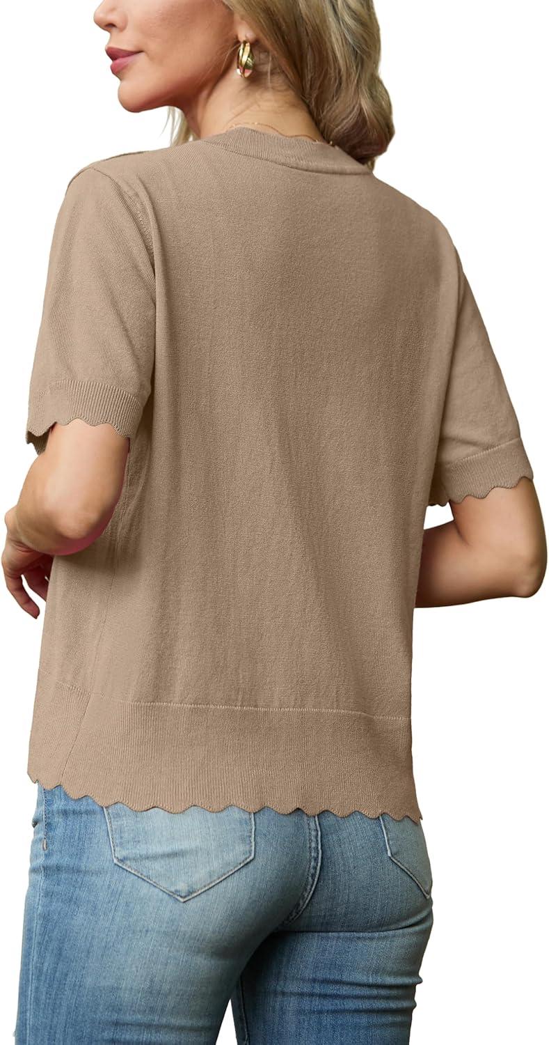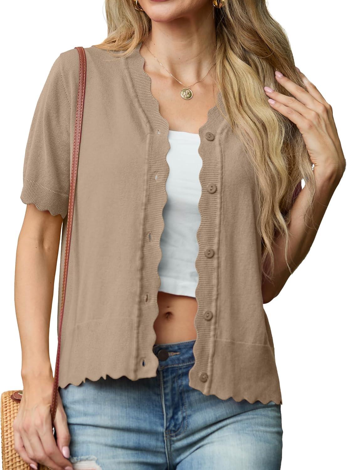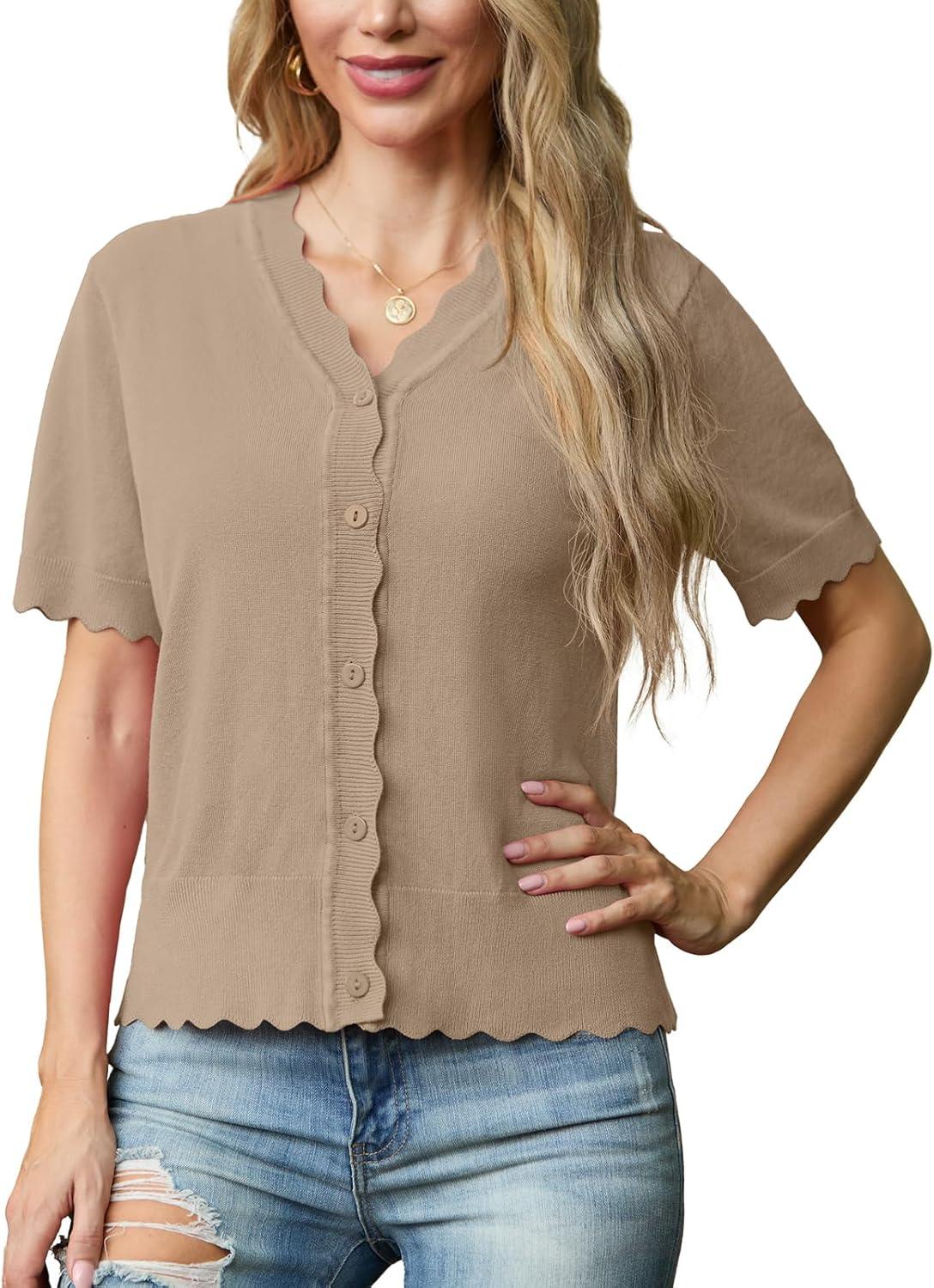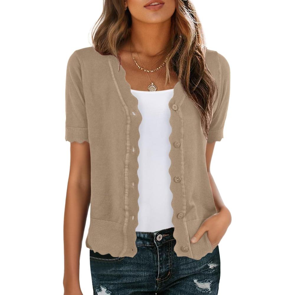 GRECERELLE Womens Summer Lightweight Short Sleeve Cropped Cardigan V-Neck Knit Sweater Shrug for Dressy(Khaki)