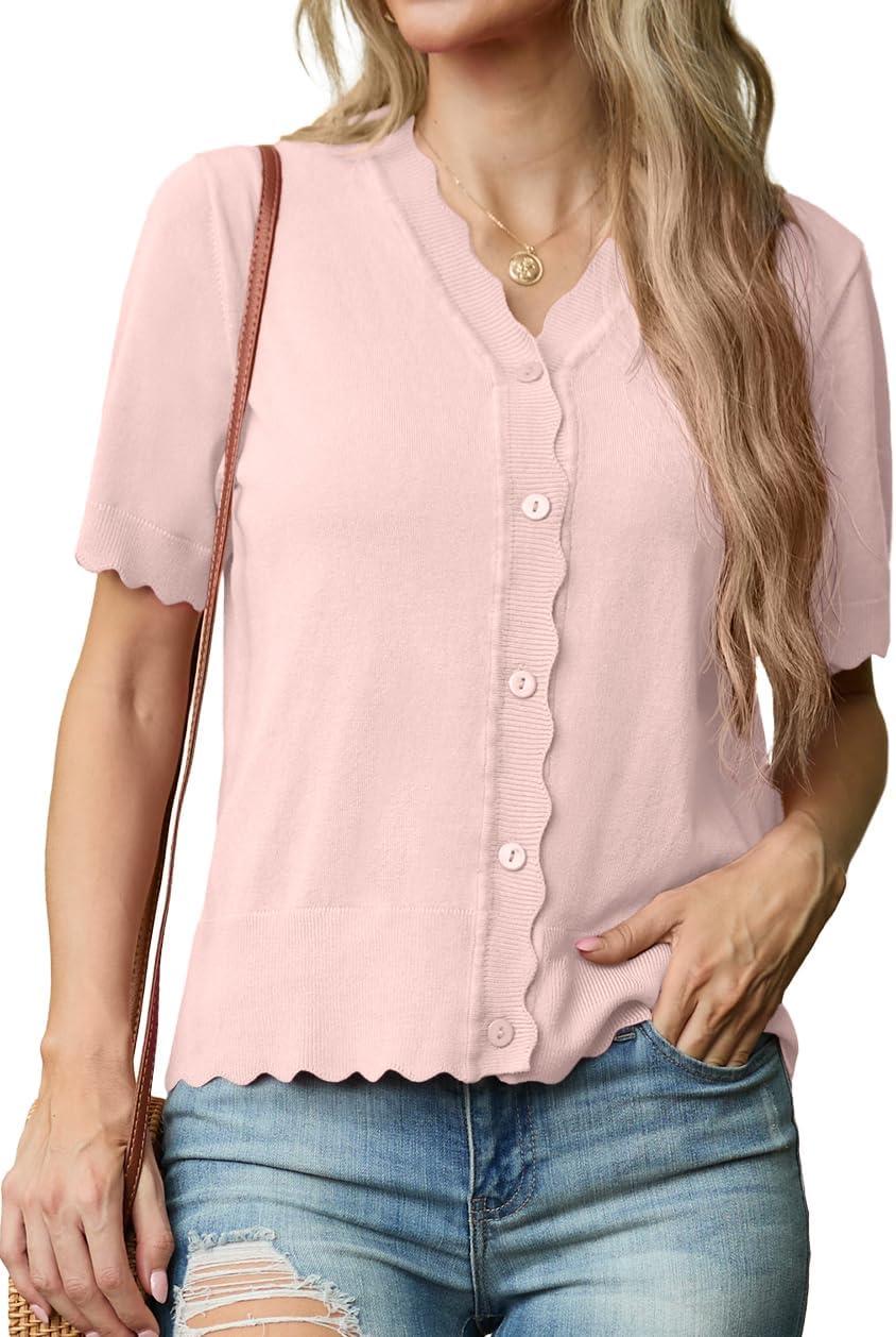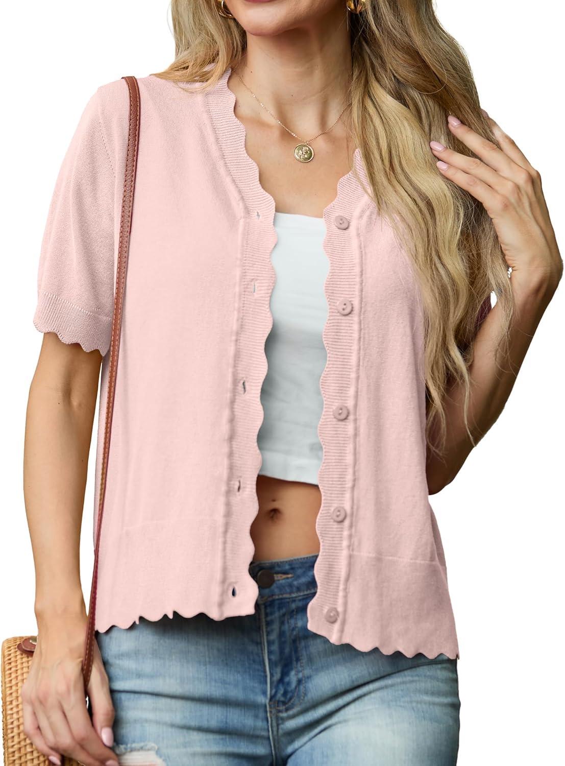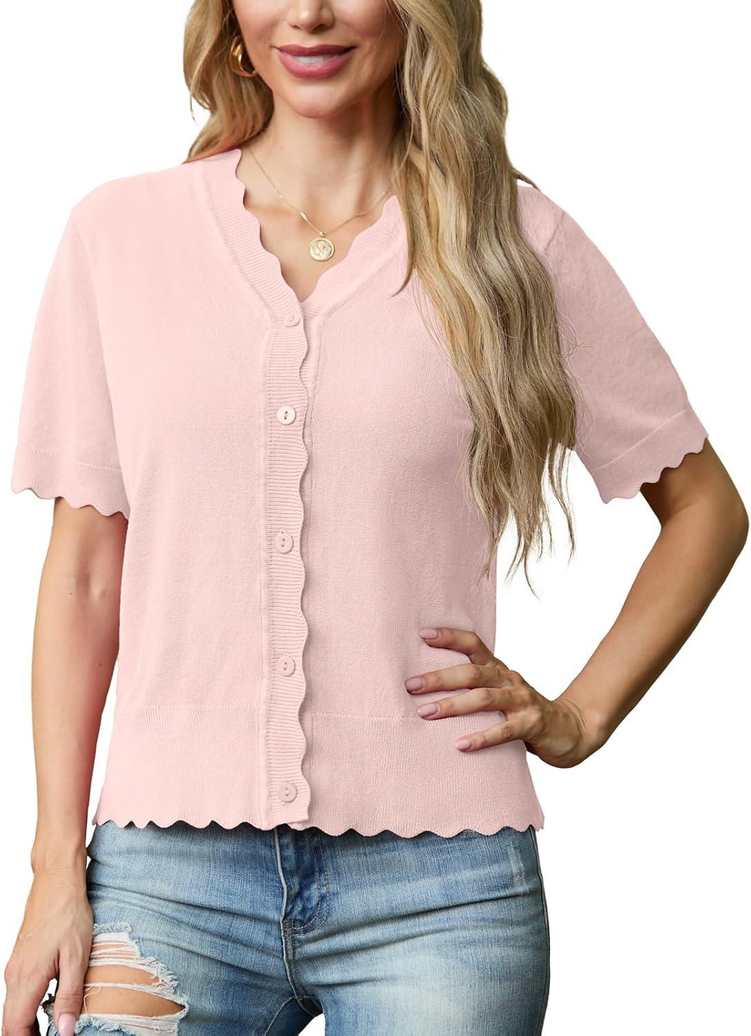 GRECERELLE Womens Summer Lightweight Short Sleeve Cropped Cardigan V-Neck Knit Sweater Shrug for Dressy(Light Pink)