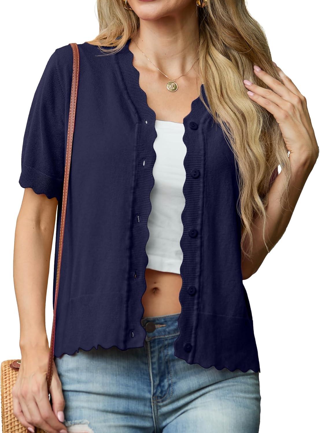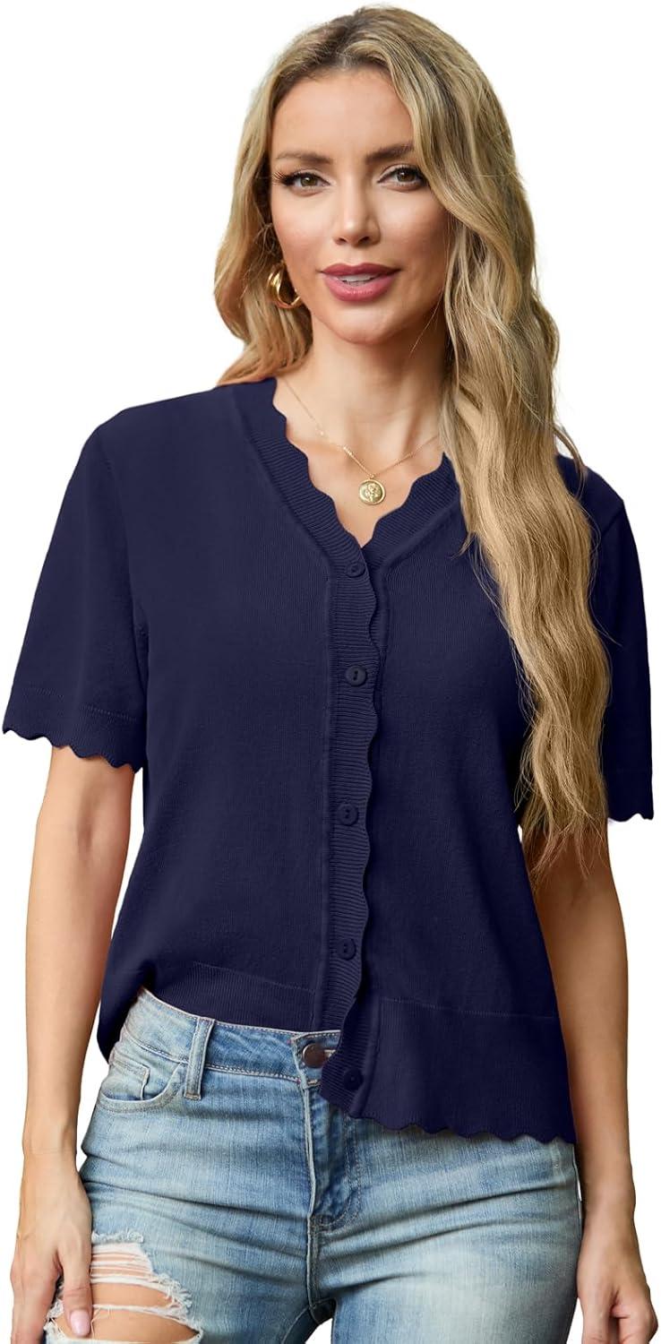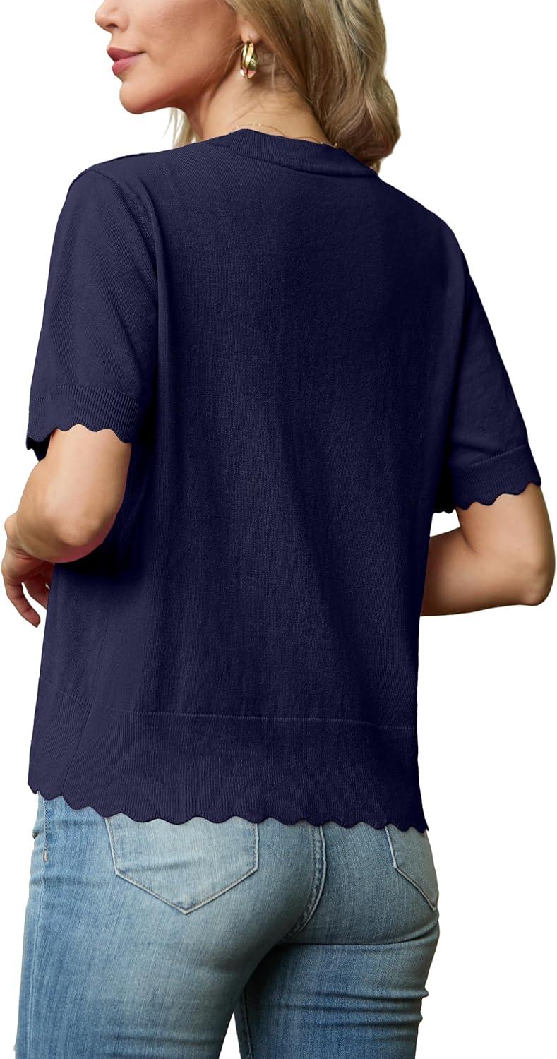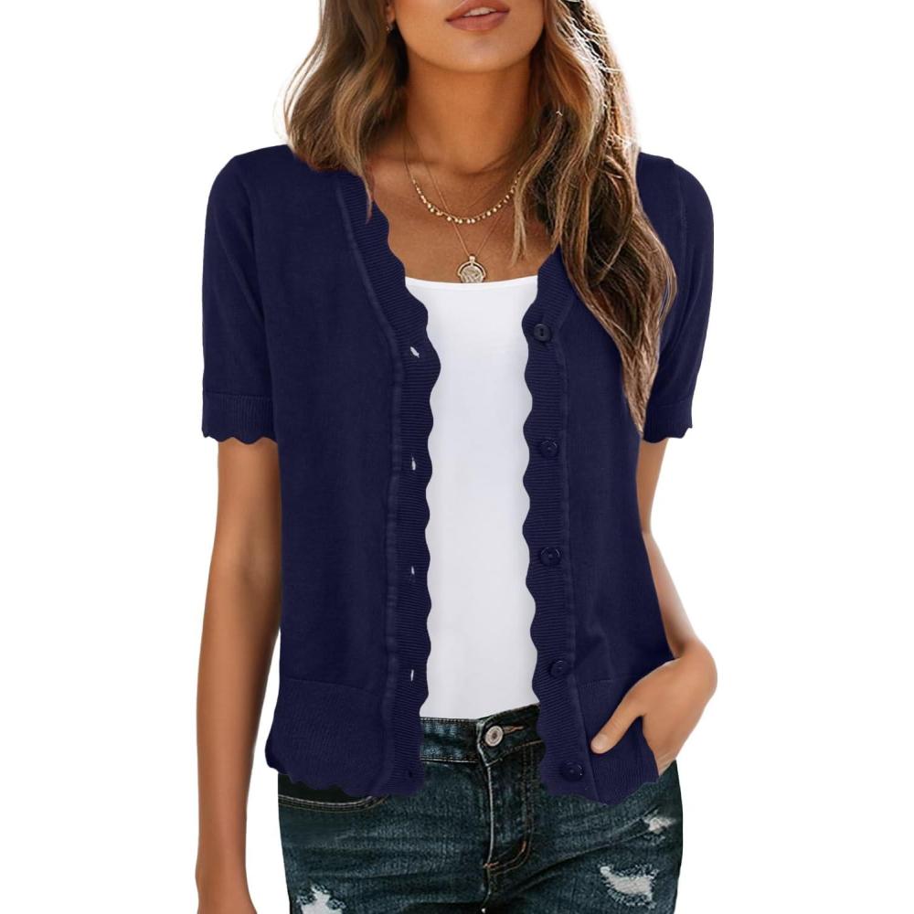 GRECERELLE Womens Summer Lightweight Short Sleeve Cropped Cardigan V-Neck Knit Sweater Shrug for Dressy(Navy Blue)