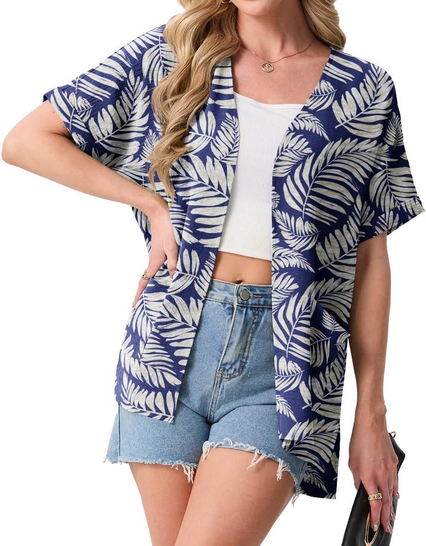 GRECERELLE Women's Summer Short Sleeve Lightweight Cardigan, Open Front Casual Cover Up with Pockets for Office Beach(Dark Blue Palm Leaf)