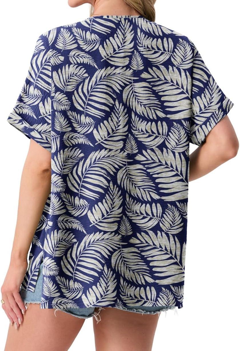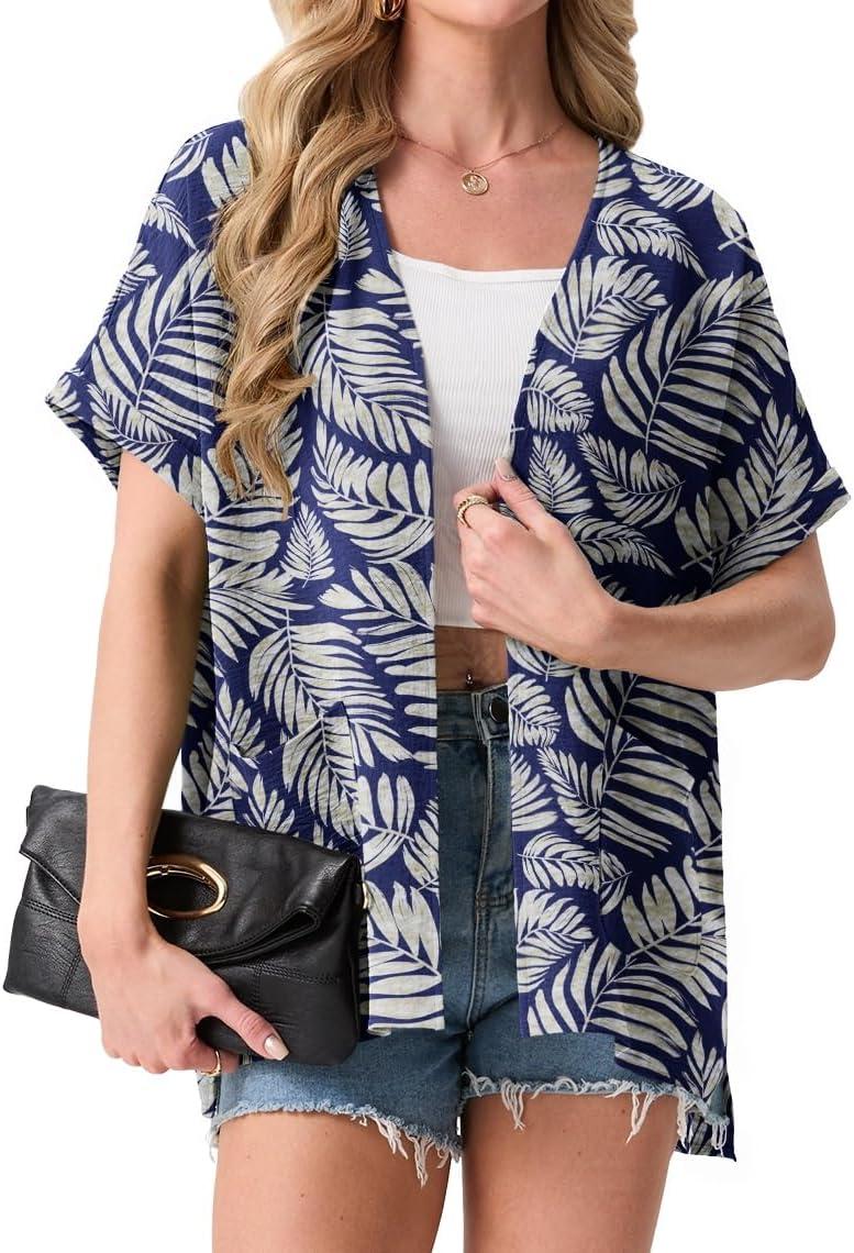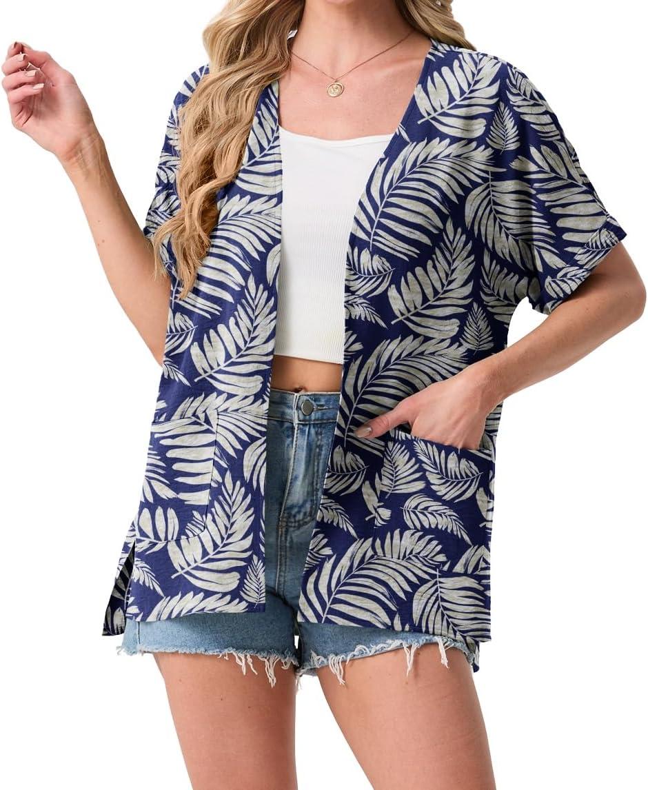 GRECERELLE Women’s Summer Short Sleeve Lightweight Cardigan, Open Front Casual Cover Up with Pockets for Office Beach(Dark Blue Palm Leaf)