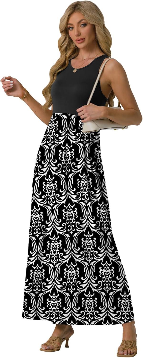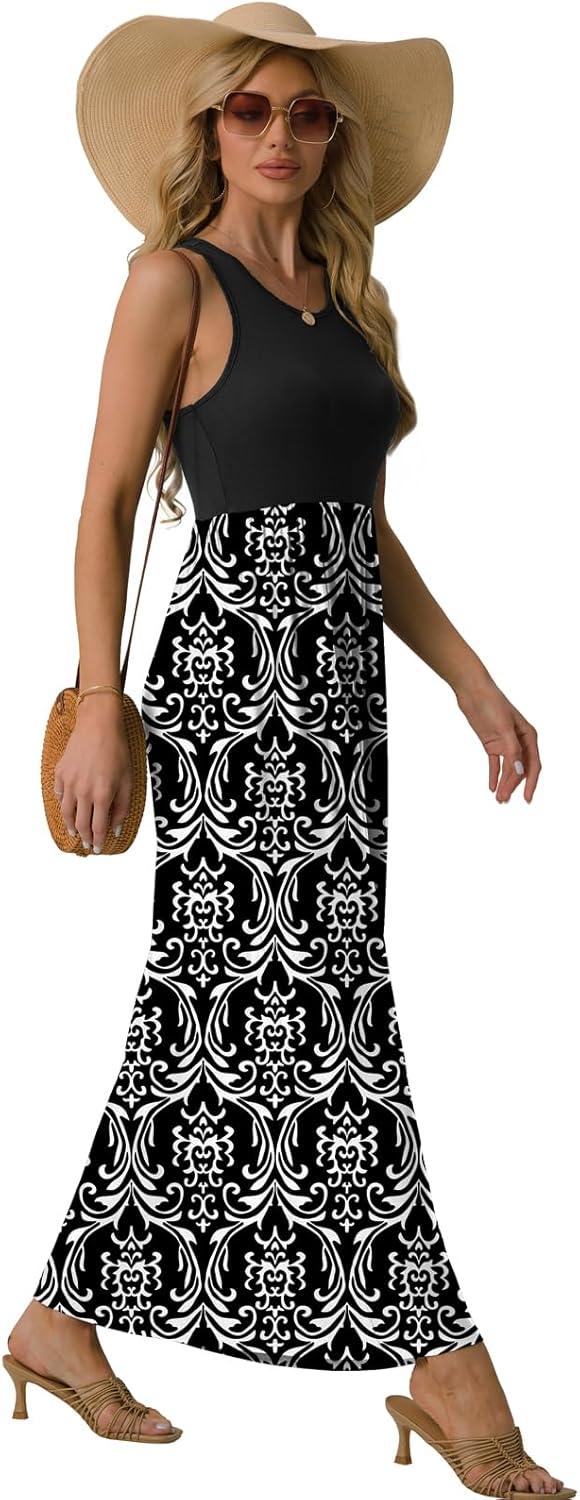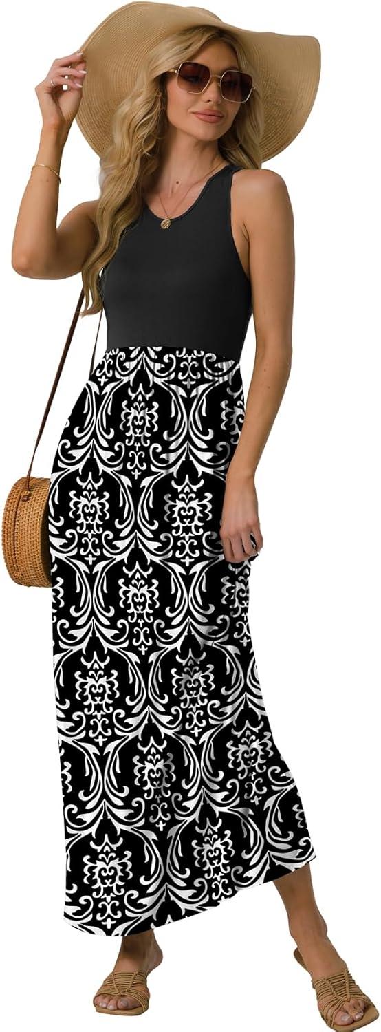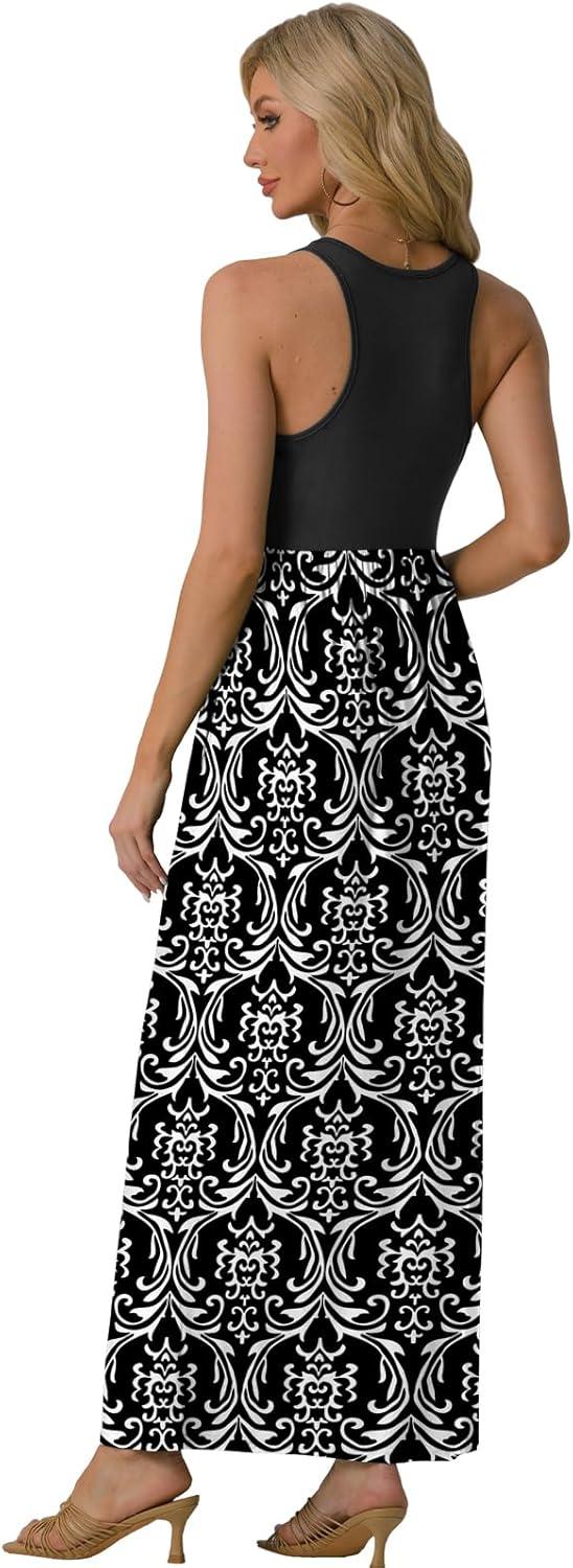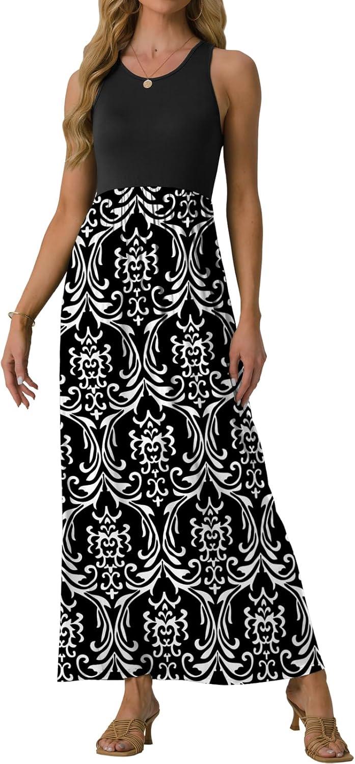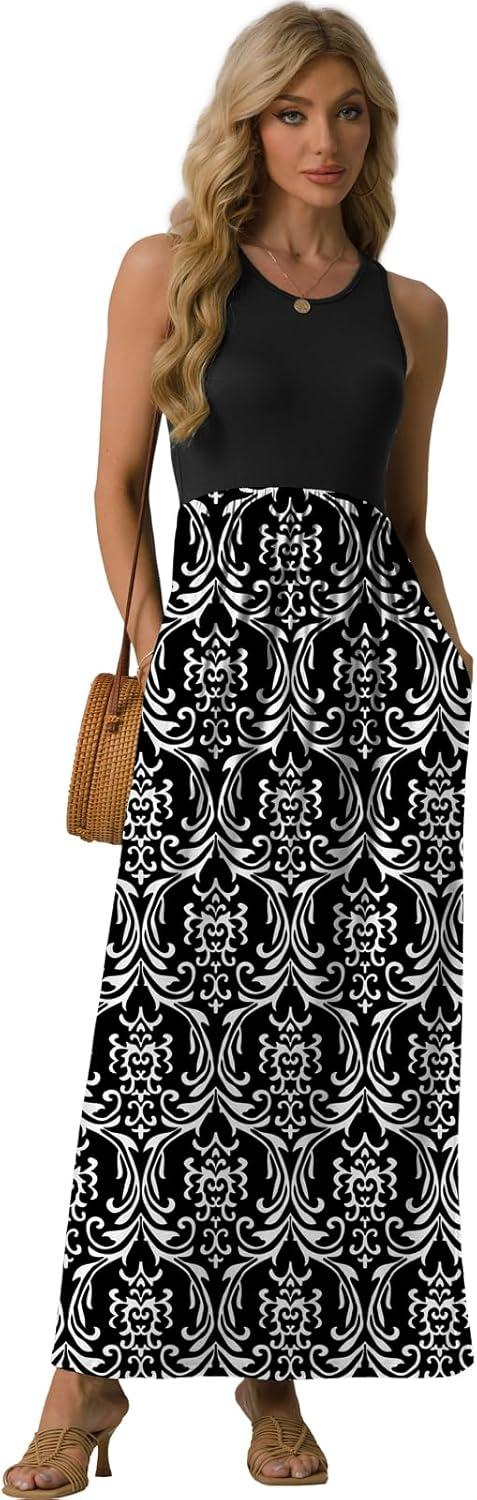 GRECERELLE Women’s Summer Sleeveless Casual Long Tank Maxi Dress with Pockets (XS-3XL)(Floral Black White)