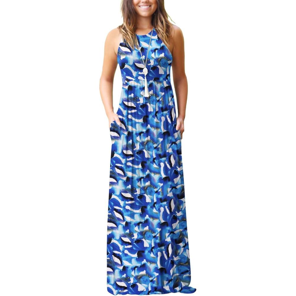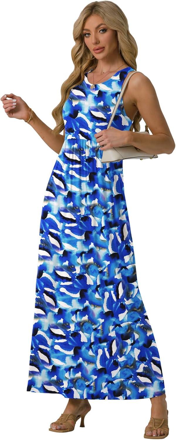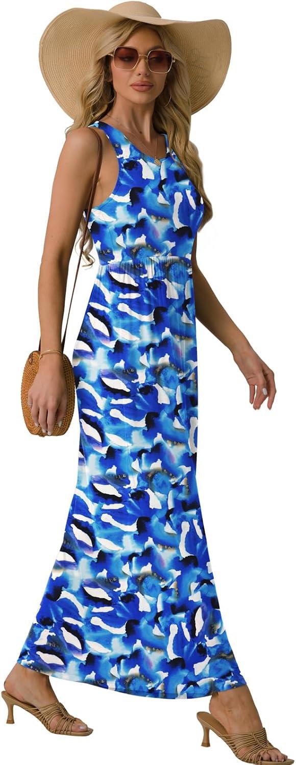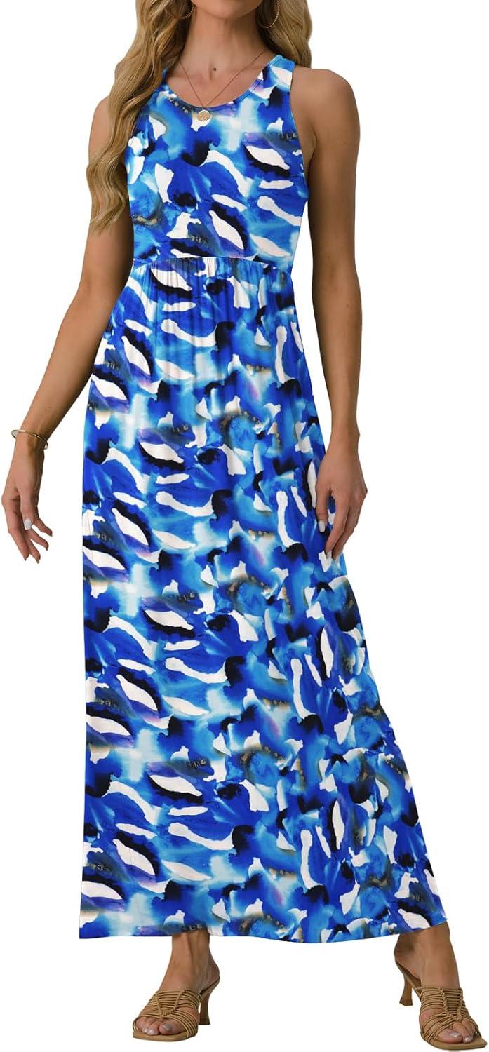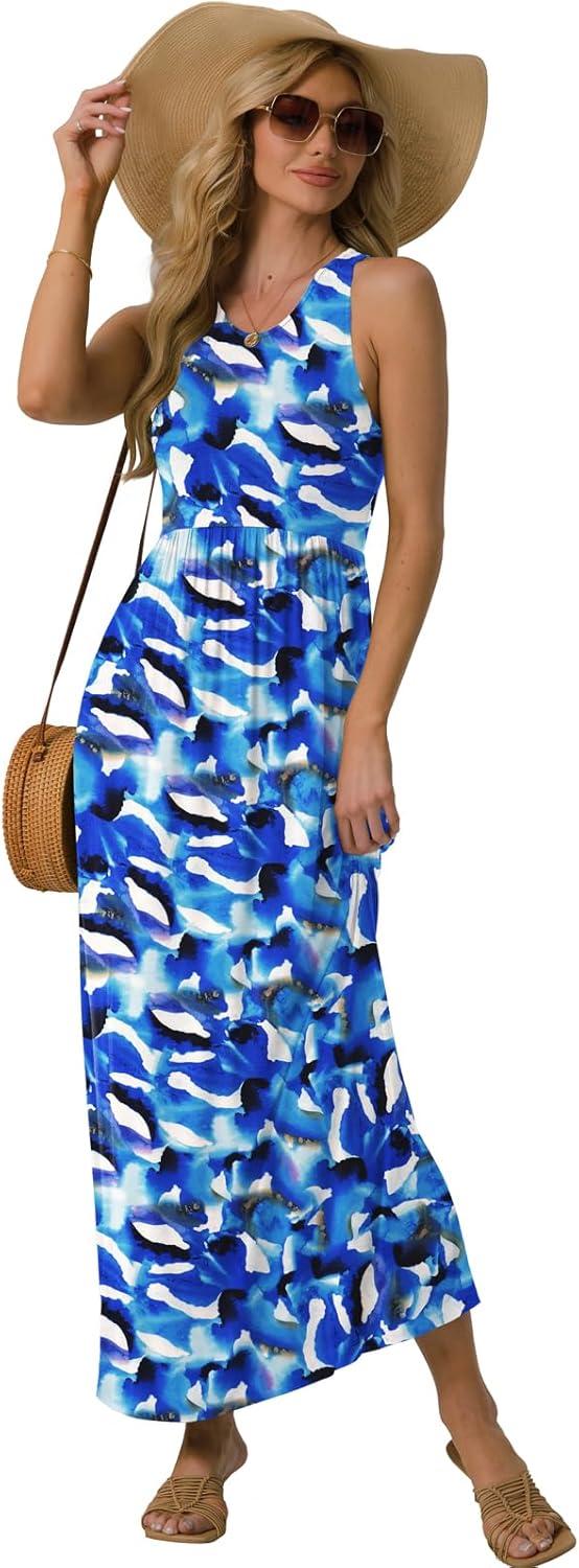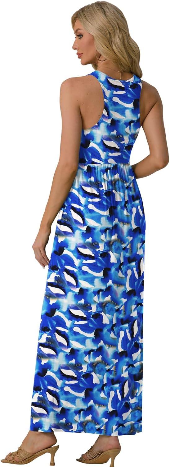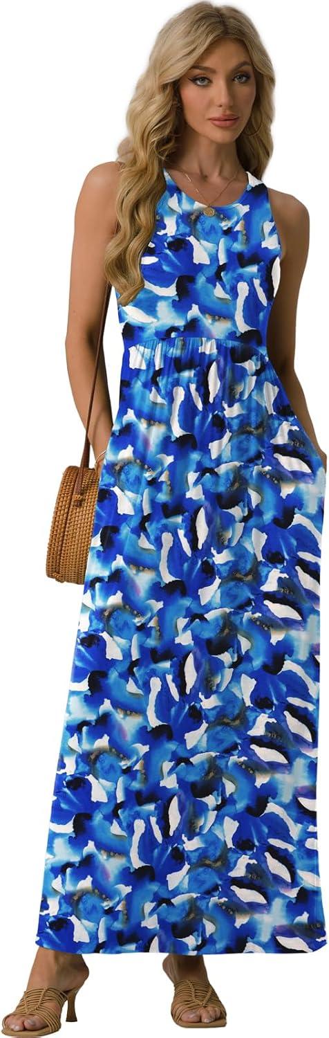 GRECERELLE Women’s Summer Sleeveless Casual Long Tank Maxi Dress with Pockets (XS-3XL)(Floral Blue Ink White)