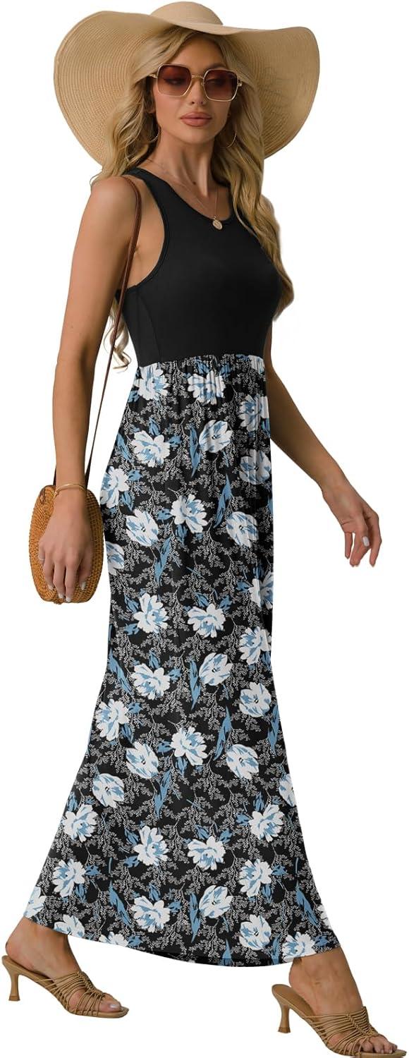 GRECERELLE Women’s Summer Sleeveless Casual Long Tank Maxi Dress with Pockets (XS-3XL)(Floral White Pink Rose)