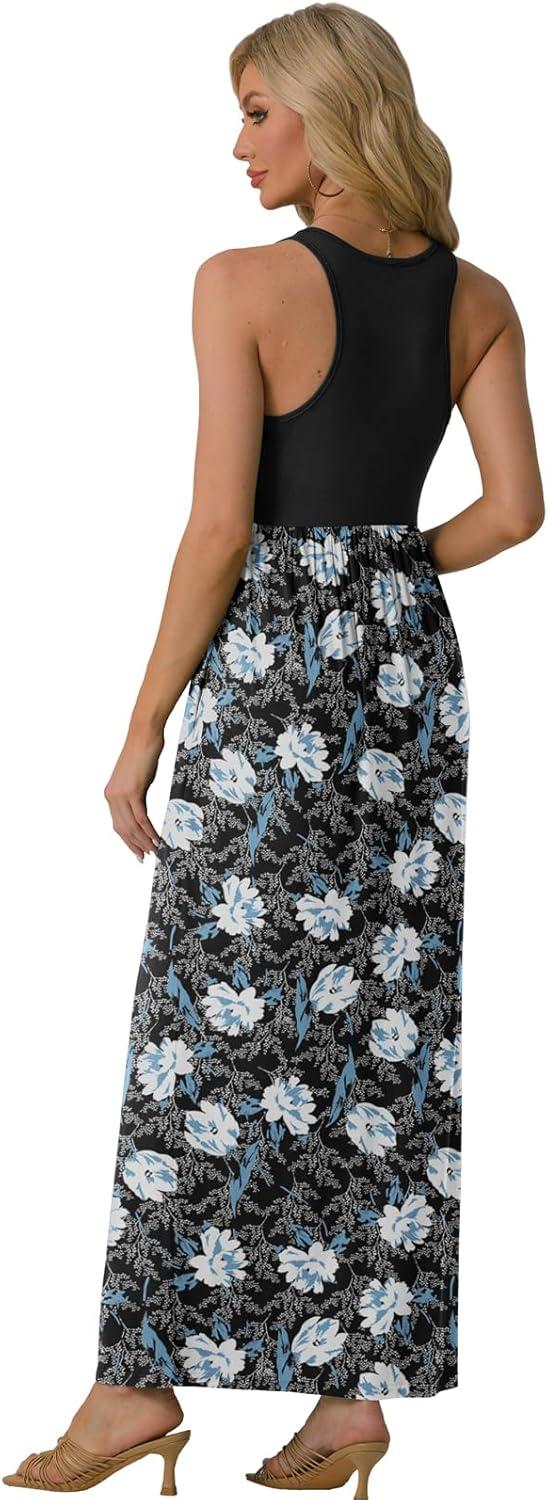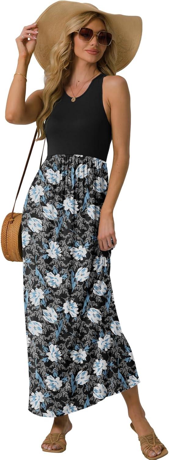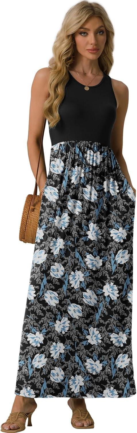 GRECERELLE Women’s Summer Sleeveless Casual Long Tank Maxi Dress with Pockets (XS-3XL)(Floral White Ink Red)