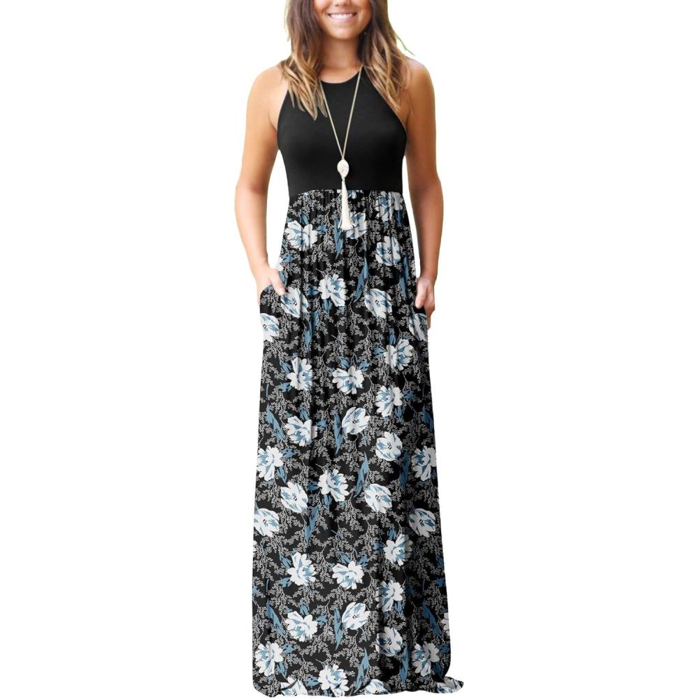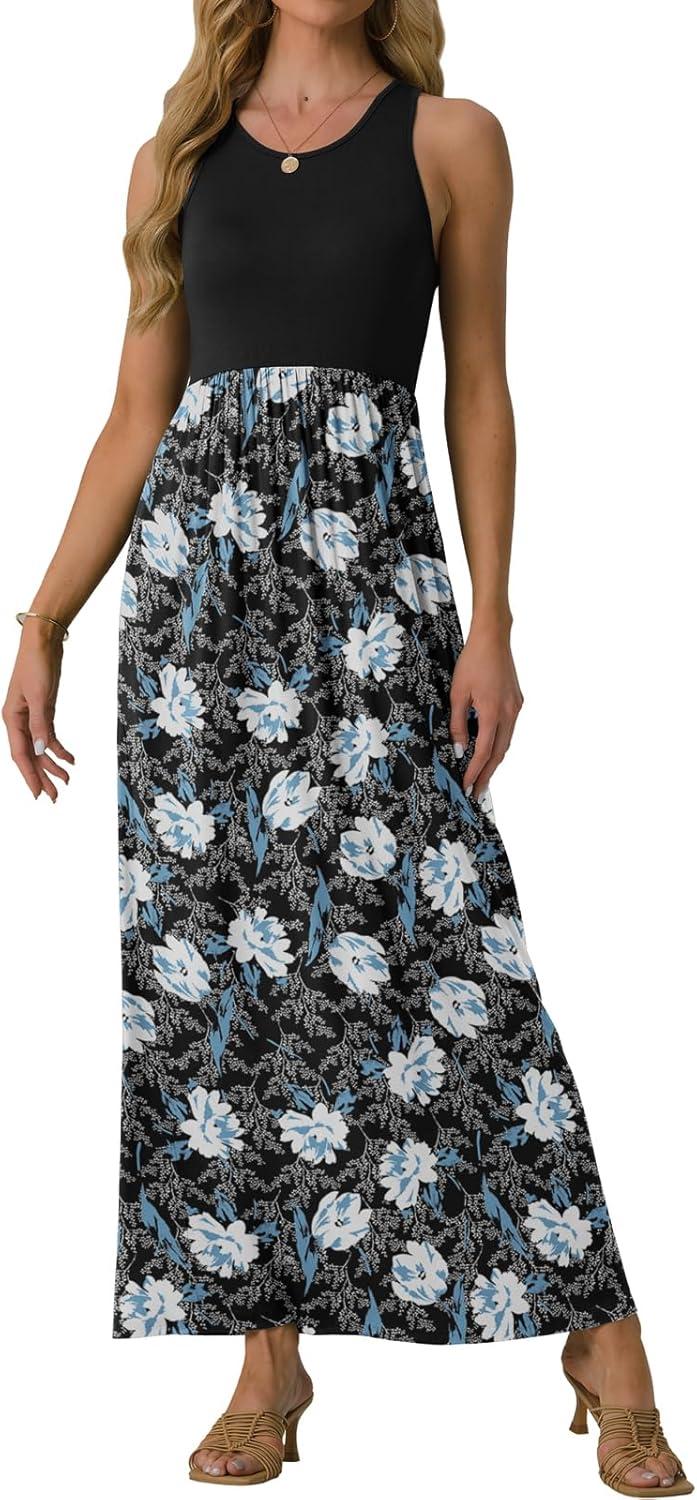 GRECERELLE Women's Summer Sleeveless Casual Long Tank Maxi Dress with Pockets (XS-3XL)(Floral White Lily)