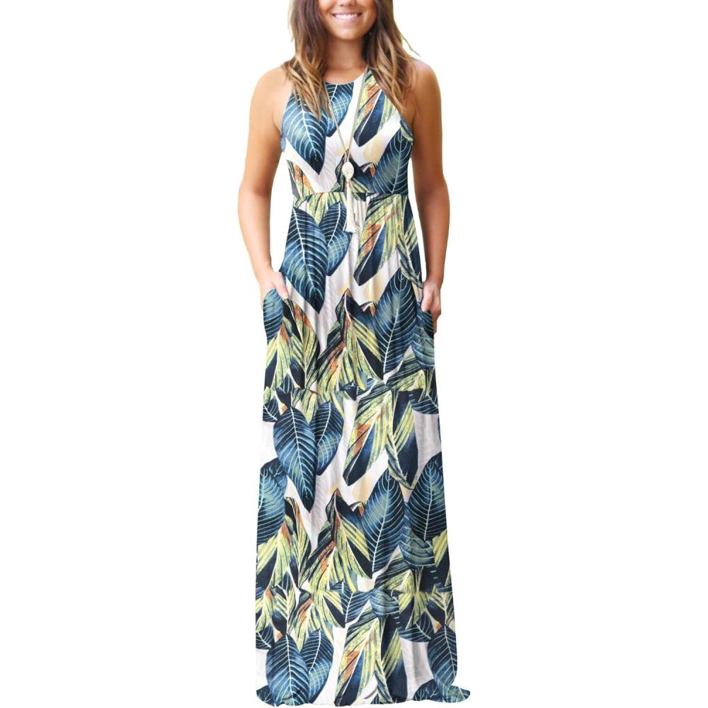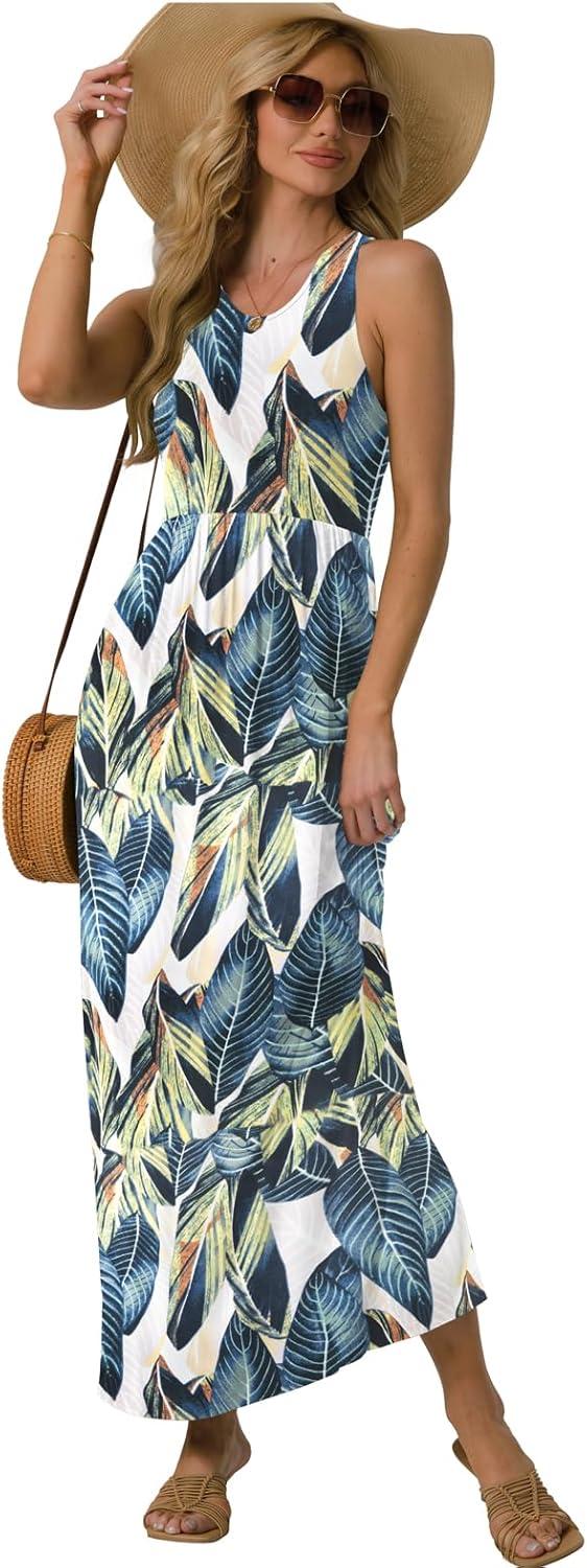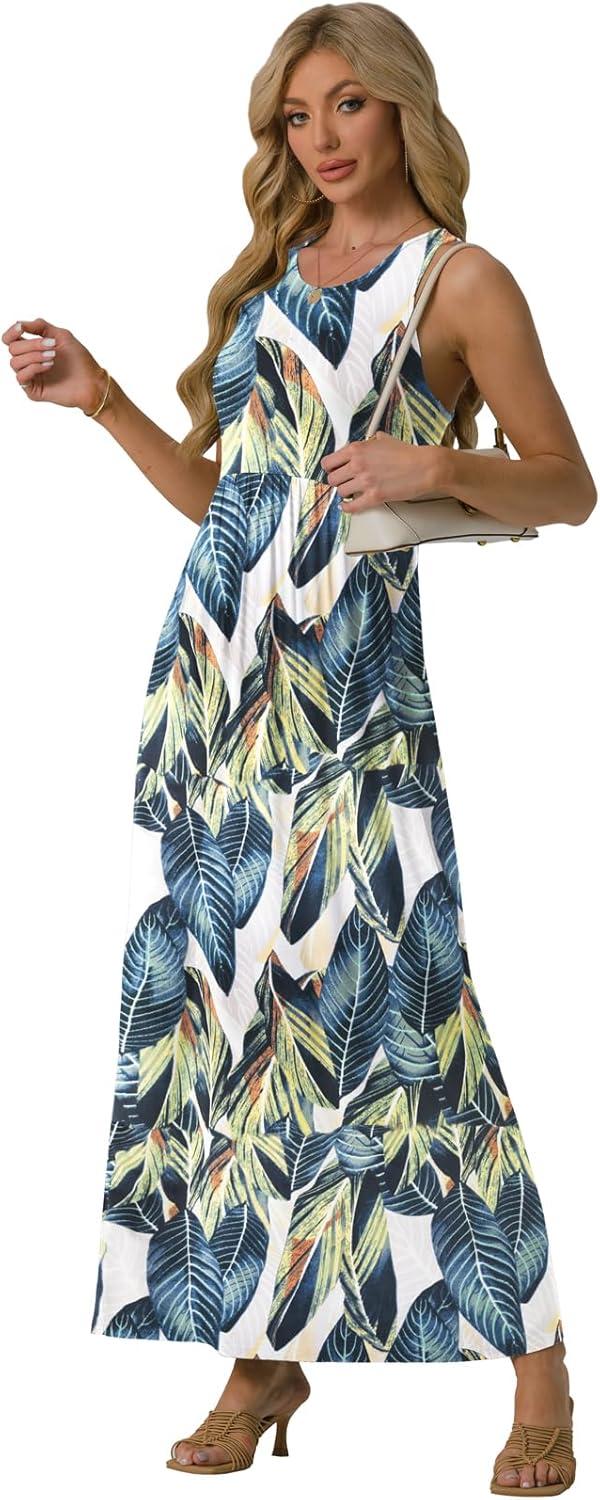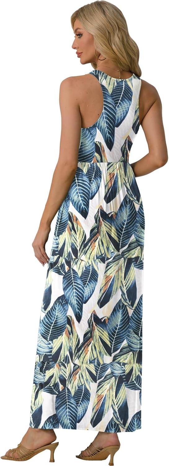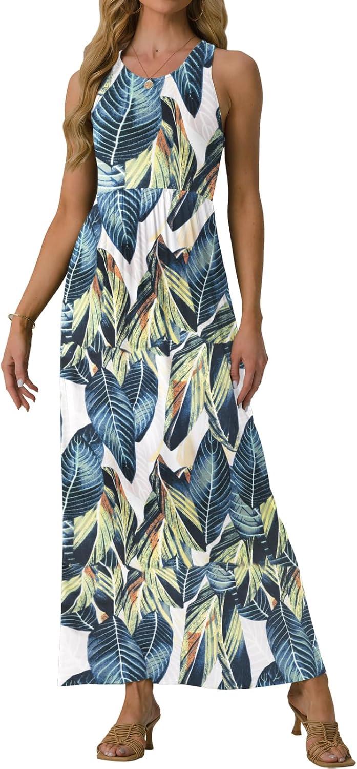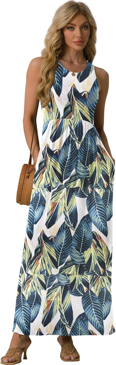 GRECERELLE Women’s Summer Sleeveless Casual Long Tank Maxi Dress with Pockets (XS-3XL)(Floral White Ink Blue)