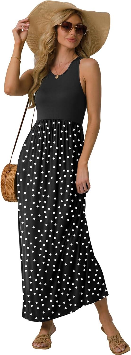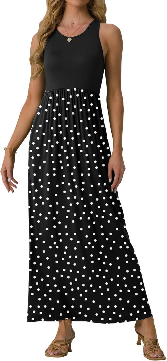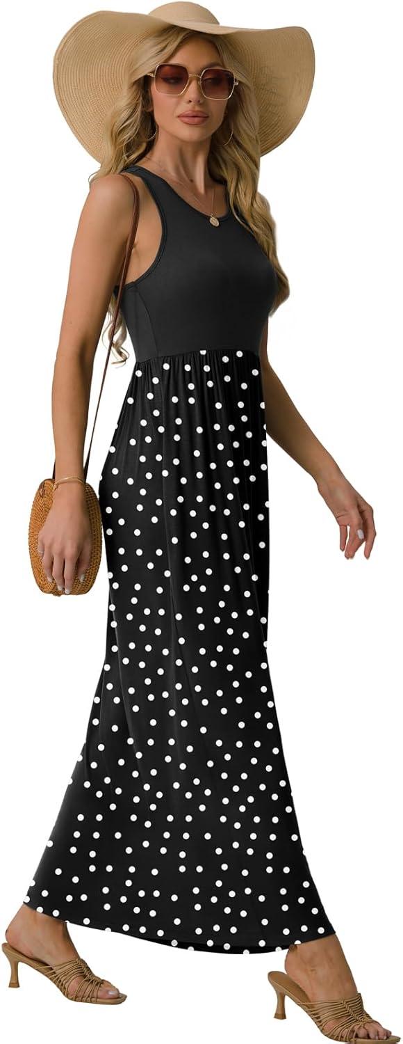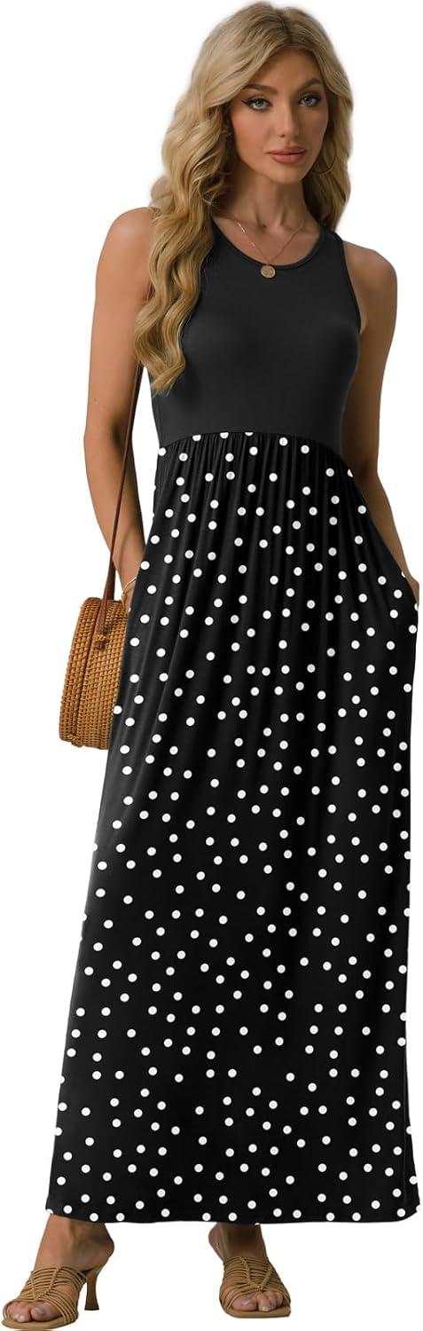 GRECERELLE Women’s Summer Sleeveless Casual Long Tank Maxi Dress with Pockets (XS-3XL)(Polka Dot White Black)