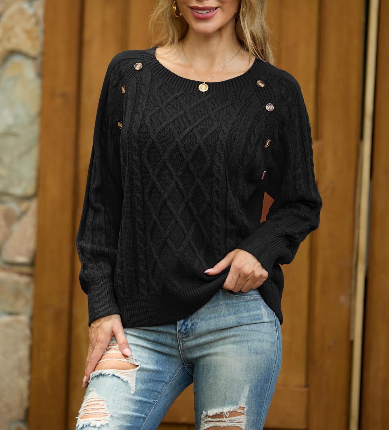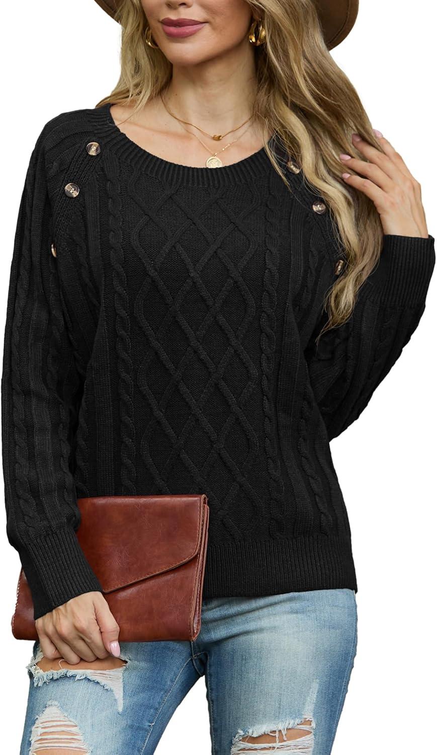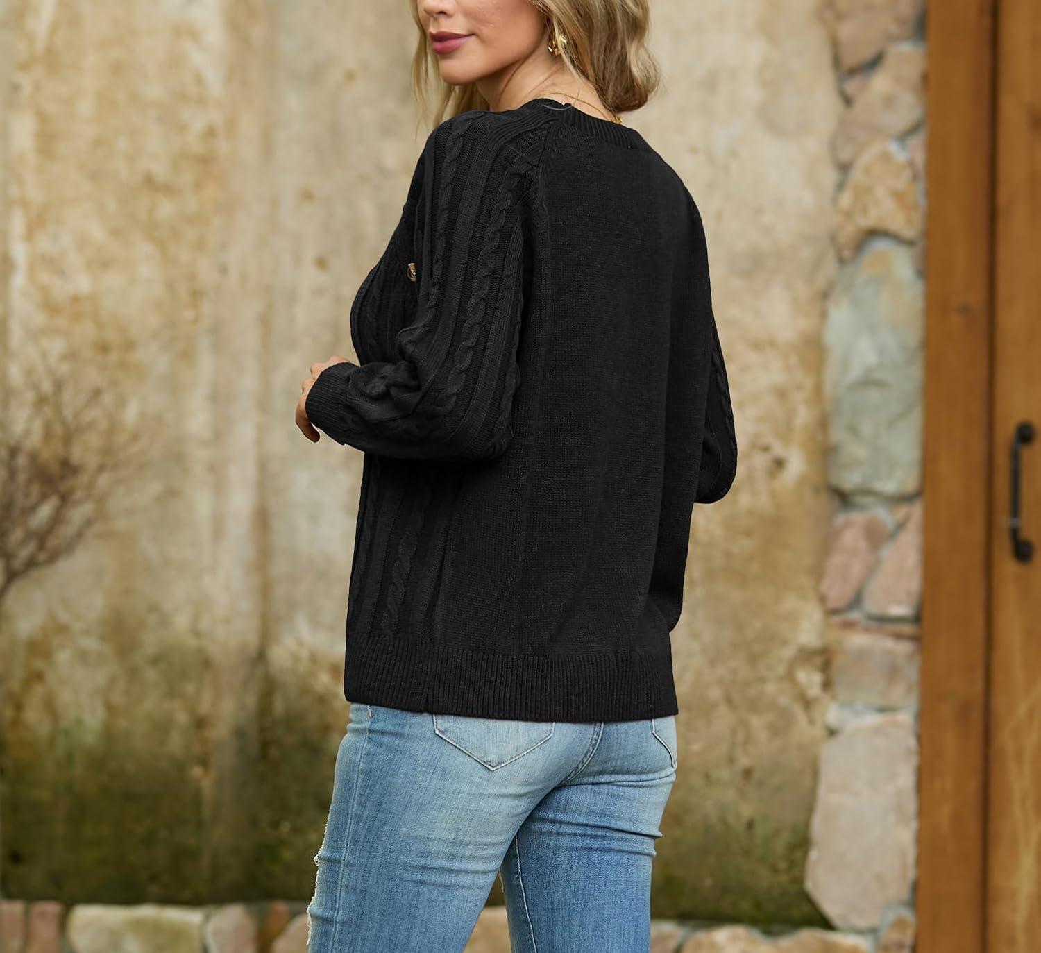 GRECERELLE Women’s Sweaters Crewneck Bishop Long Sleeve Fall Oversized Knit Button Jumper Tops(Black)
