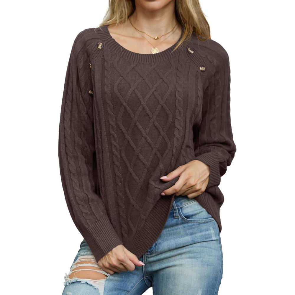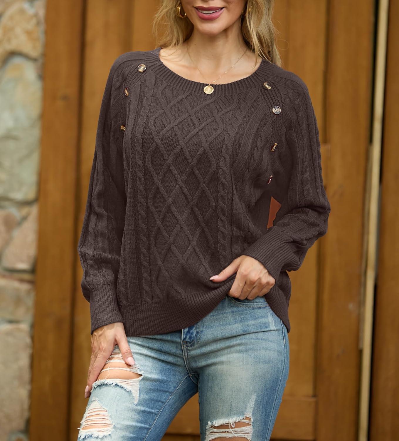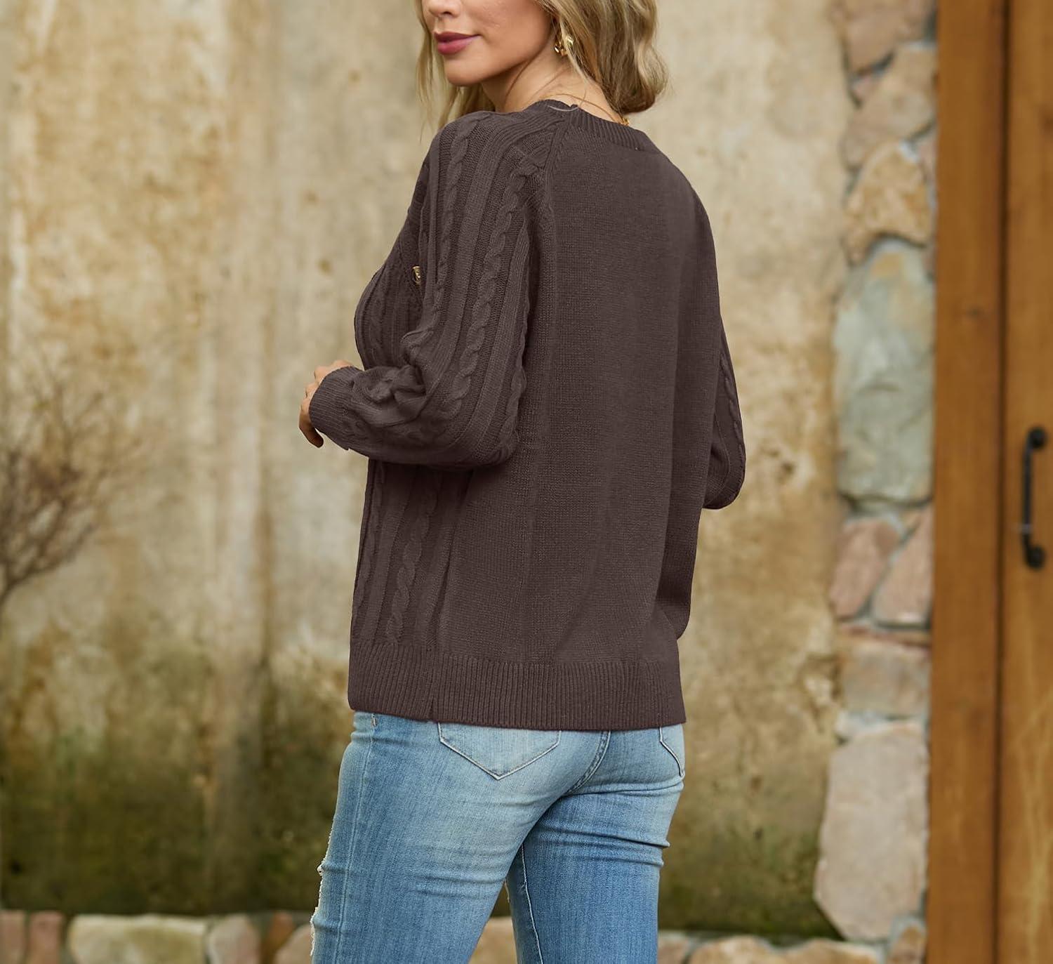 GRECERELLE Women's Sweaters Crewneck Bishop Long Sleeve Fall Oversized Knit Button Jumper Tops(Brown)