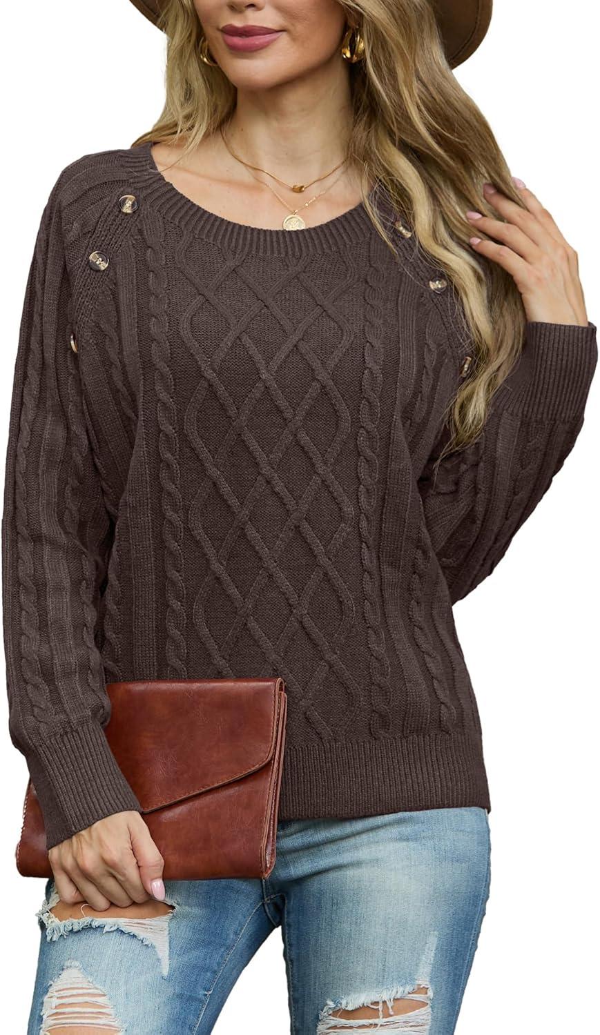 GRECERELLE Women’s Sweaters Crewneck Bishop Long Sleeve Fall Oversized Knit Button Jumper Tops(Brown)