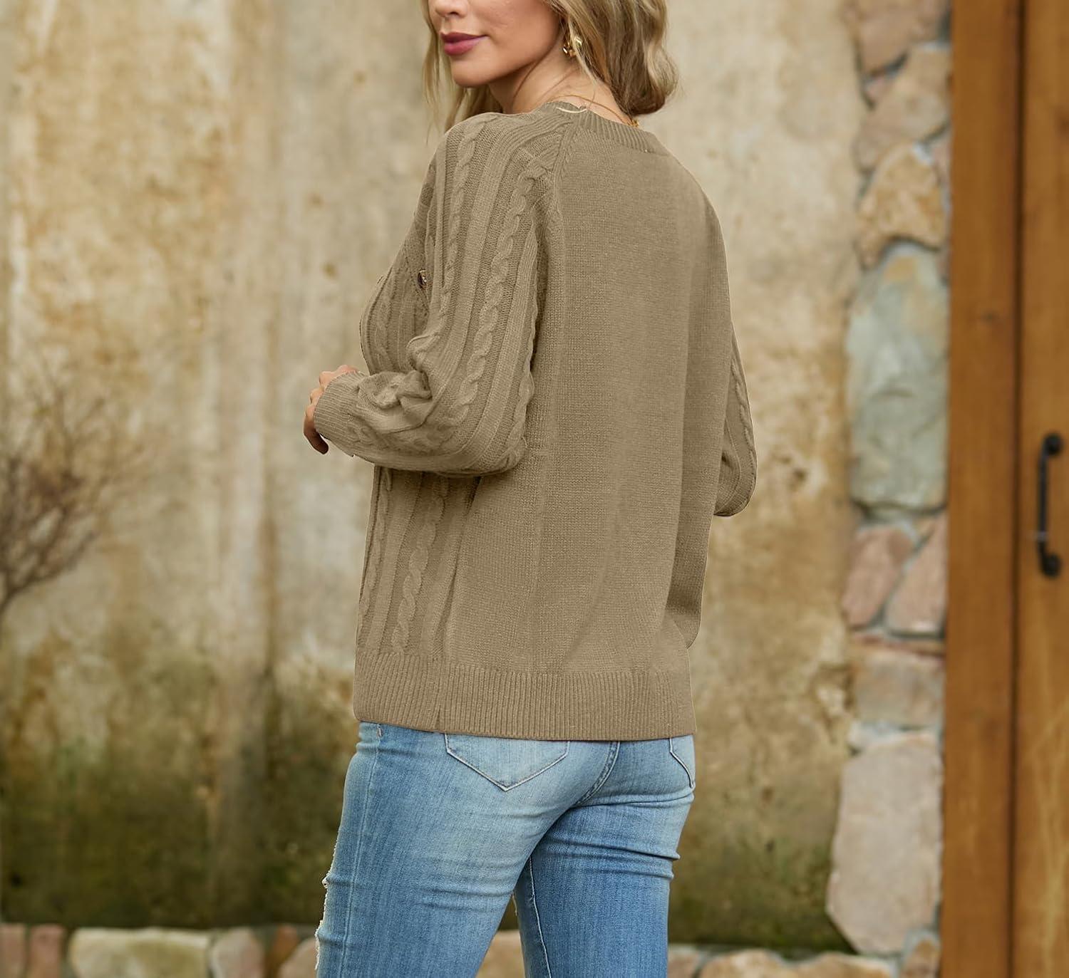 GRECERELLE Women's Sweaters Crewneck Bishop Long Sleeve Fall Oversized Knit Button Jumper Tops(Khaki)