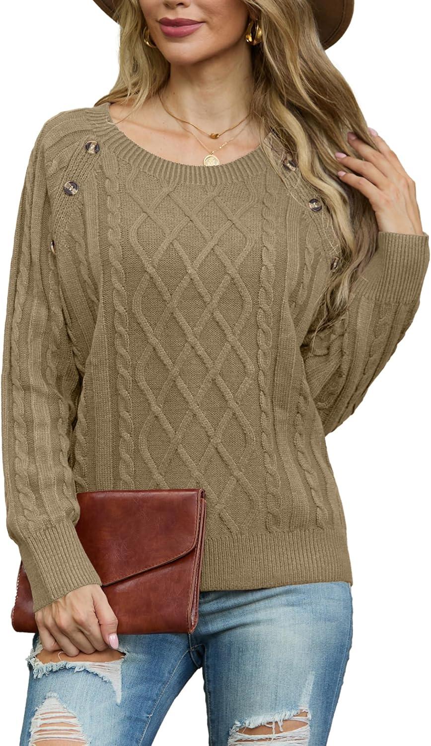 GRECERELLE Women’s Sweaters Crewneck Bishop Long Sleeve Fall Oversized Knit Button Jumper Tops(Khaki)