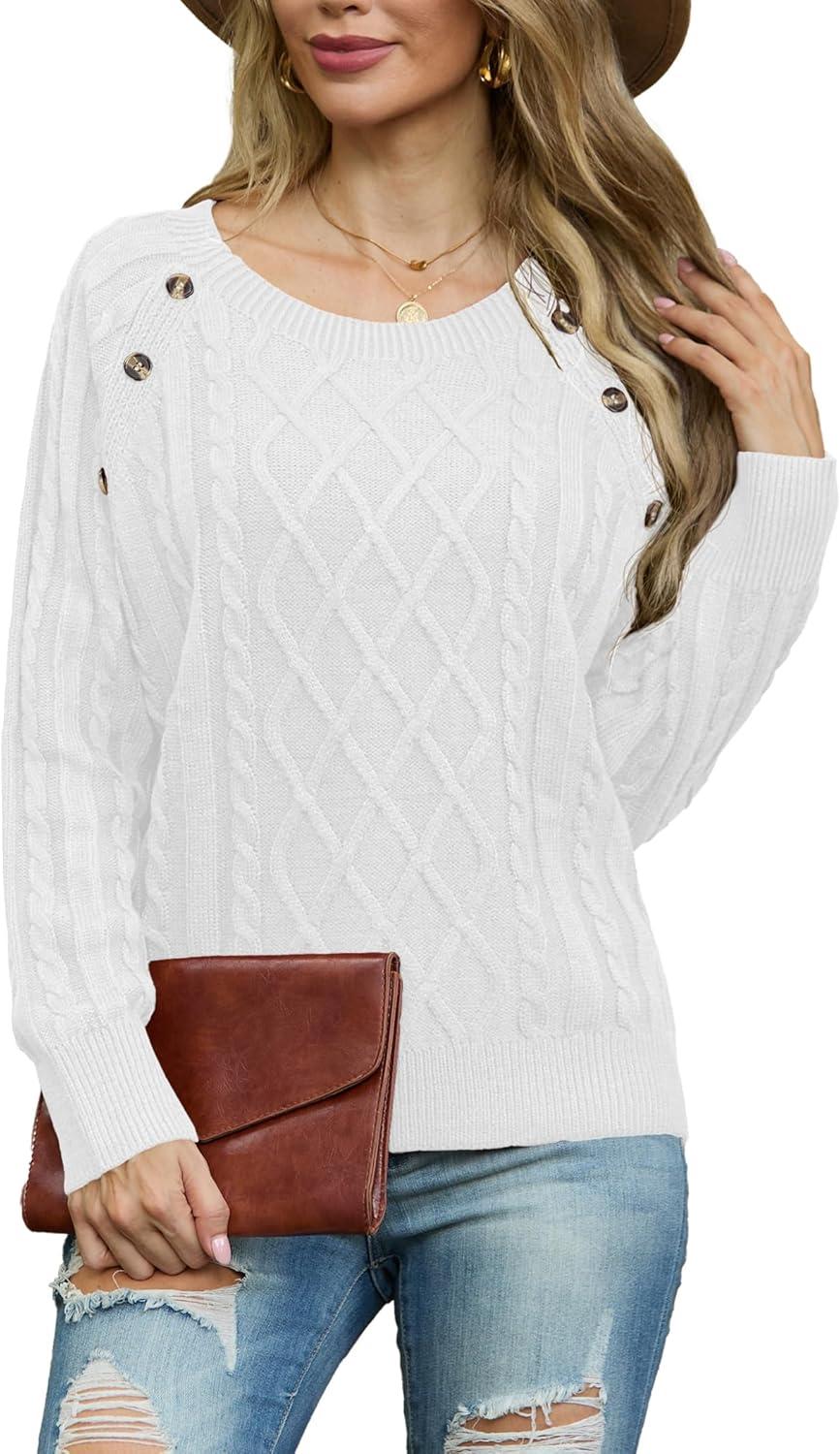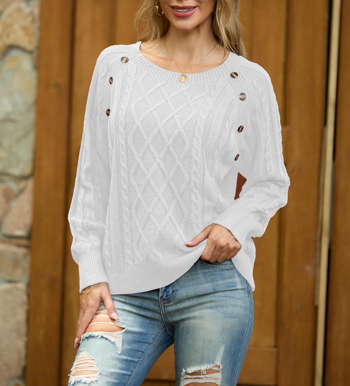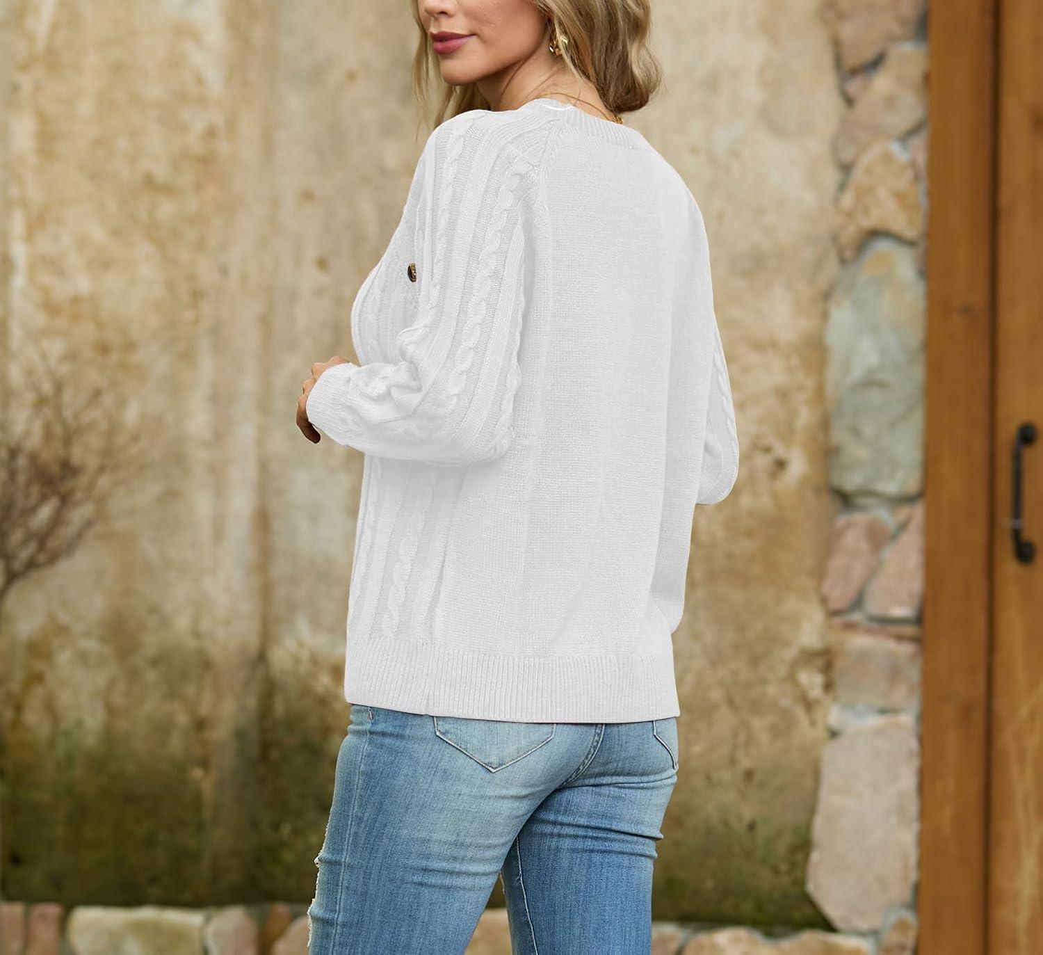 GRECERELLE Women's Sweaters Crewneck Bishop Long Sleeve Fall Oversized Knit Button Jumper Tops(White)