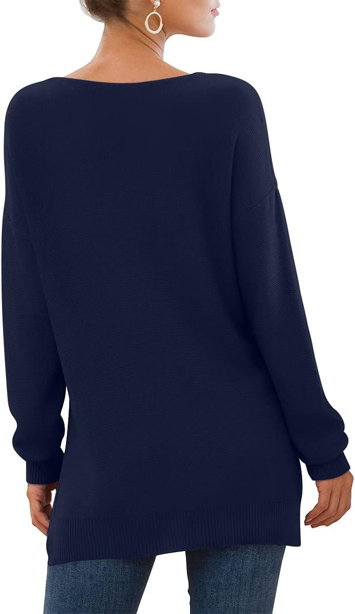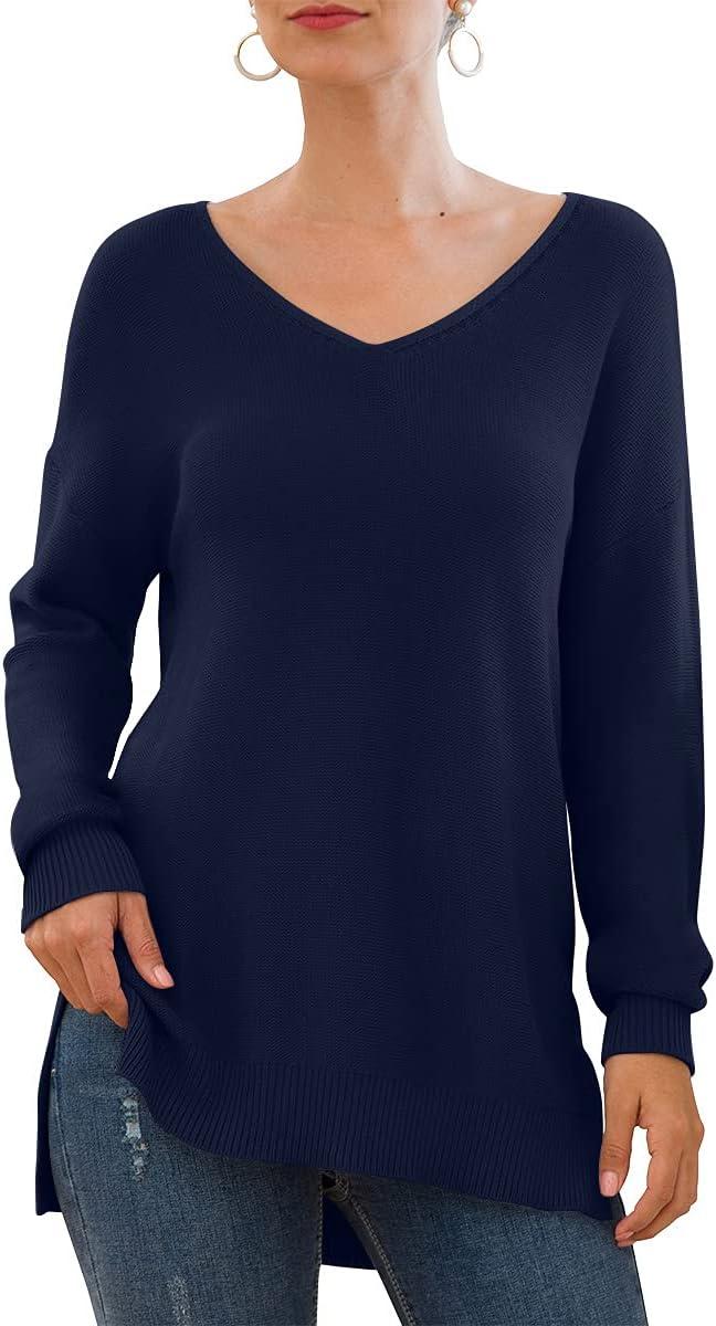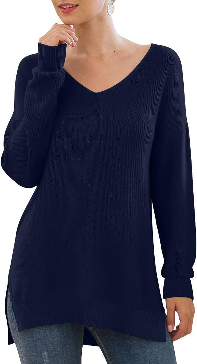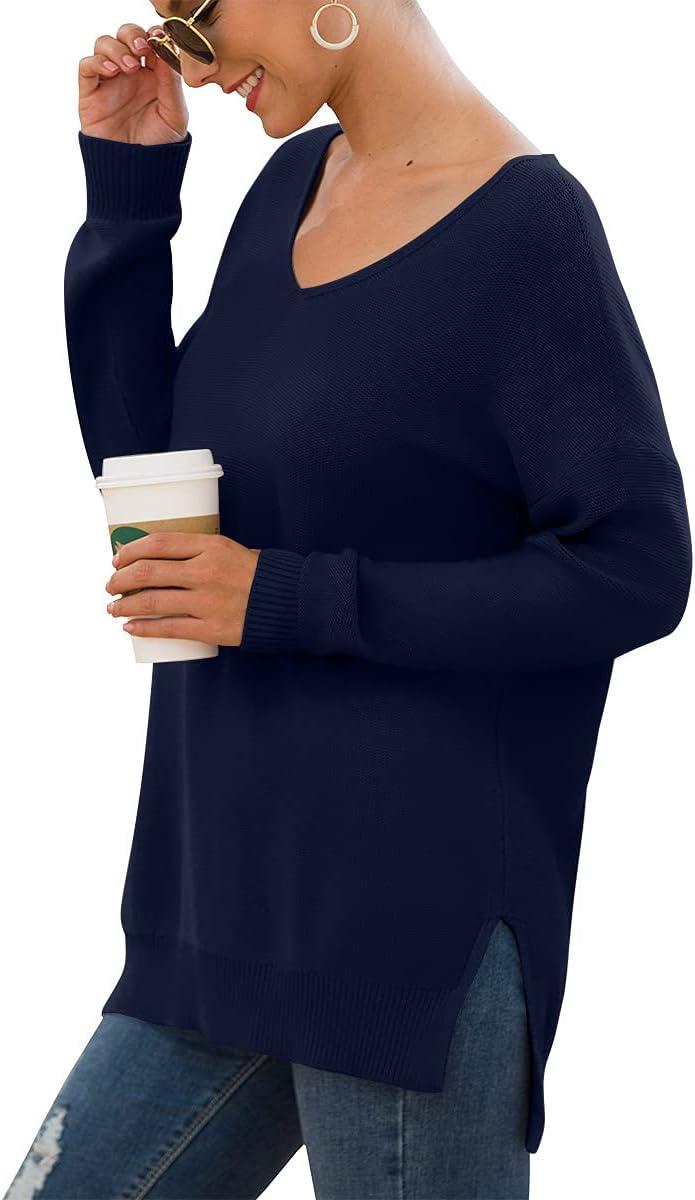 GRECERELLE Women's V-Neck Long Sleeve Side Split Loose Casual Knit Pullover Sweater Blouse(05 Navy Blue)