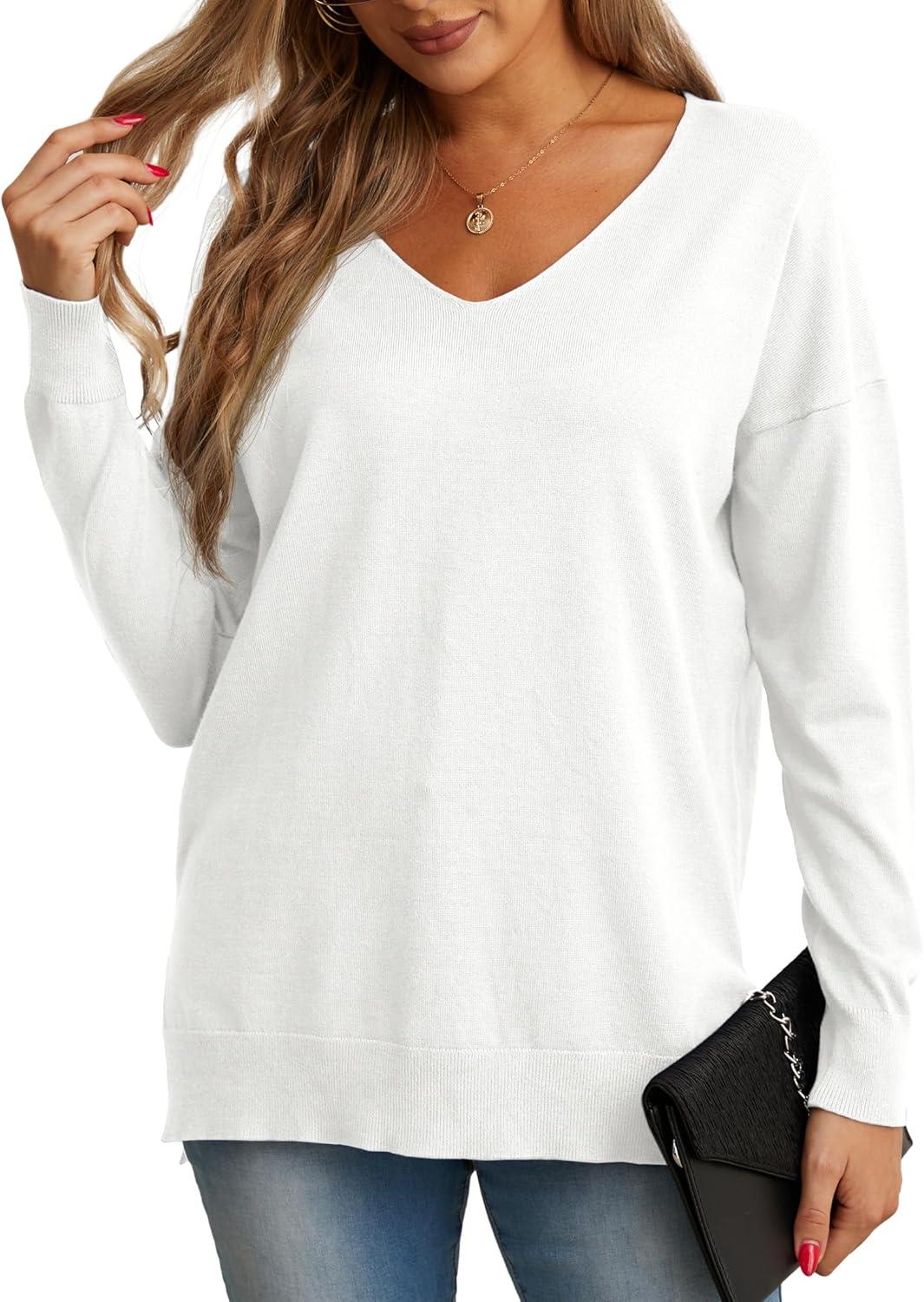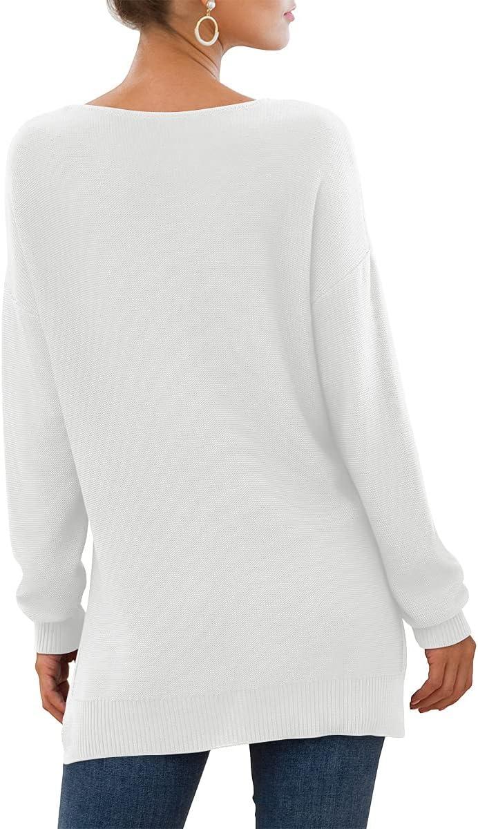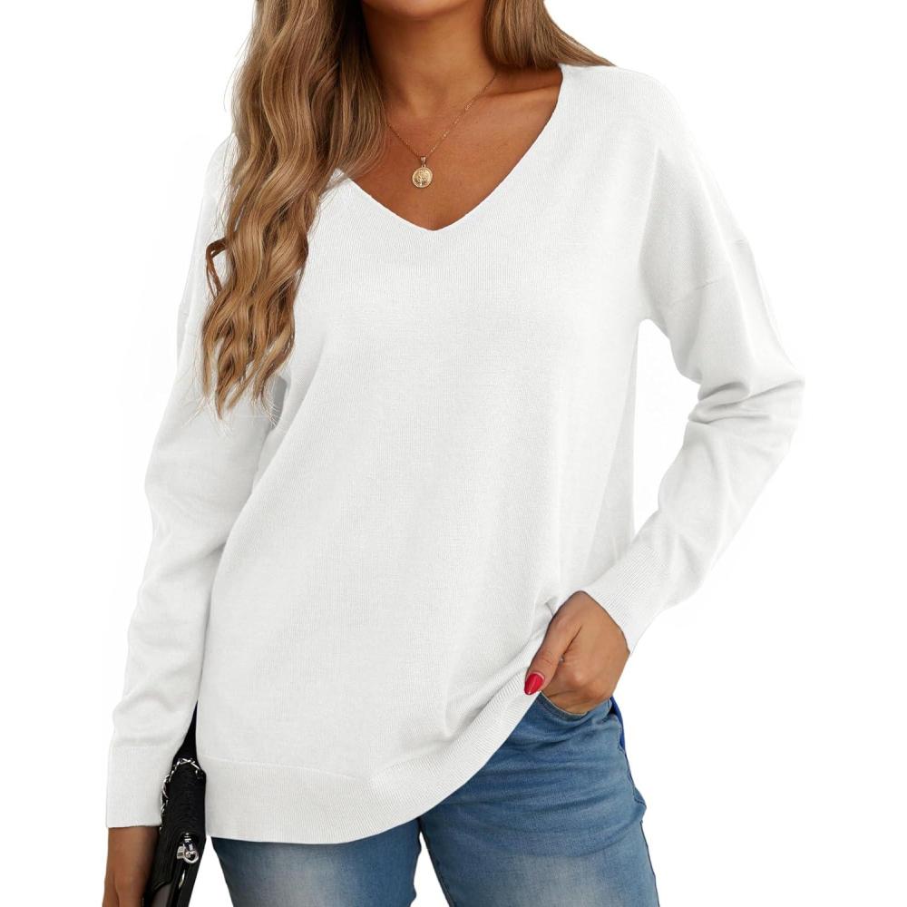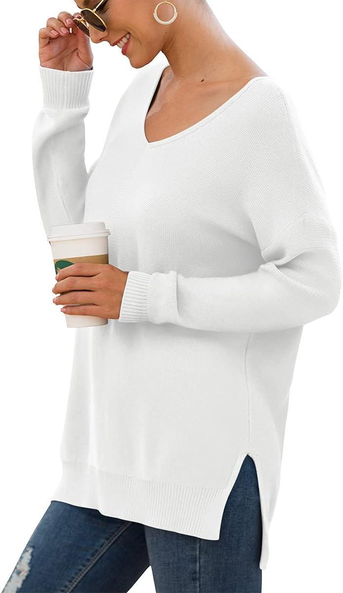 GRECERELLE Women’s V-Neck Long Sleeve Side Split Loose Casual Knit Pullover Sweater Blouse(07 White)