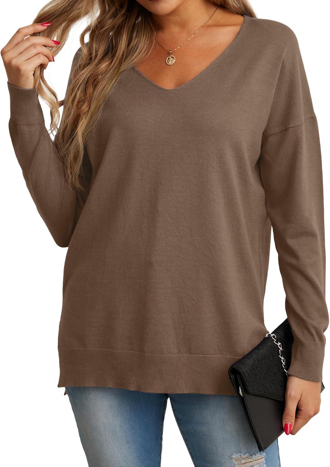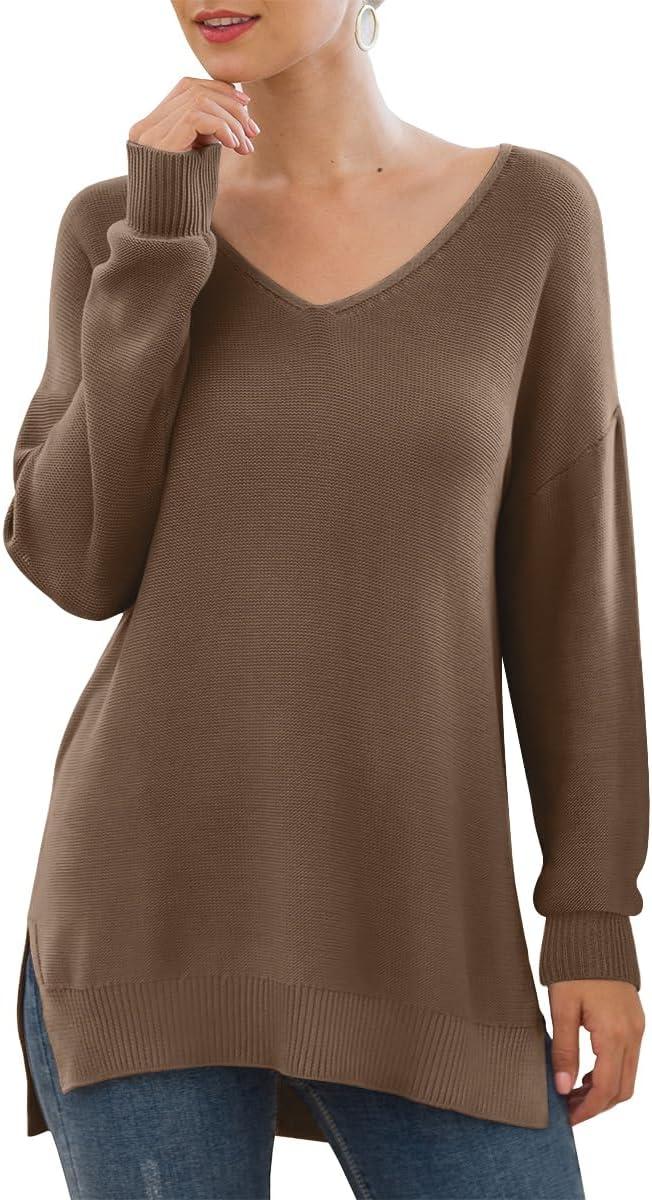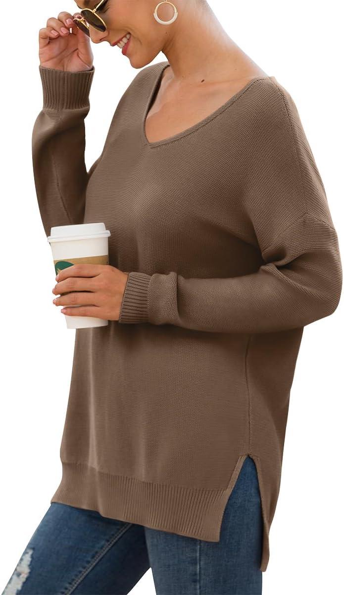 GRECERELLE Women’s V-Neck Long Sleeve Side Split Loose Casual Knit Pullover Sweater Blouse(Chocolate Brown)
