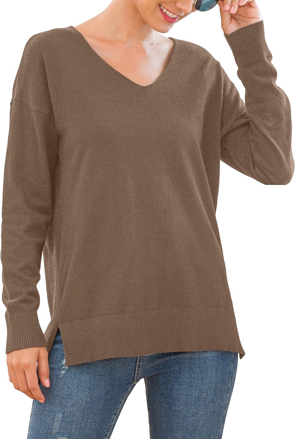 GRECERELLE Women's V-Neck Long Sleeve Side Split Loose Casual Knit Pullover Sweater Blouse