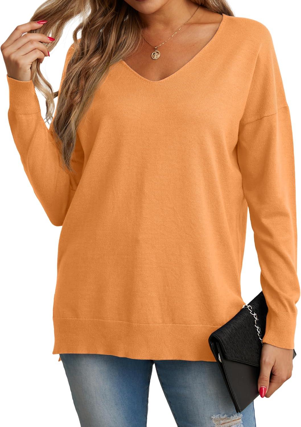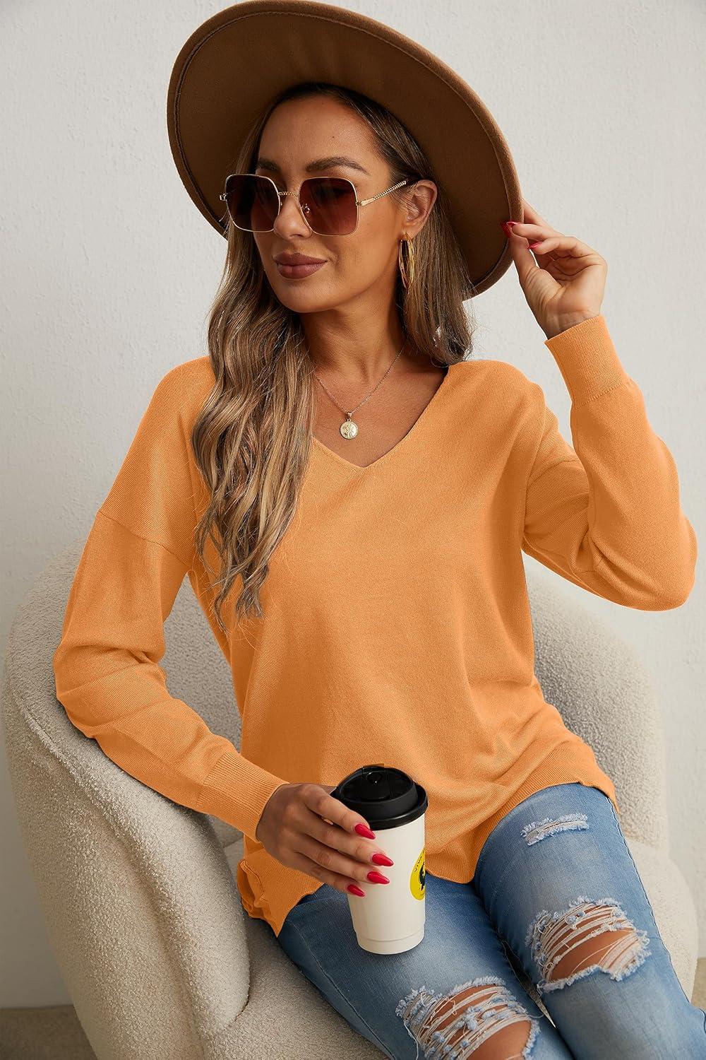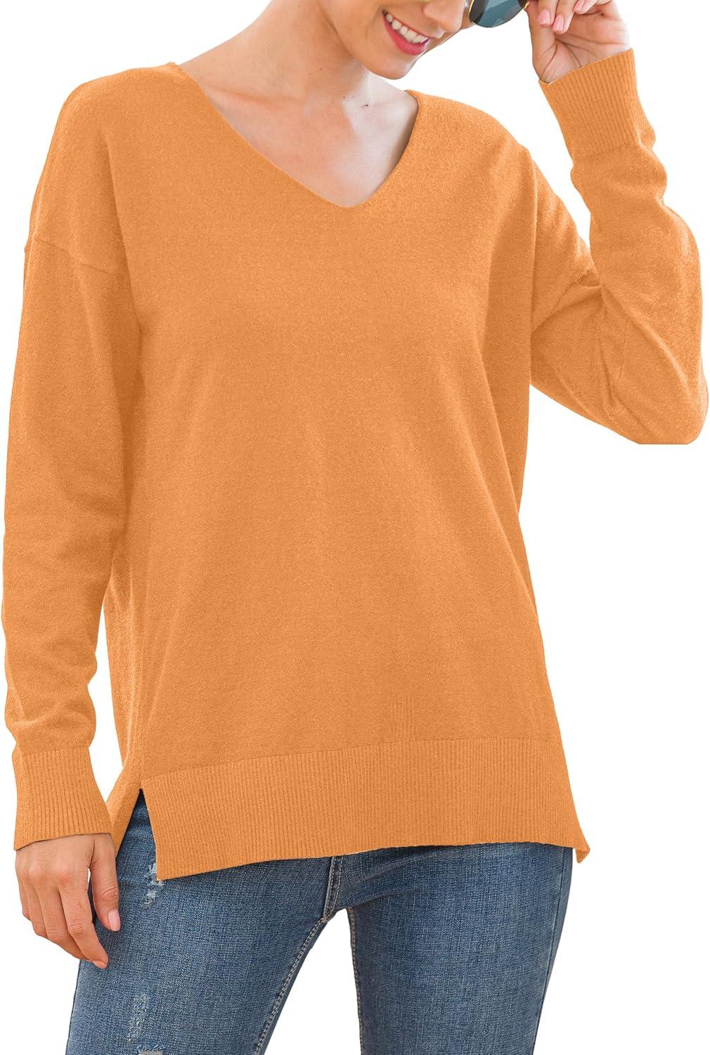 GRECERELLE Women’s V-Neck Long Sleeve Side Split Loose Casual Knit Pullover Sweater Blouse(Light Orange)