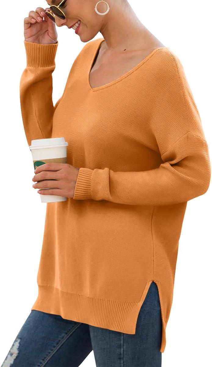 imageGRECERELLE Womens VNeck Long Sleeve Side Split Loose Casual Knit Pullover Sweater BlouseLight Orange