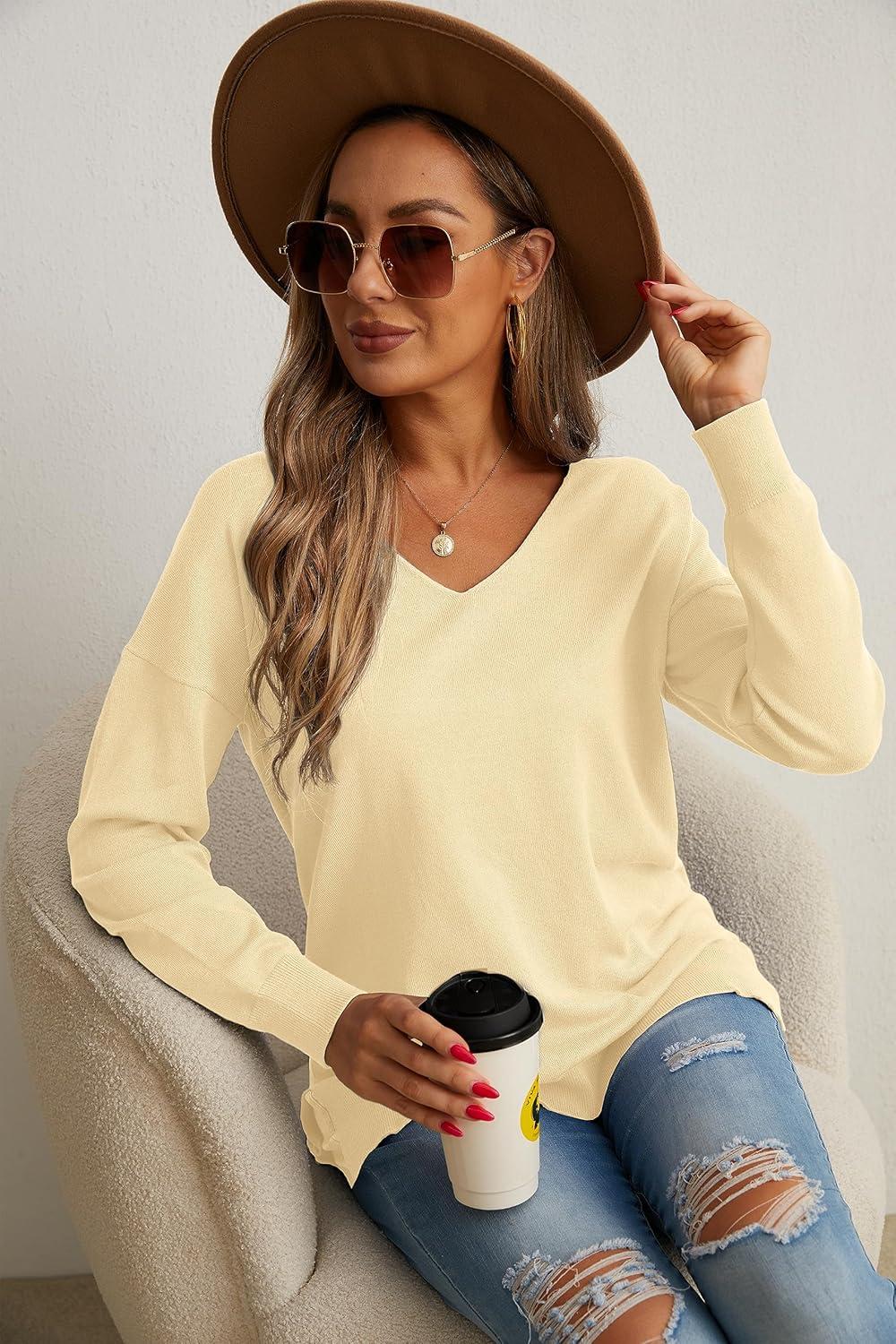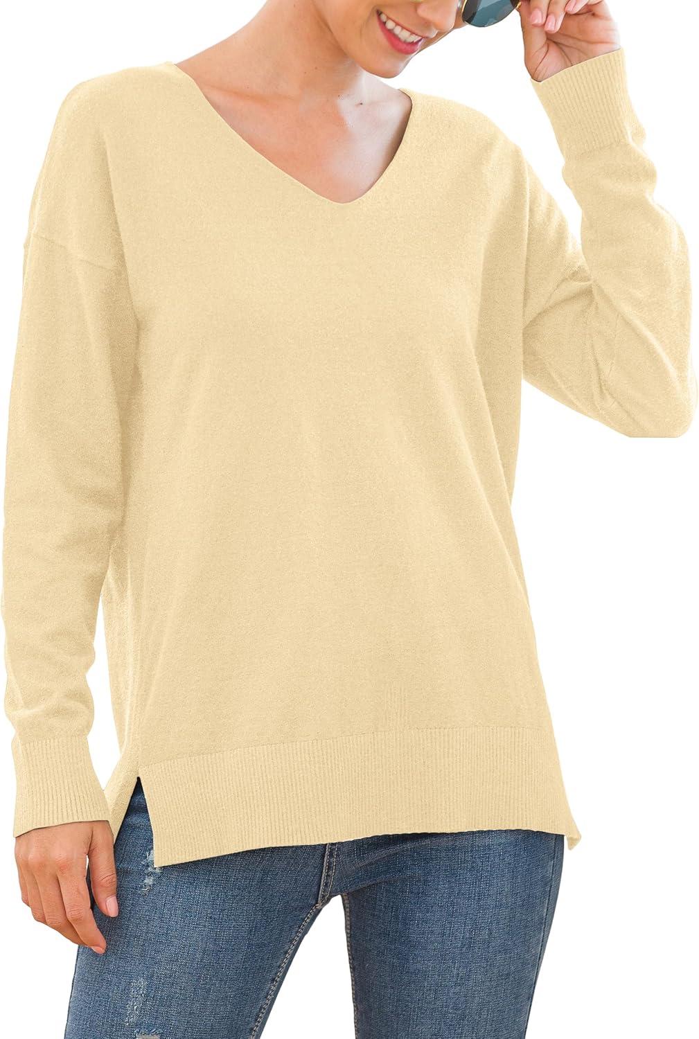 GRECERELLE Women’s V-Neck Long Sleeve Side Split Loose Casual Knit Pullover Sweater Blouse(Light Yellow)