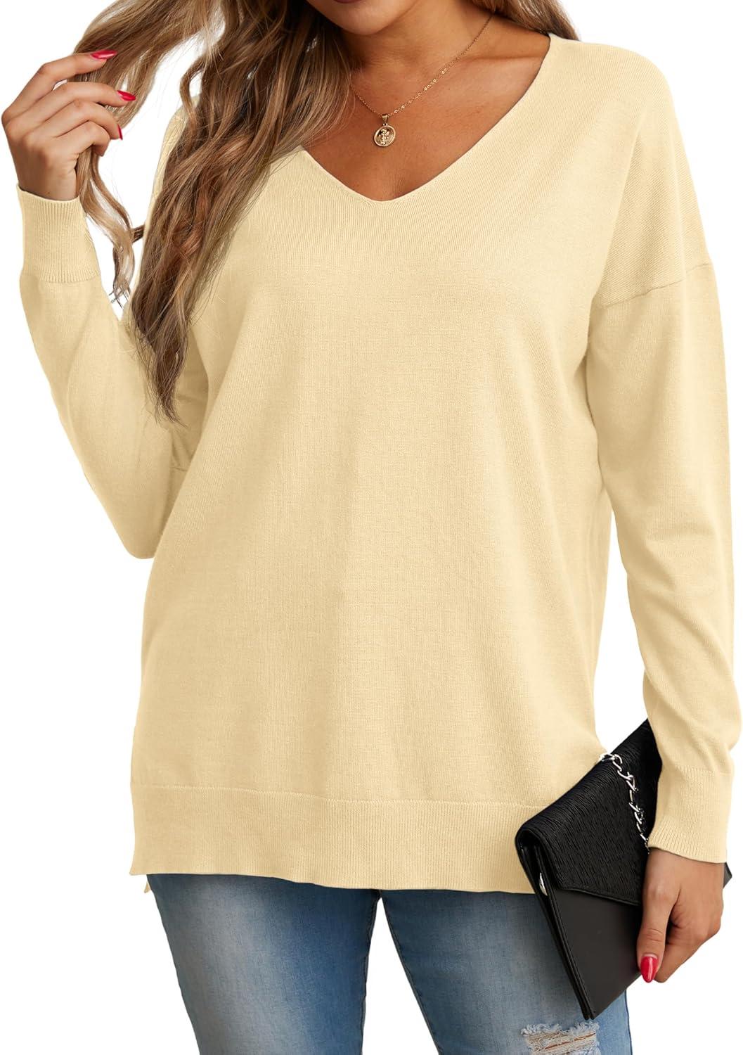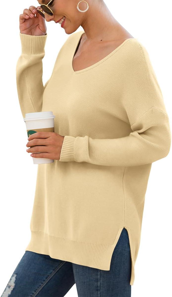GRECERELLE Women's V-Neck Long Sleeve Side Split Loose Casual Knit Pullover Sweater Blouse