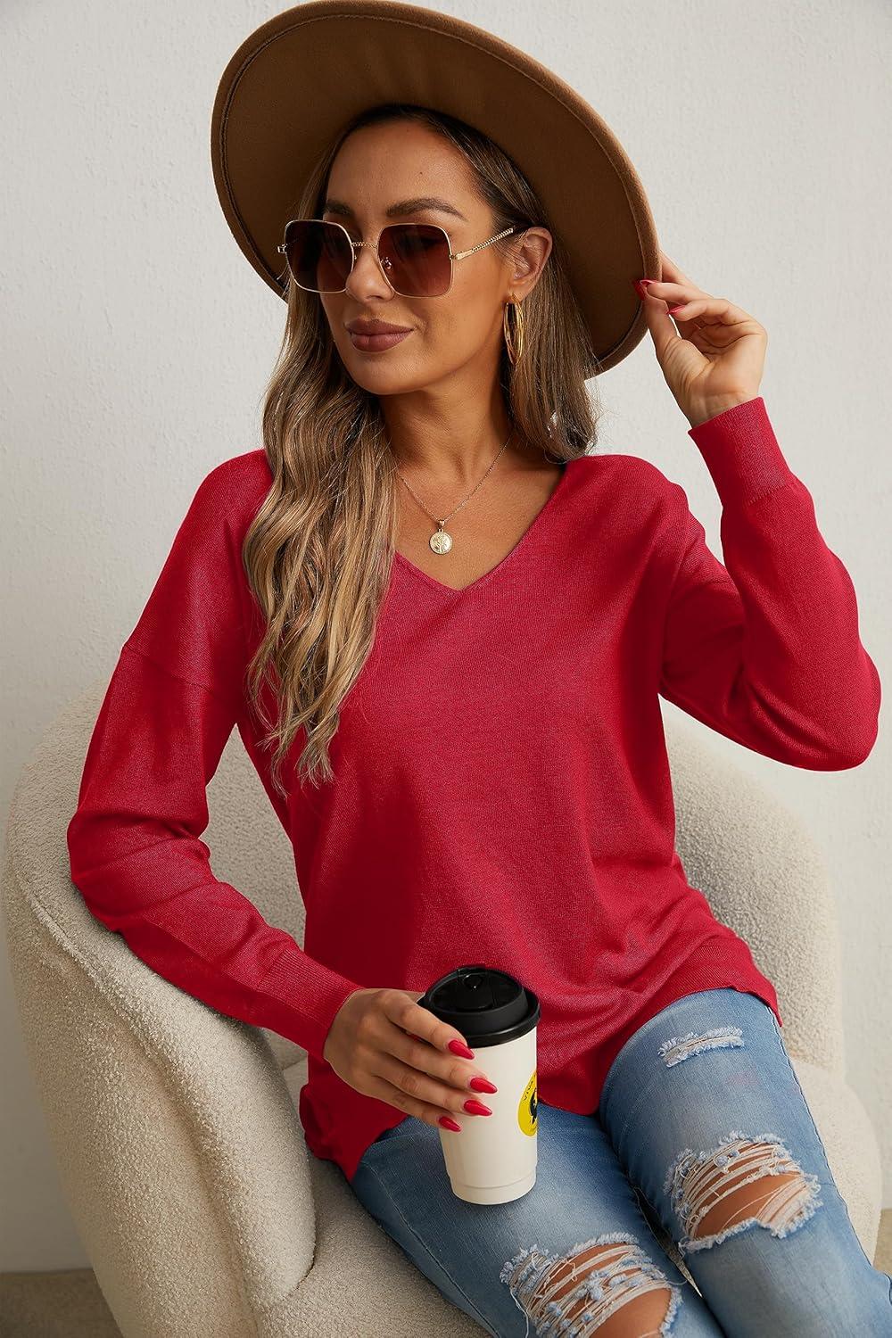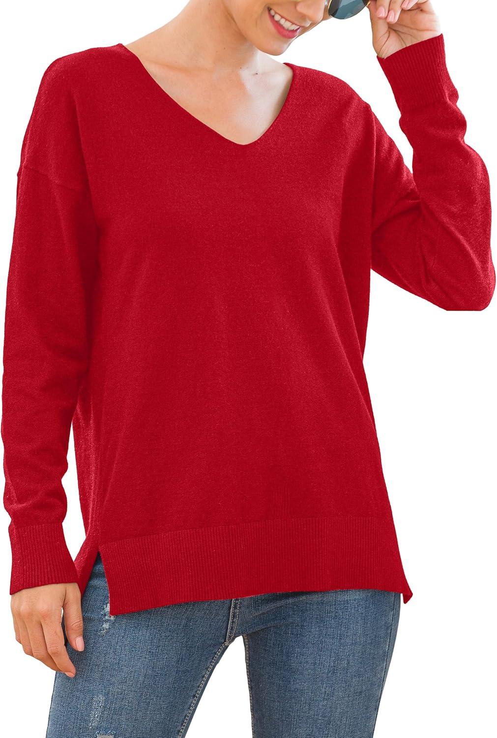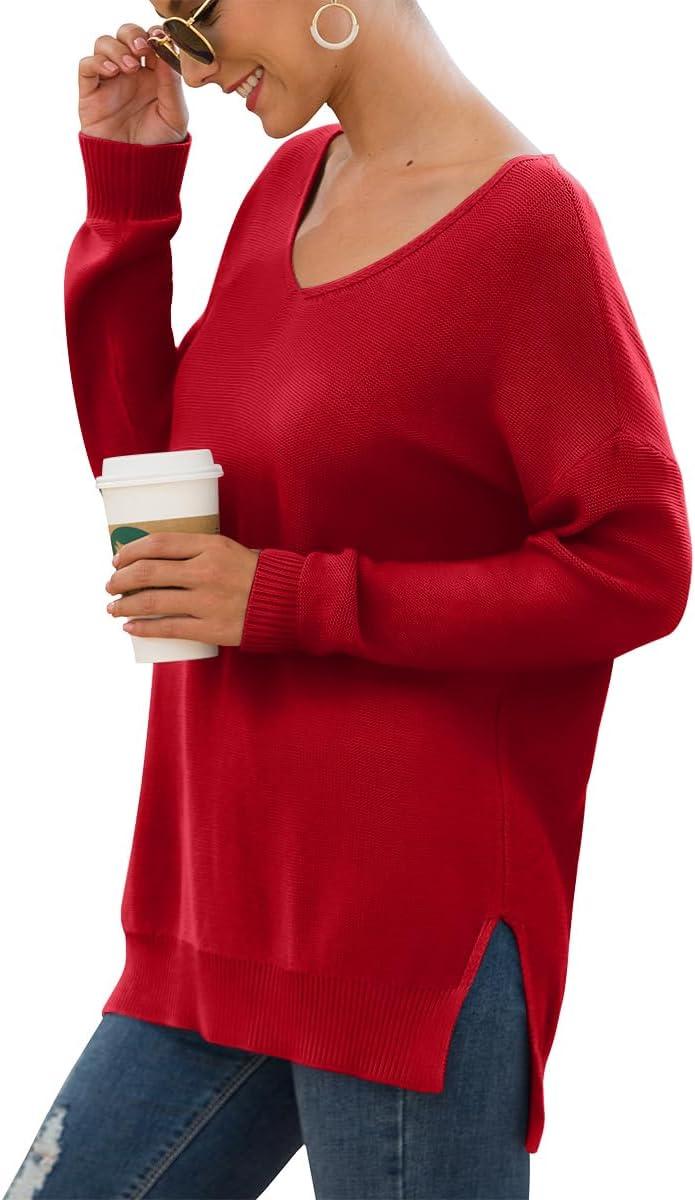 GRECERELLE Women’s V-Neck Long Sleeve Side Split Loose Casual Knit Pullover Sweater Blouse(Red)