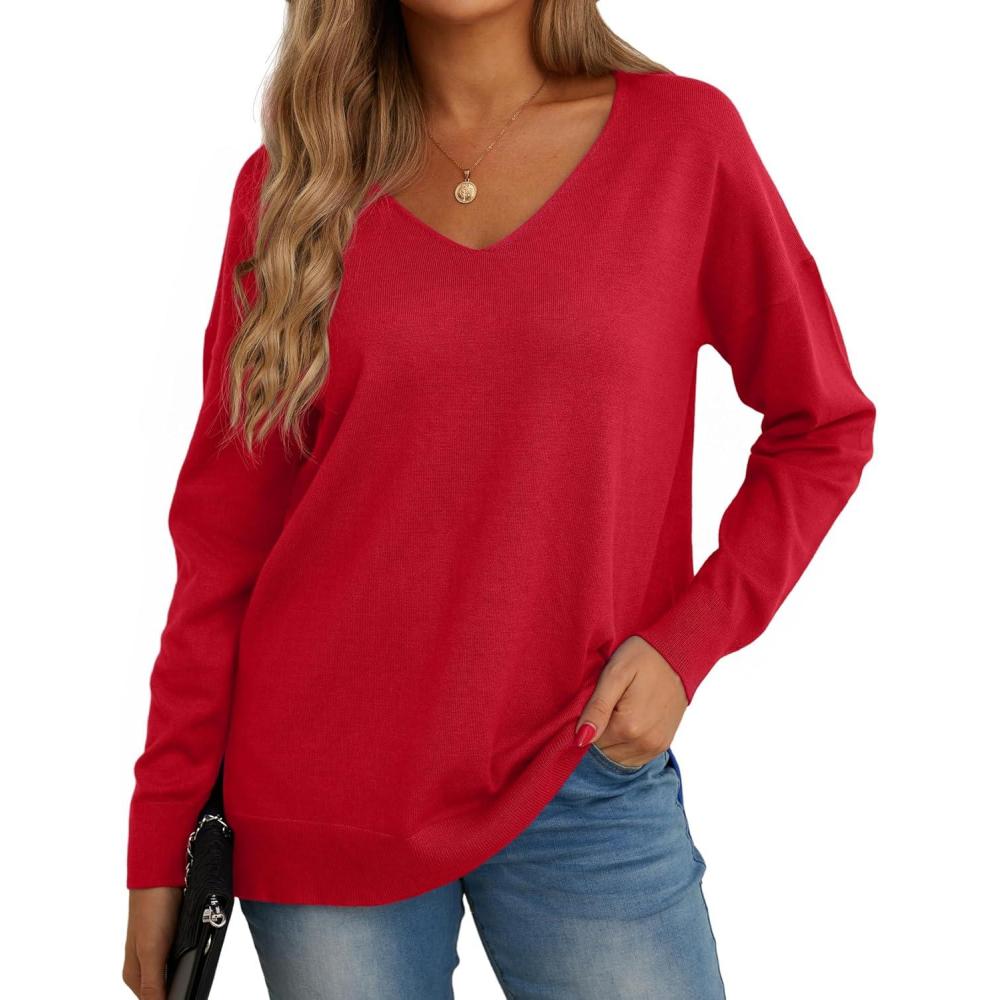 GRECERELLE Women's V-Neck Long Sleeve Side Split Loose Casual Knit Pullover Sweater Blouse(Red)