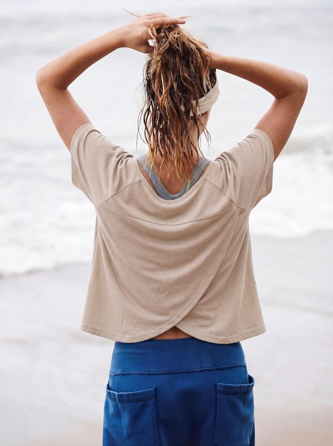 GRECERELLE Workout Tops for Women Short Sleeve Athletic Shirts Running Yoga Crop Gym Pilates Top Crossover Back Y2k(Beige)